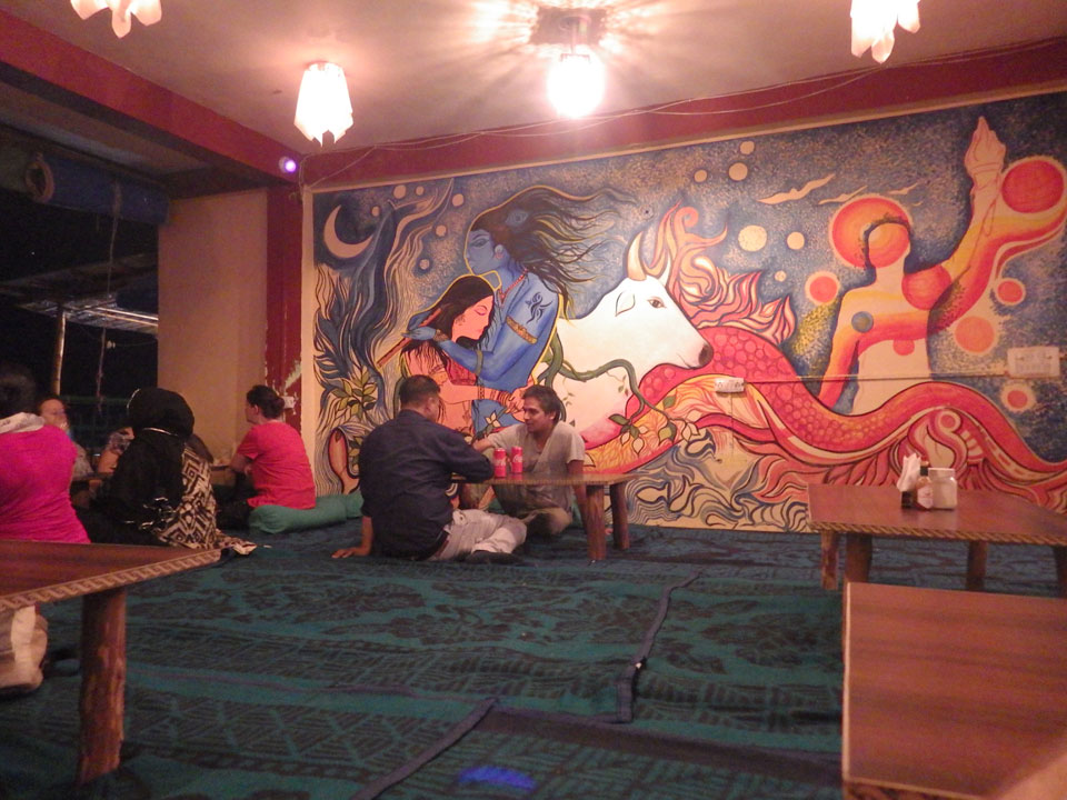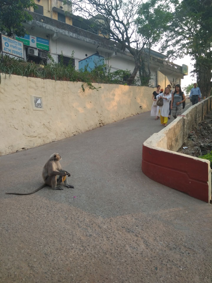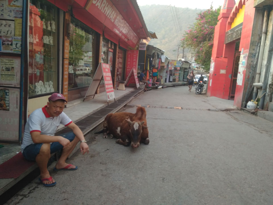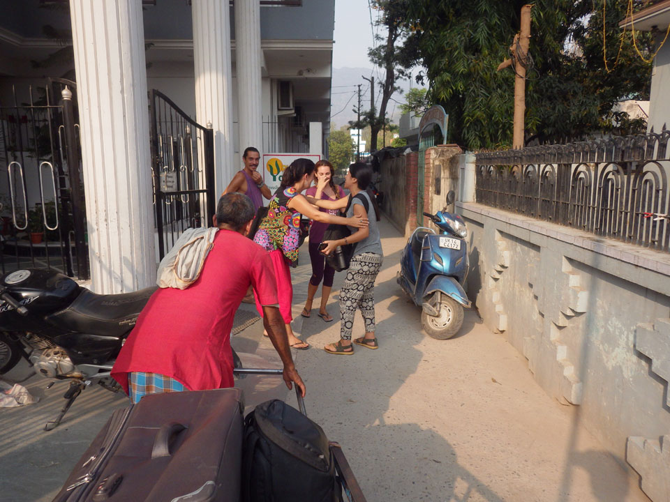 So richtig hatten wir keine Adresse, fragten uns durch, ein Russe gab auch Auskunft und es ging doch heftig bergauf. Ich half beim Schieben und dann war’s endlich geschafft. Es wäre quasi unmöglich gewesen, das Ganze selbst zu stemmen. Der alte Mann wollte 500 INR, ich sagte nicht dagegen. Das war doch eine heftige Tour. Er schwitzte ordentlich. Jemand sah gleich Bekannte am Eingang der Yoga-Schule. Einst nur aus Whatsapp bekannt, war es das erste Treffen in Persona.
