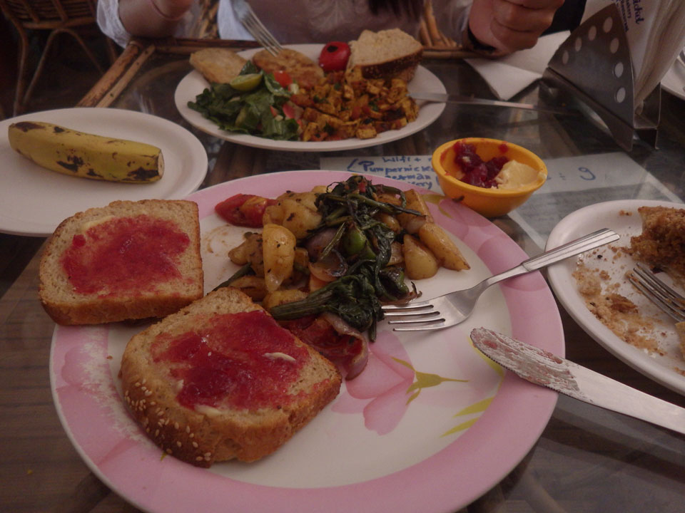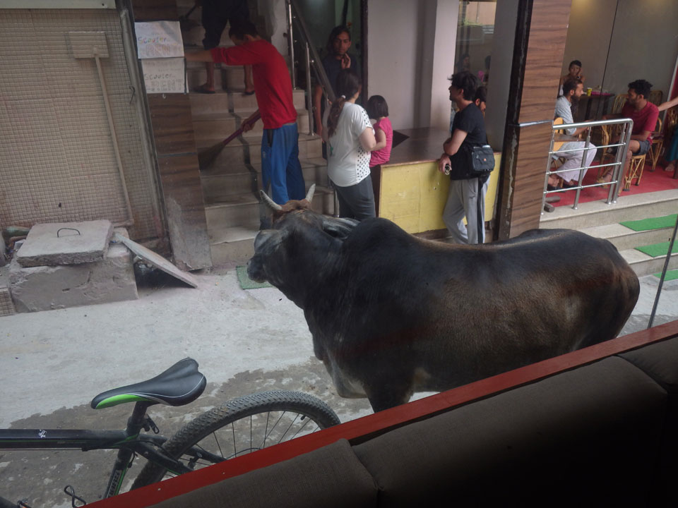 Zuerst mal Essen, im Babylon, dem mir bekannten Café mit gutem Cappuccino. Ein Sitzplatz mit Aussicht war heute nicht drin. Jemand hatte Appetit und aß dann doch nur die Auswahl. Ich schaffte den Rest kaum – heftig die Rechnung mit 760 INR – fast €10. Da wollte jemand was dazugeben aber nein, zum letzten Tag schaffe ich das auch noch.