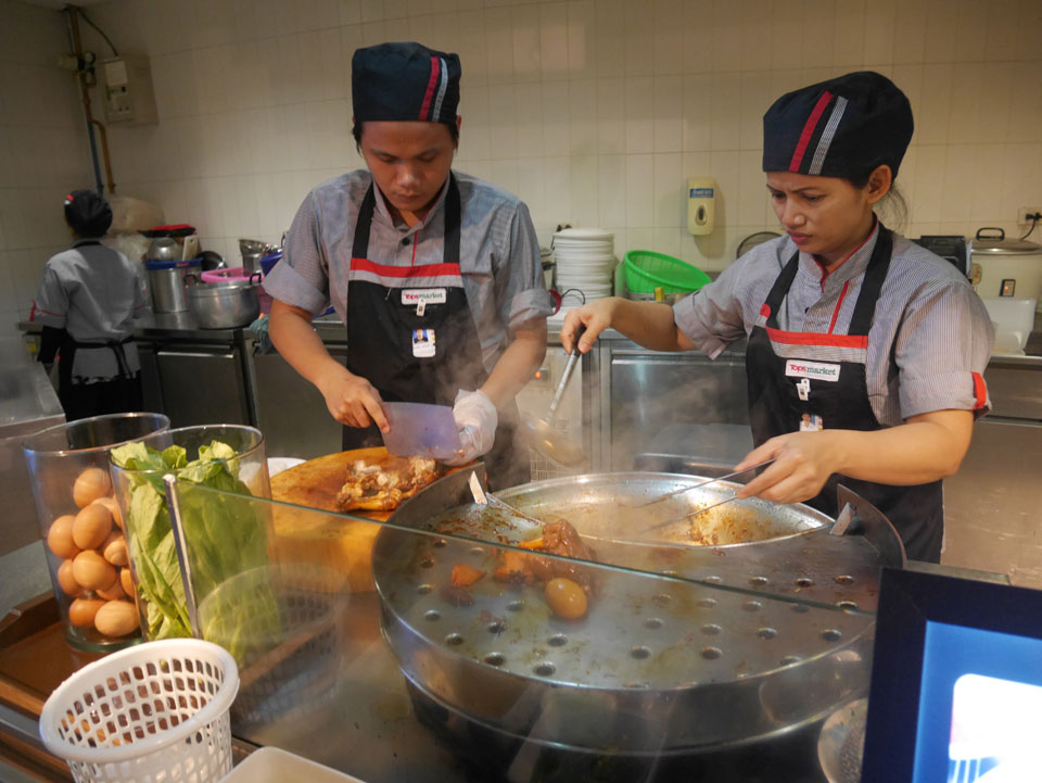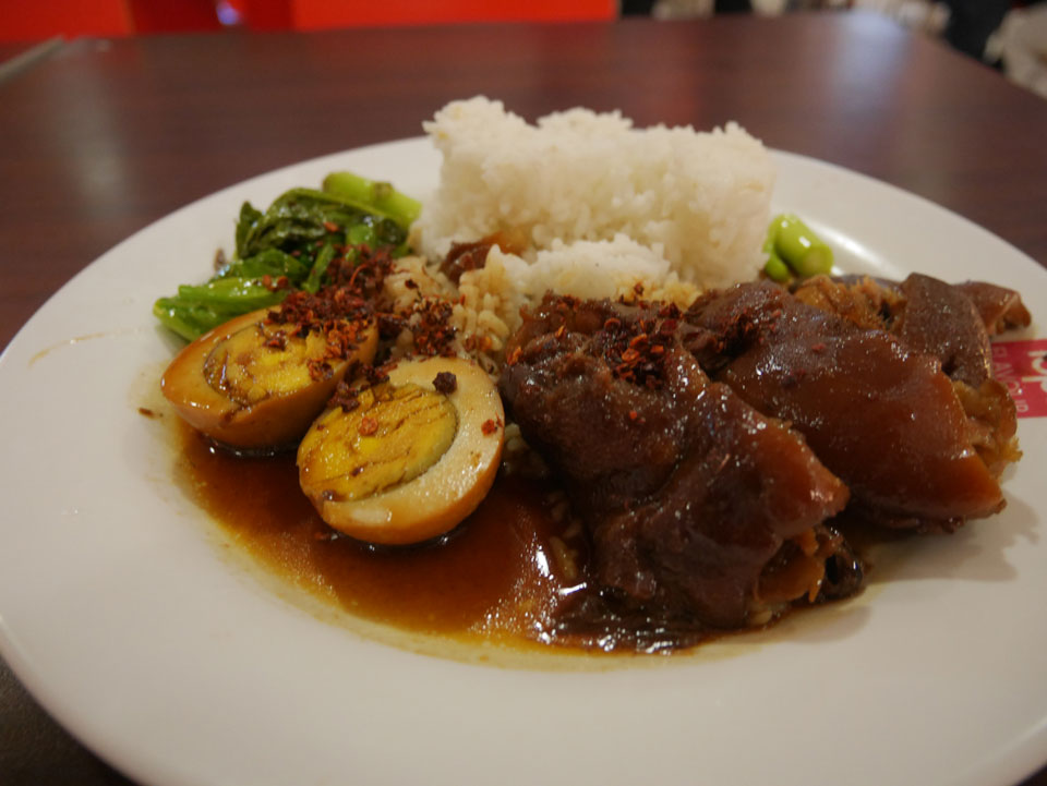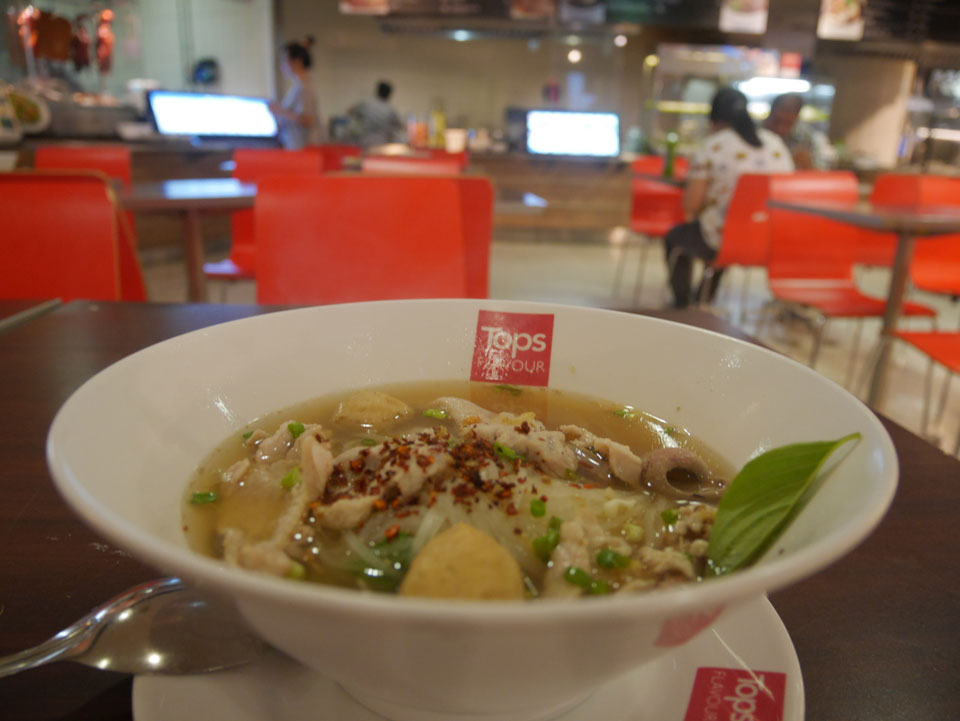 19:00 dann in den Food Court. Ich lud meine Karte exakt auf. Man hatte gerade ein anderes Schweineteil gekocht und nahm das. Die Karte wurde einbehalten und ich bekam Speckschwarten – wie eine Art Eisbein auf thailändische Art. Das schmeckte schon, nur eben nicht ganz fettarm.