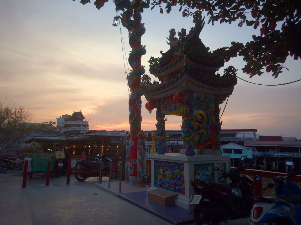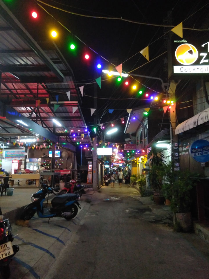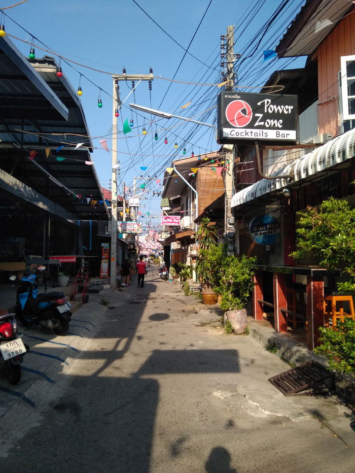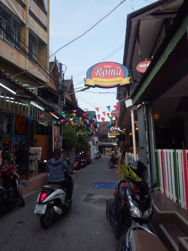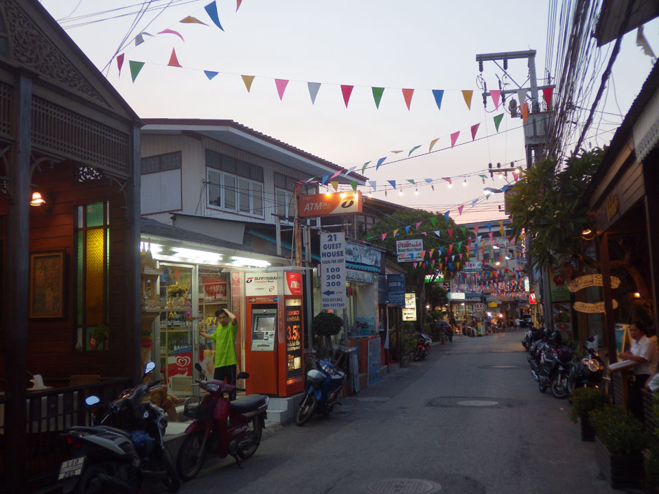 Wir wurden an einer viel günstigeren Station herausgelassen. Ich musste nur 5′ zum Limelight Guesthouse spazieren. Zimmer gab’s – mit 500 THB angeschlagen, sodass ich nicht mal handeln wollte. Drei Nächte und wieder das gleiche Zimmer Nur 4. Man hatte seit November die Klimaanlage erneuert. Einfach eine zweite war jetzt eingebaut. Für mich war das alles perfekt mit kleinem Tisch für den Mac, großem Bett. Eine fette Kalerlake lag in der Dusche, doch so ist das eben in Asien.