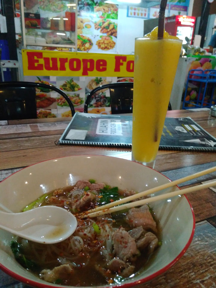 Ich ging müde auch noch baden. Im Food Court Schweine-Nudelsuppe, Pad Thai mit Shrimps und Mangosaft für gerade mal 120 THB zusammen. Damit war der Tag gut gelaufen.