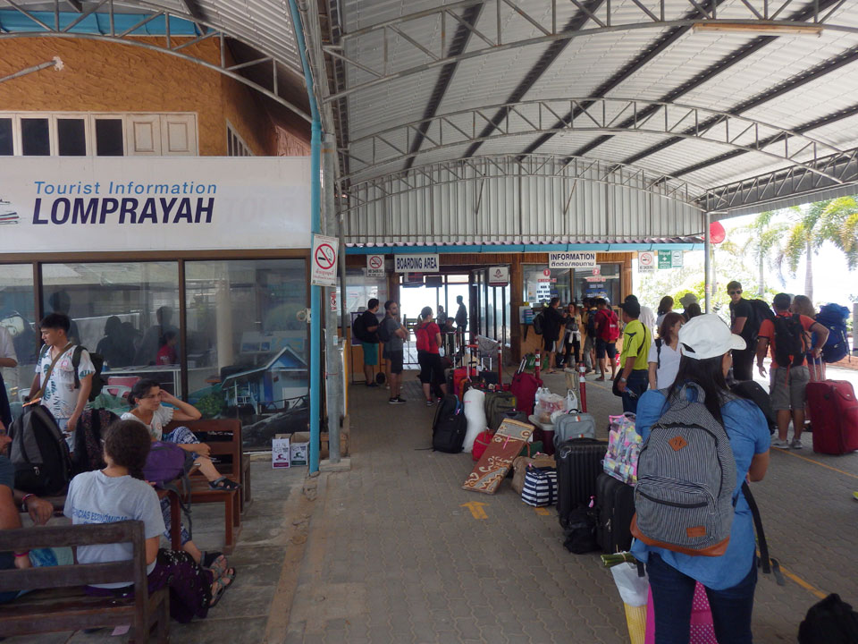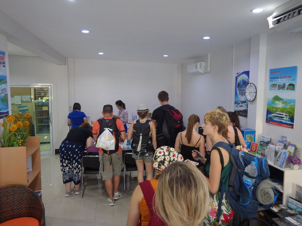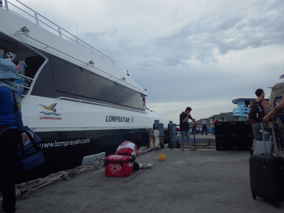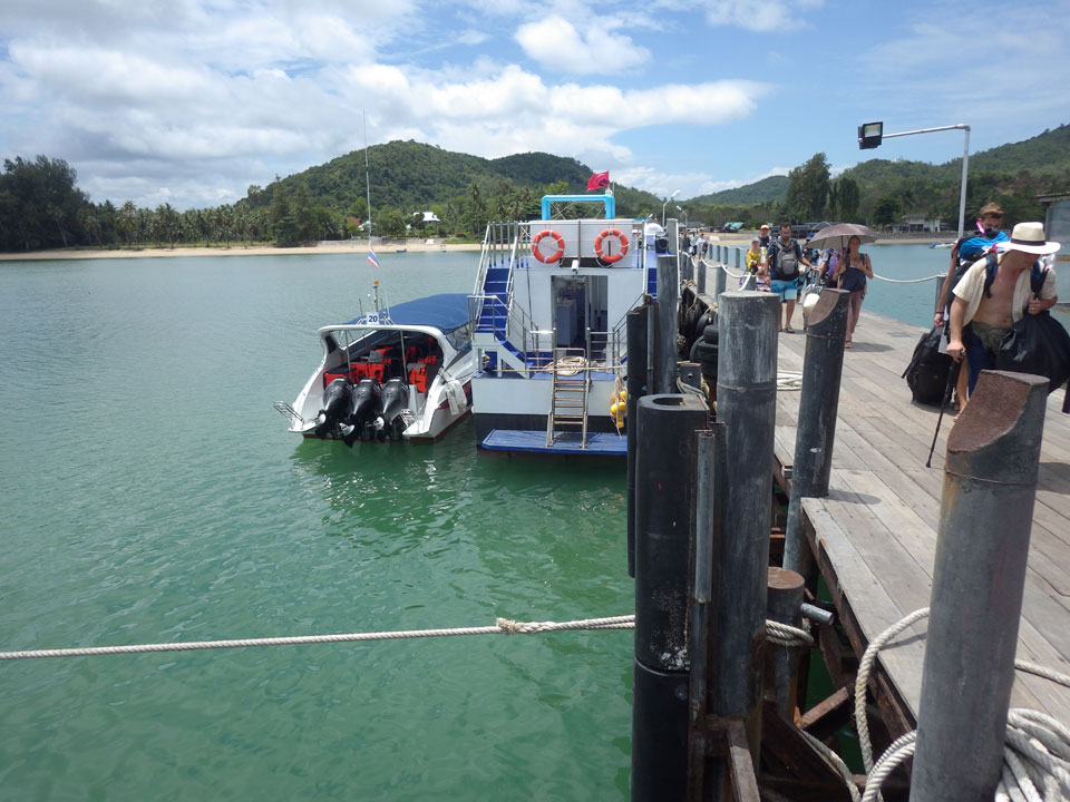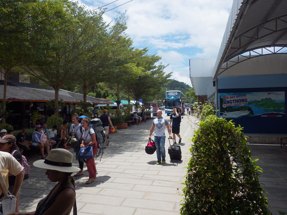 Krass kurze Nacht. Um 8 checkte ich aus und war flugs, nach einer Wegweisung, am Lomprayah Büro. Dort warteten schon viele Backpacker, was mich überraschte. Das letzte Mal vor 3 Jahren waren hier nur eine Handvoll Leute. Ist eben Vollmondzeit.