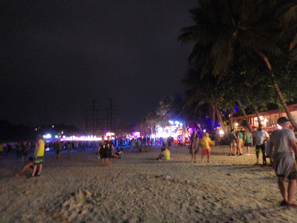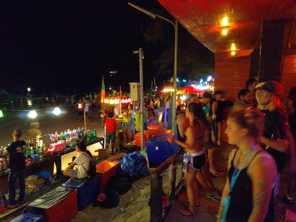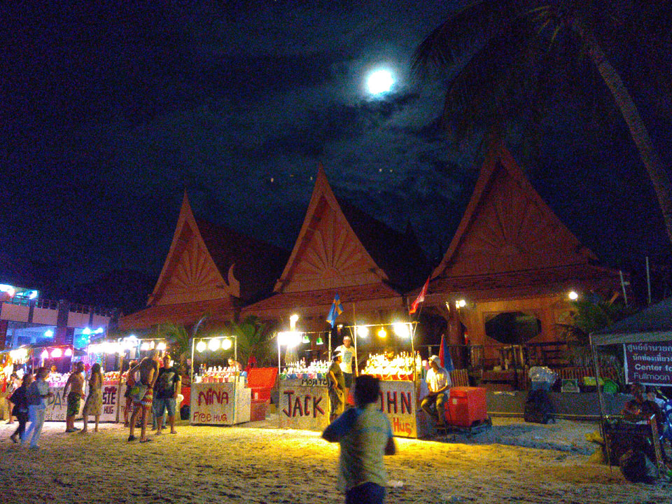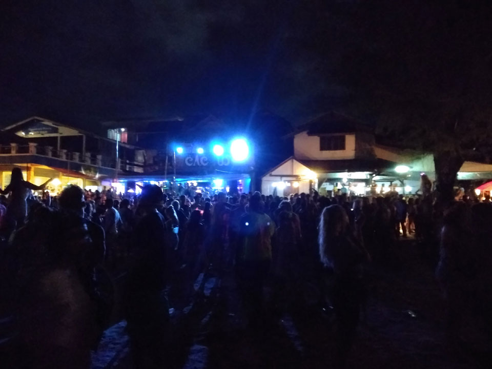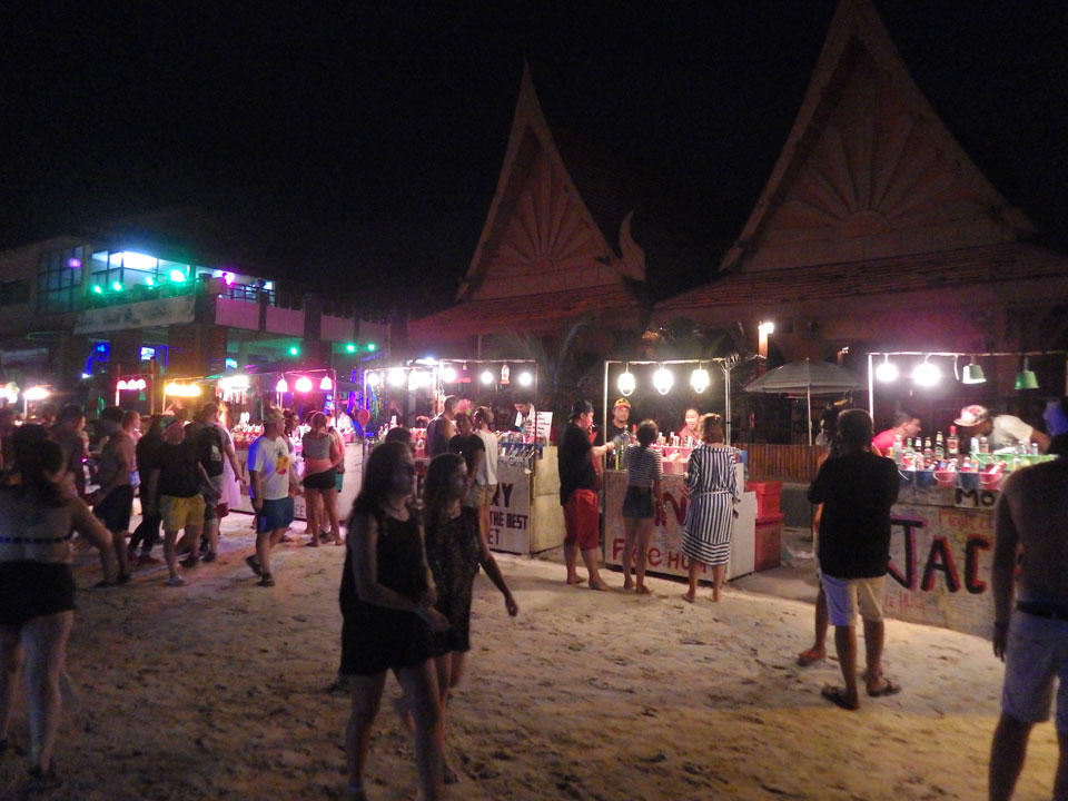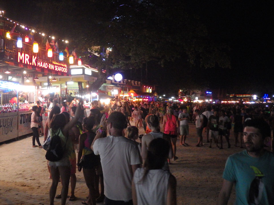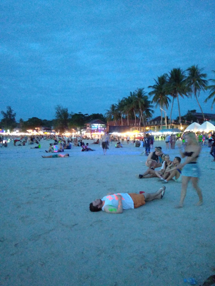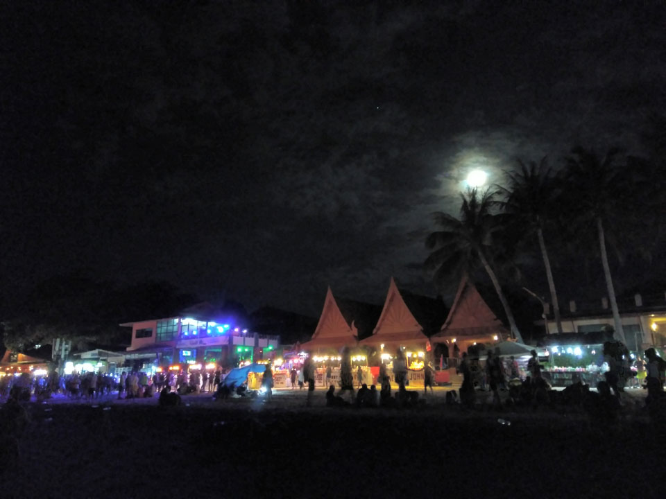 Viele Leute zog es heute wieder nach Haad Rin. Die Party war gut, bekannte Musik und einige kleine Bars von Anfang bis Ende. Ganz so voll wie im Mai letztens Jahres war’s aber wohl nicht. Die Stimmung war auch gut, immer mit etwas Bammel vor großem Regen doch es blieb trocken.