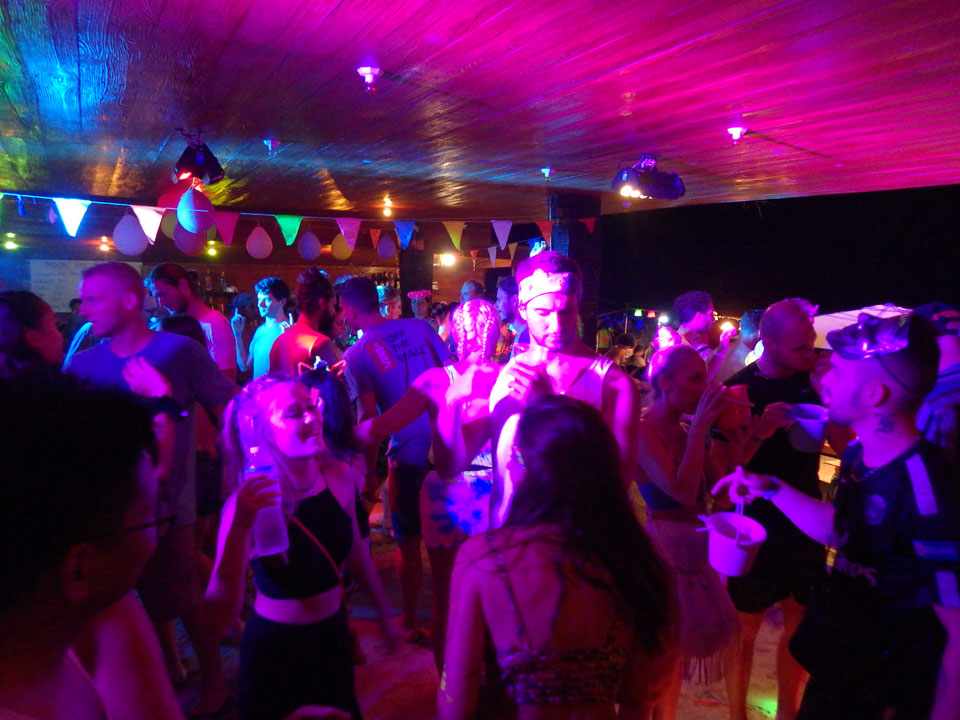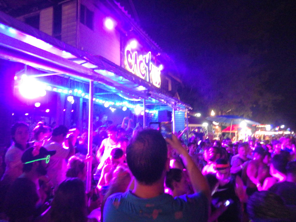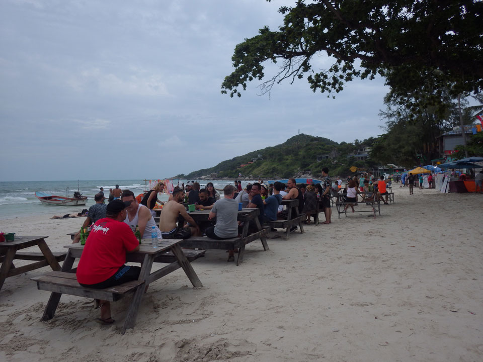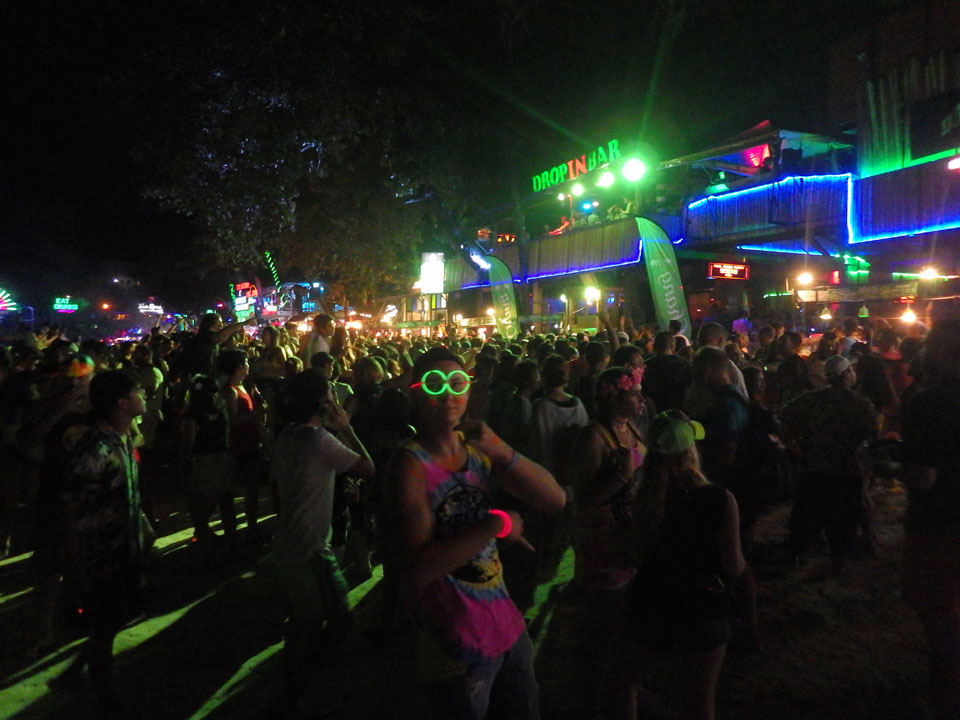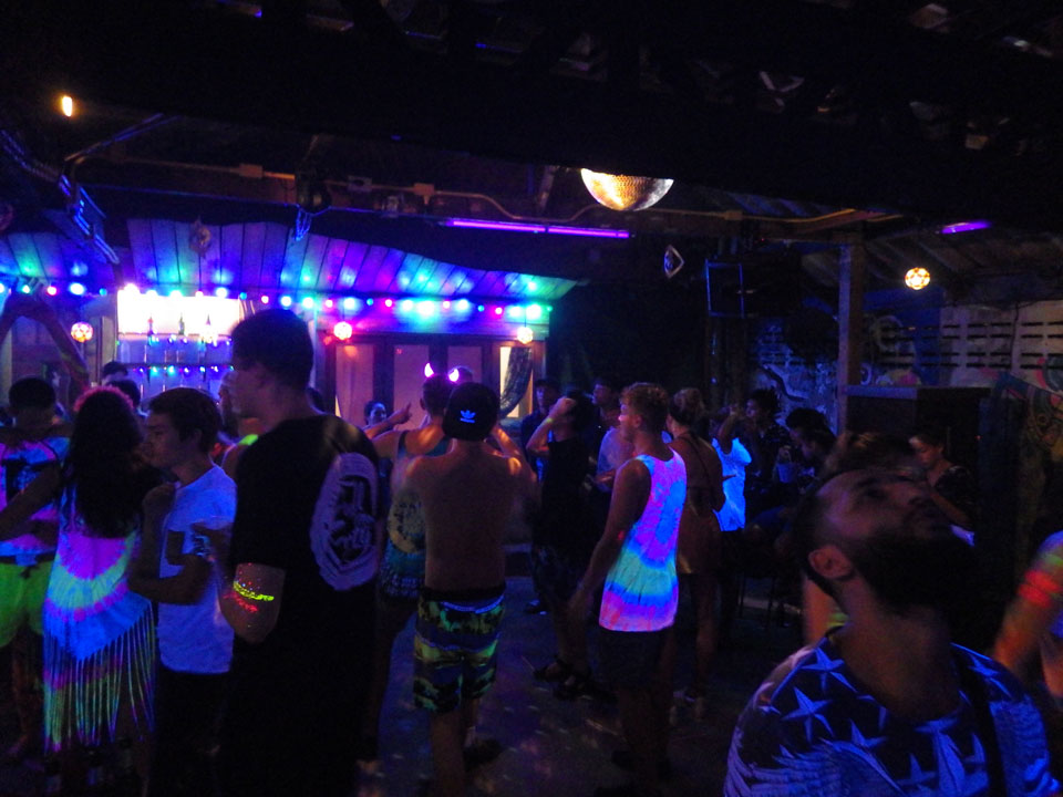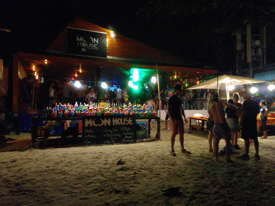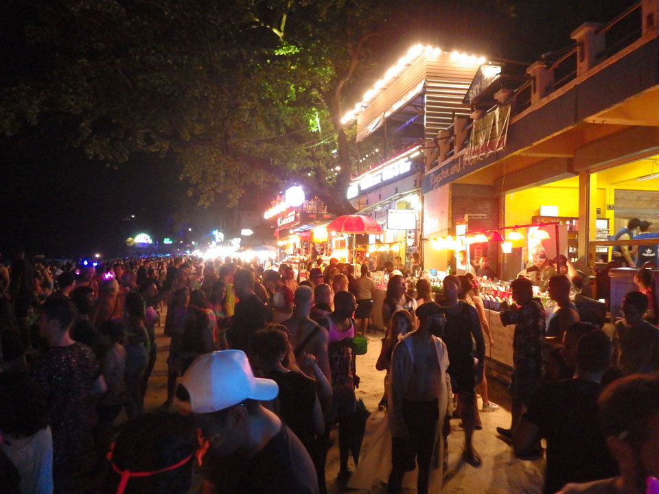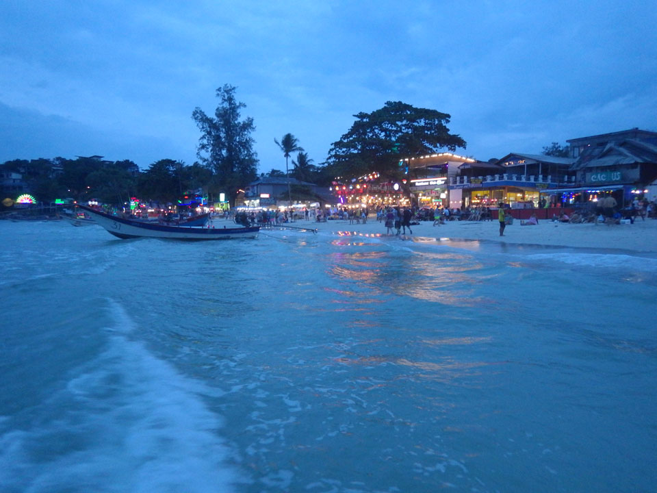 Viele Leute zog es heute wieder nach Haad Rin. Die Party war gut, bekannte Musik und einige kleine Bars von Anfang bis Ende. Ganz so voll wie im Mai letztens Jahres war’s aber wohl nicht. Die Stimmung war auch gut, immer mit etwas Bammel vor großem Regen doch es blieb trocken.