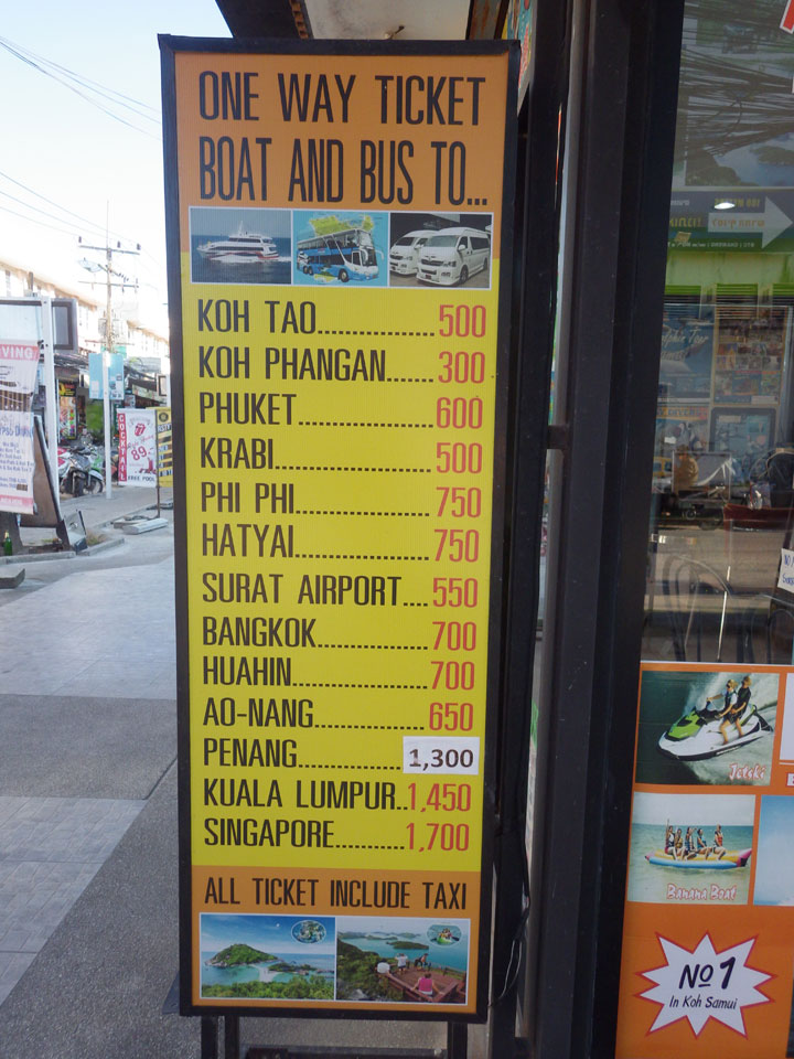 Ich wollte die Abreise organsieren. Gute Preise in einer kleinen Box gleich an der Straße – nur 650 THB für die Fahrt nach Ao Nang. Erst mal ging ich was essen und danach baden, schaffte es bis vor 20:00 dann das Ticket zu kaufen.