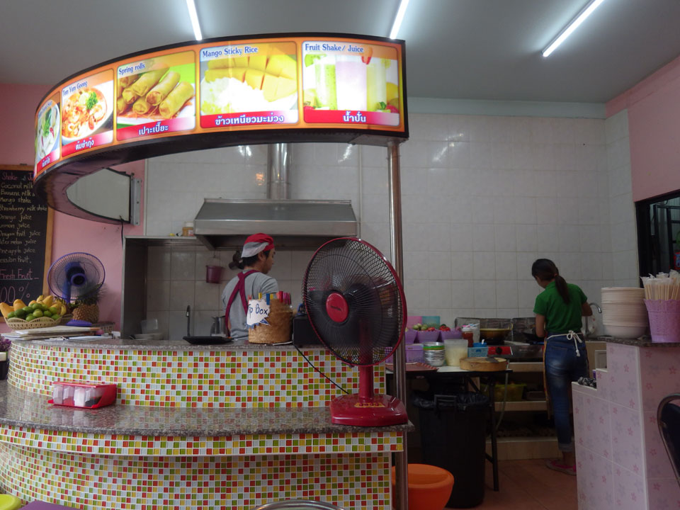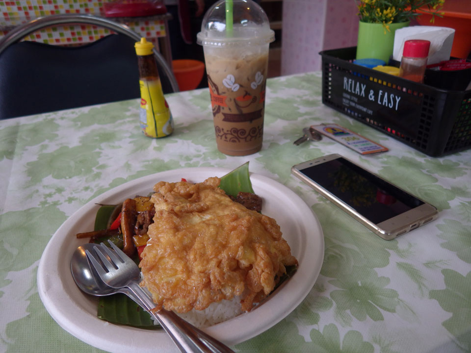 Stattdessen ging’s zum anderen Laden auf Eiskaffee und Stir Fry Beef mit extra Omelette. Dann noch ein Dragonfruit-Smootie (210+10 THB).