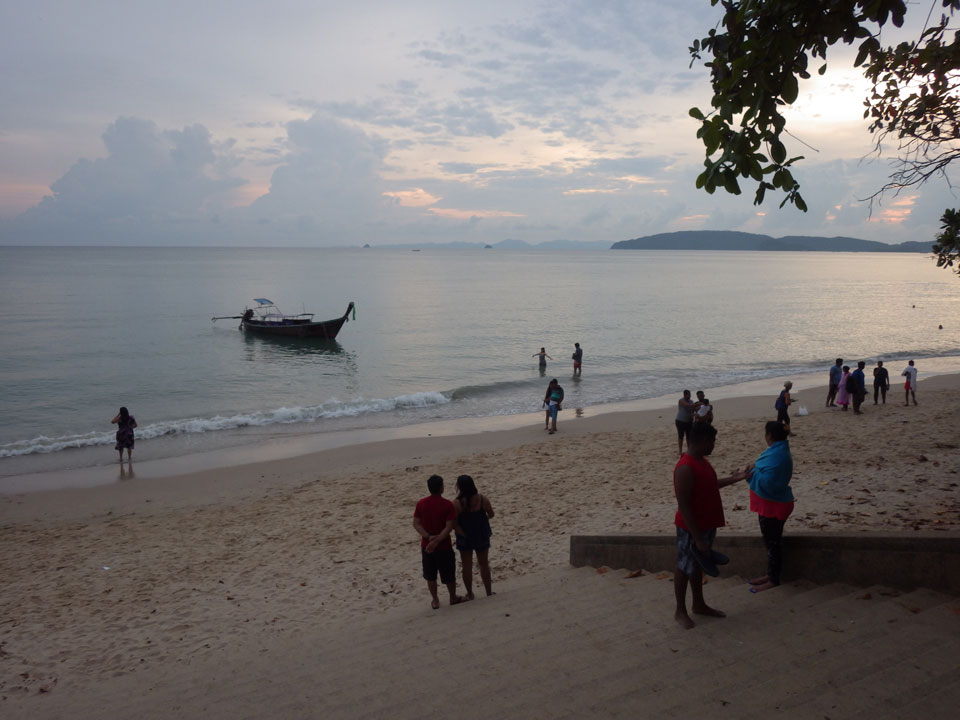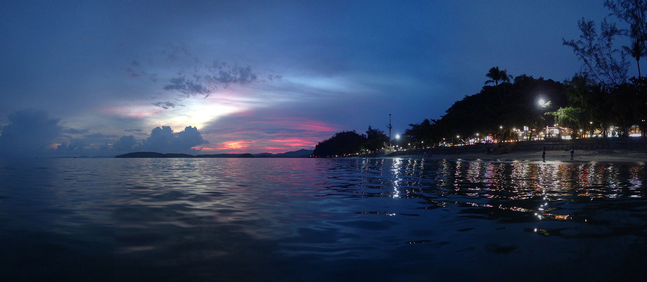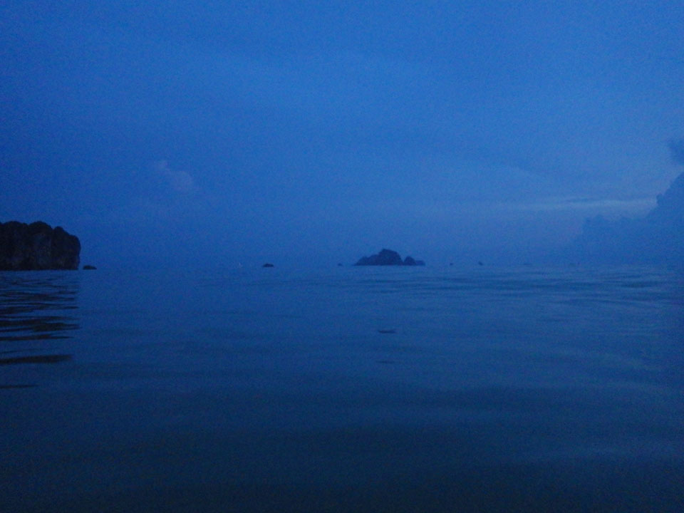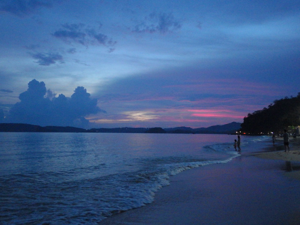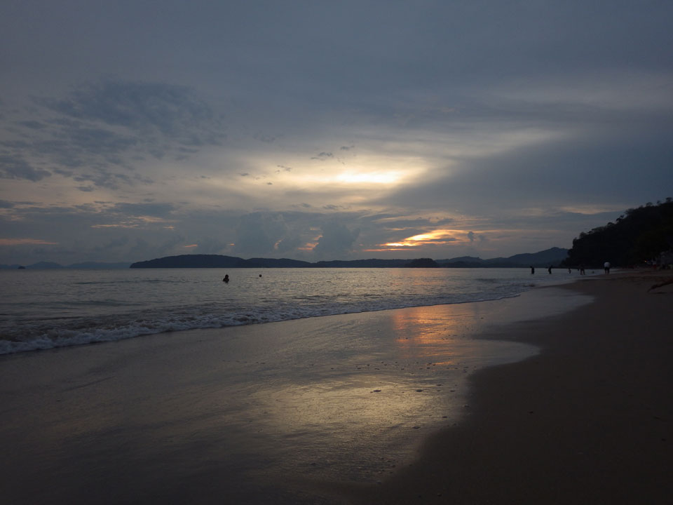 Am Strand war ich entsprechend spät, es ging langsam bei mir bergauf, die Sonne unter. Schöne Wolken und rote-blaue Farbpalette. Krabi hat schon nette Abende. Das Wasser war wie immer – super.