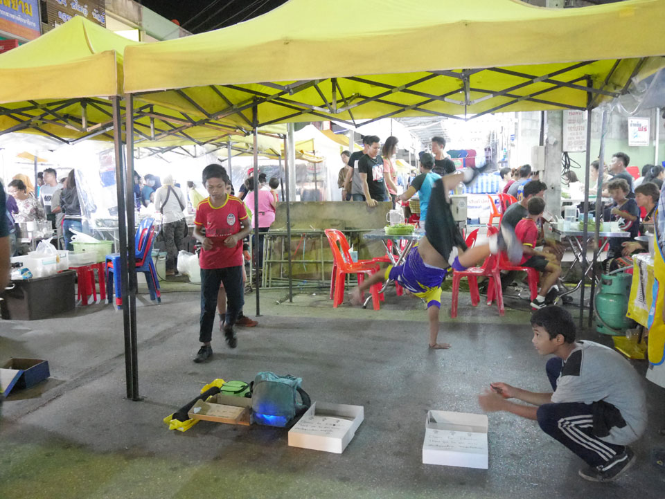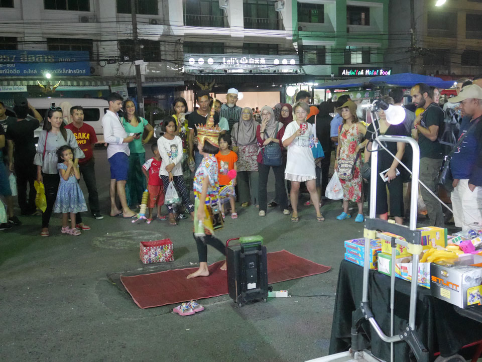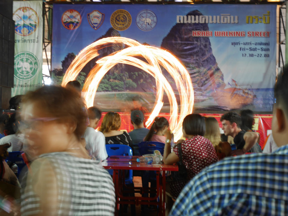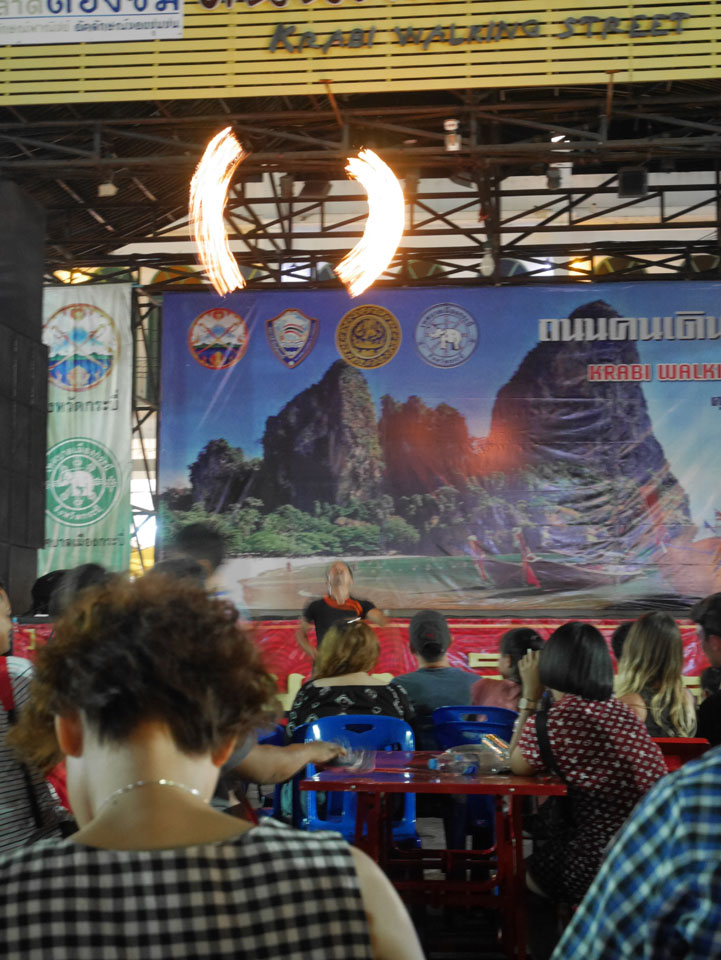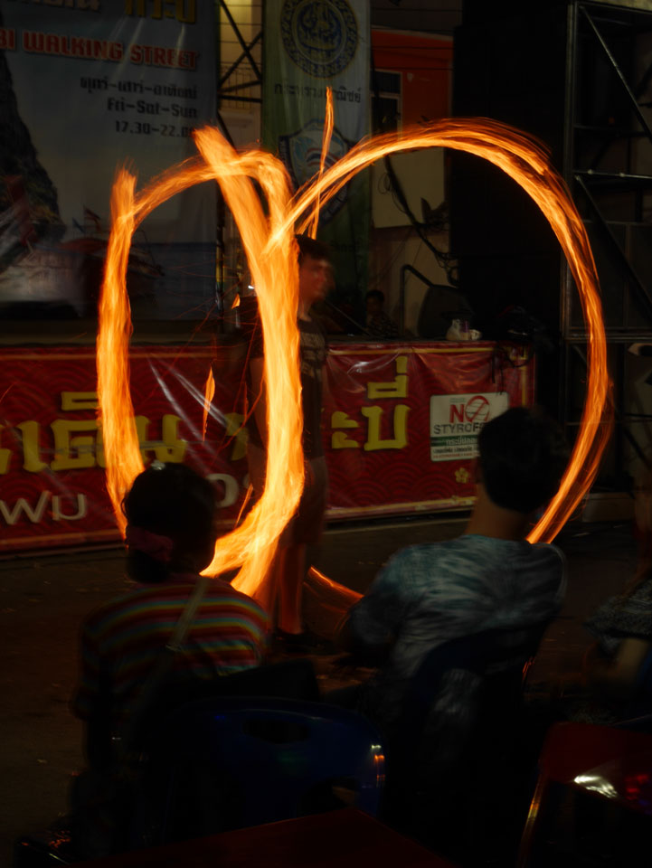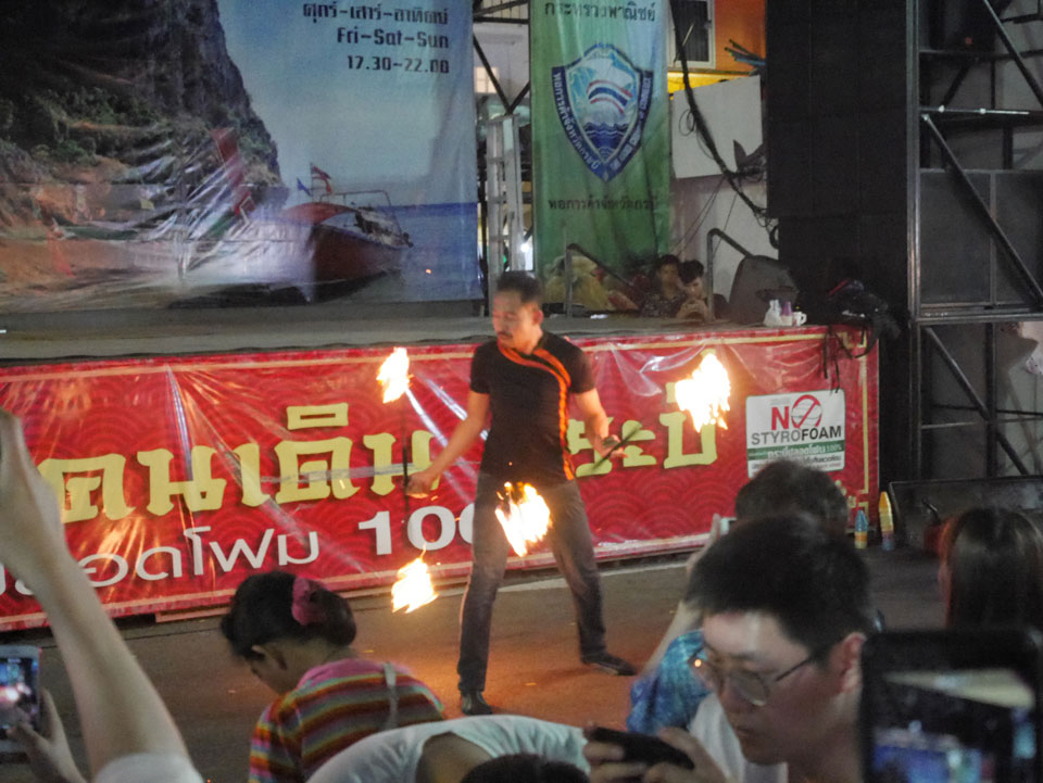 Abends ging ich auf den Nachtmarkt, der doch größer war, als ich erwartet hatte. Auf einer Bühne gab es ein Unterhaltungsprogramm. Ein Feuertwirler legte sich gut ins Zeug. Ich hatte scharfes Essen und Mangosaft.