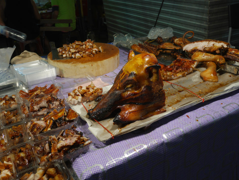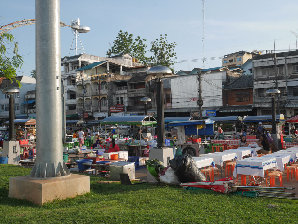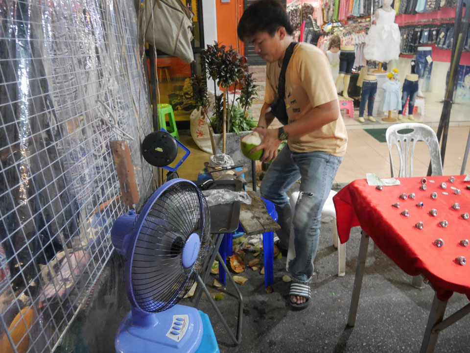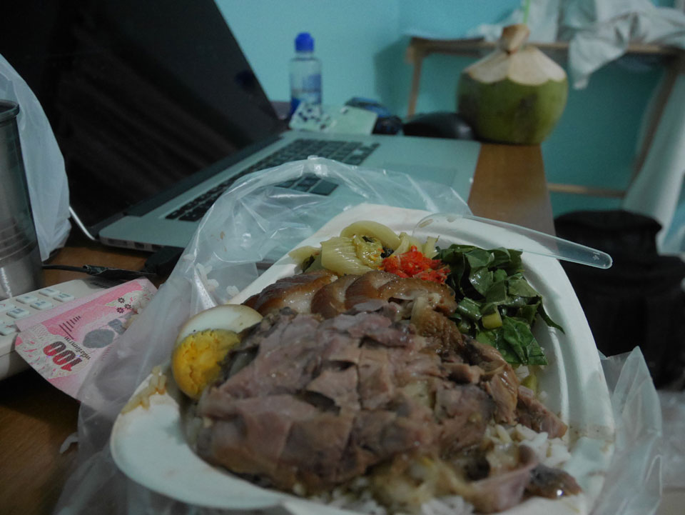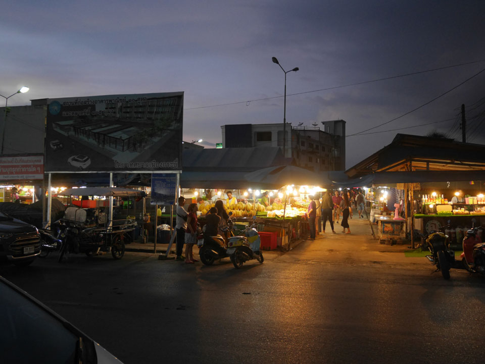 Der Himmel wurde immer dunkler, doch ich wollte noch mal zum Marktplatz gehen um mir ein Abendessen zu beschaffen. Frittierter Schweinenacken (100 THB), dann noch Reis mit noch mehr Schwein. Eine Kokosnuss in der Hand und flugs zurück zum Zimmer, als schon der Regen begann.