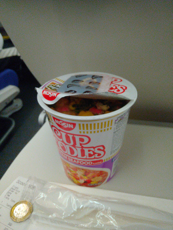 Im Flieger hatte ich einen Gangplatz im mittleren Bereich. Boeing 787 Dreamliner ist echt gut, wenn man schlafen will. Ein Nachtflug ab 2:35 ist auch gut, denn inzwischen war ich ordentlich fertig. Hunger kam auf und ich hatte noch 6 SGD übrig. Eine Instant-Suppe kostete 5 SGD (€3,50), was ein gepfefferter Preis ist, aber so ist das bei scoot: günstige Flüge aber Null extras. Alles OK, schließlich fliegt man mit ein paar hunder km/h durch die Nacht. Nachdem die Turbulenzen vorüvber waren, hatte ich meine Suppe. Wenigstens nochmal was im Magen – gegen 4. Ein Singapur Dollar bleibt übrig.