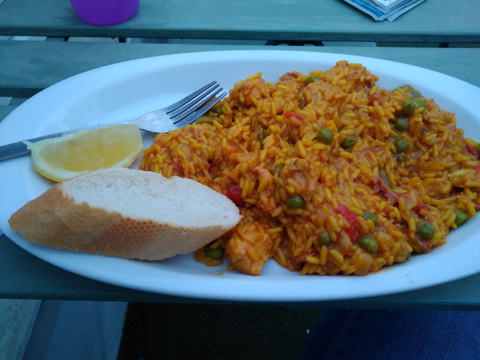 Ich pennte bis in den Abend und Abendessen. 19:00 war hier kostenloser Sangria angesagt, um 19:30 war das Kontingent schon alle. Ich hatte aber die Paella um 20:00 für €3 schon bezahlt, war OK. Ich redete etwas mit einer asiatischen Norwegerin, wohl etwas älter als ich, die sich in Spanien eine Immobilie zulegen will .. und ganz auswandern möchte. Tja, finanziell kann ich da nicht mitreden doch Spanien ist schon ganz nett, klar.