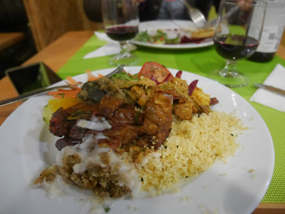 Jetzt zum Abend drehten wir noch eine kleine Runde durch die Gegend. Die meisten Läden hatten geschlossen. Wir fanden ein Veganes Restaurant, was jemanden ganz besonders freute. Da gab’s für €7,50/Nase ein Buffet. Ich hatte Kohldampf und verschlag 3 Teller. Ich hätte noch mehr essen können aber ließ es mal. Mit ’ner kleinen Flasche Wein echt super. Jemand wollte sogar morgen gleich wiederkommen aber mal sehen. Erst mal Lisboa checken. Mit der Unterkunft scheinen wir ganz gut in Sachen Bus und Metro verbunden. Internet im Zimmer ist dagegen vorsintflutlich.