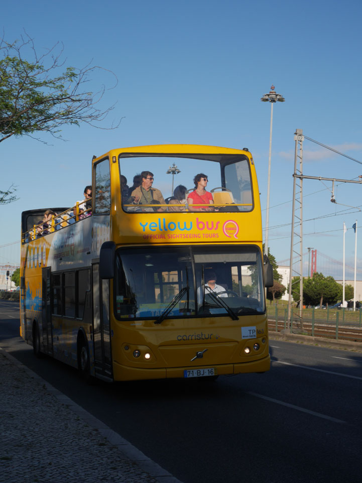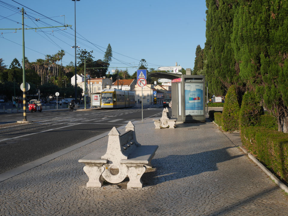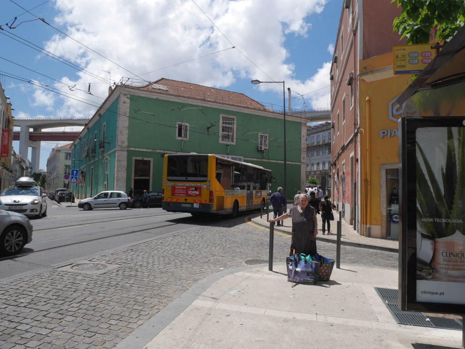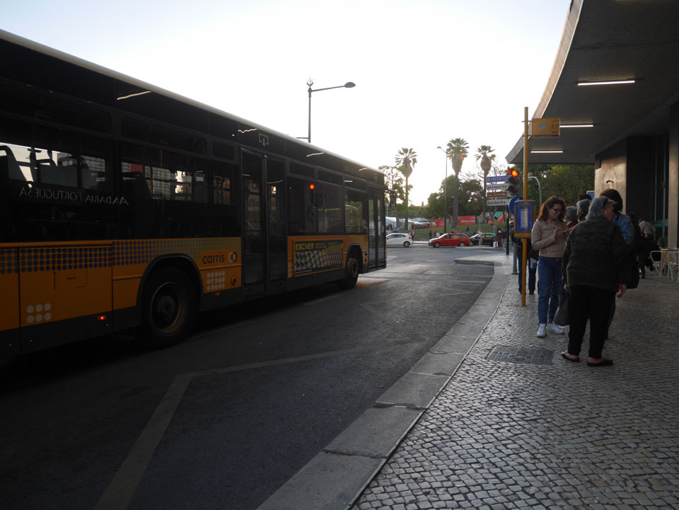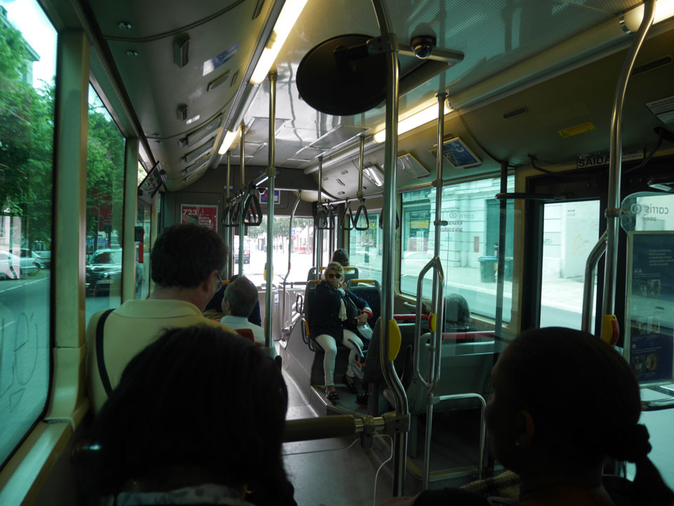 Ich suchte nach einer alternativen Verbindung mit Umsteigen und so gingen wir schwupps runter zur Marquis von Pombal Statue, wo eine Verbindung nach Alcantara auch OK war. Während der Fahrt gab’s mal Fahrschein-Kontrolle. Das ist ungewöhnlich, da man doch vorn beim Fahrer zahlen muss oder seine Chip Karte entwertet. Er schnappte doch einen. Ich fragte, ob man mit dem Ticket umsteigen kann – nein: ein Ticket – ein Bus.