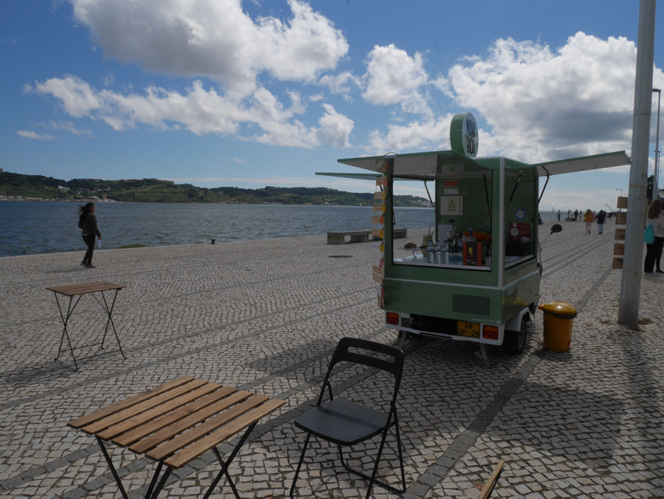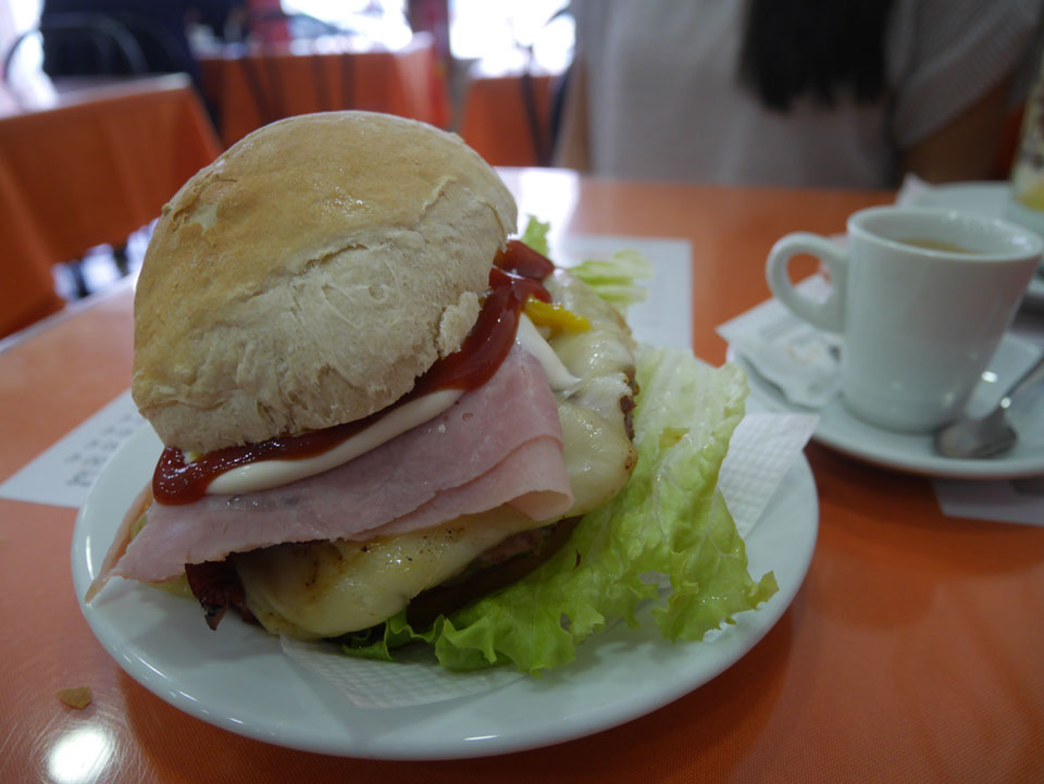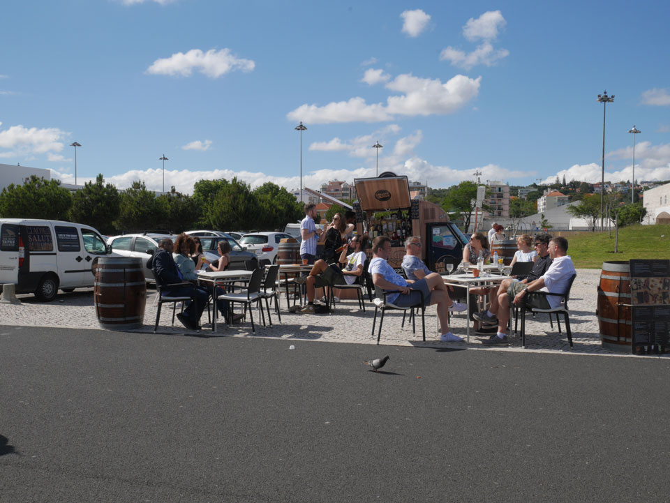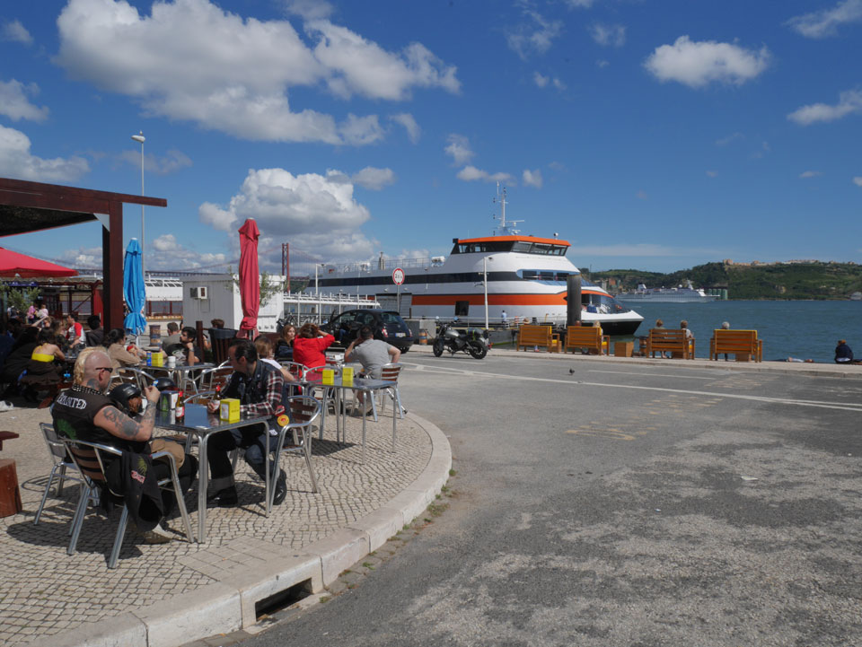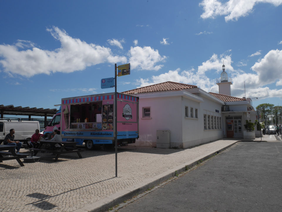 Wir stiegen an der Endhaltestelle aus, hatten noch gut 5km bis zum Torre de Belem. Das Wetter war schön aber schwierig. Mit Sonne zu warm für eine Jacke, mit Wolken zu frisch. Erst mal Mittagessen mit einem Burger, der kaum in das Brötchen passte.