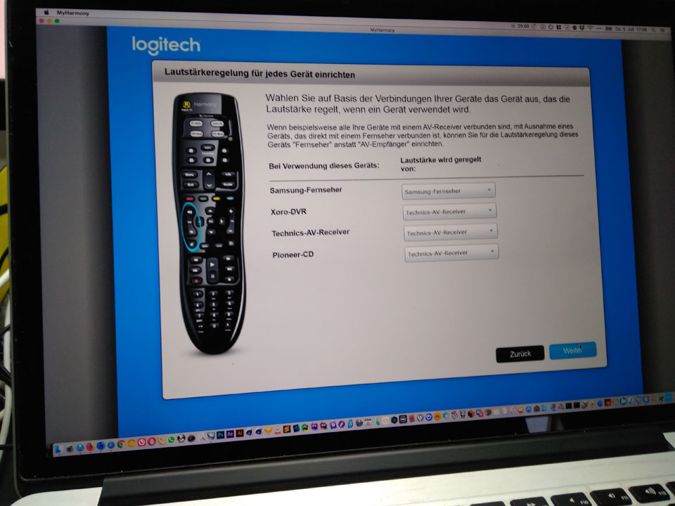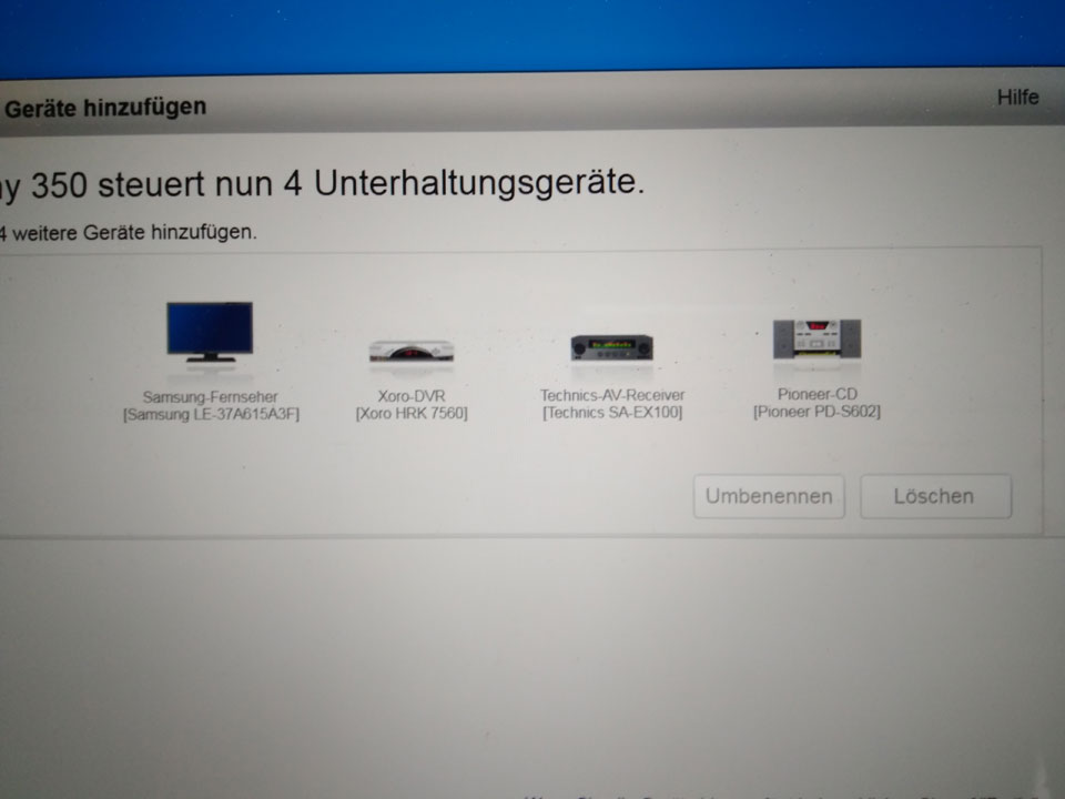 Die zum Geburtstag geschenkte Logitech Harmony 350 richtete ich auch ein. Das Programm auf dem Mac kam nicht zum Ende und brachte keine Server-Verbindung. Unten auf dem Win10 Laptop klappte das. Es werden 3 Geräte mit einem Knopf zugleich eingeschaltet: TV, Kabelbox und Audio-Versträrker. Leider kann man die Source im Audio-Receiver nicht auf der Fernbedienung verstellen. Somit sind’s statt 3 nicht nur 1 sondern immer noch 2 Fernbedienungen nötig.