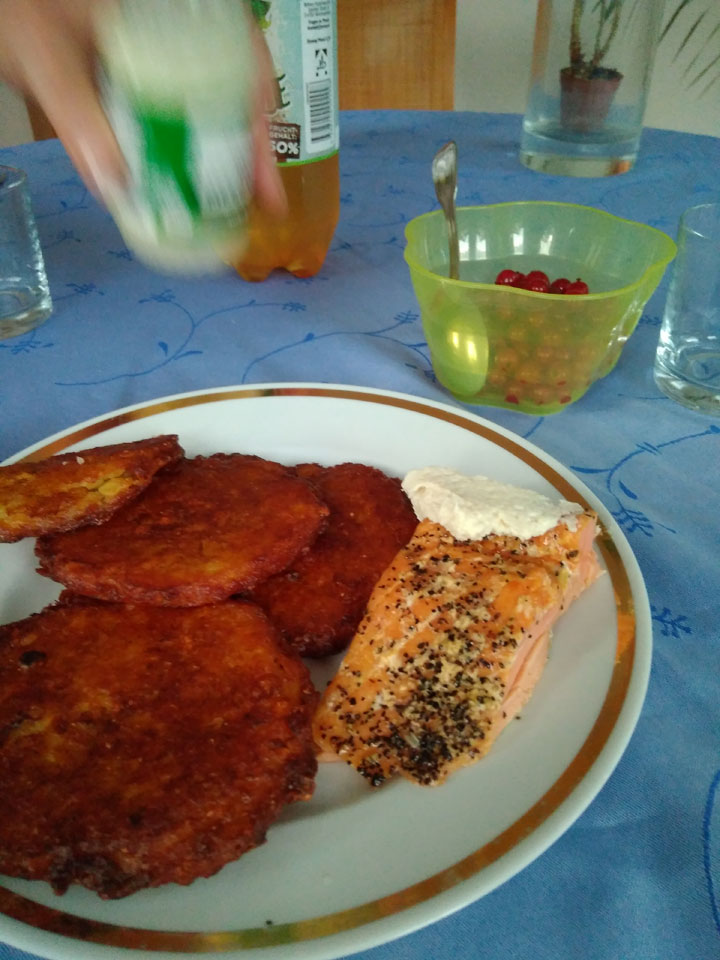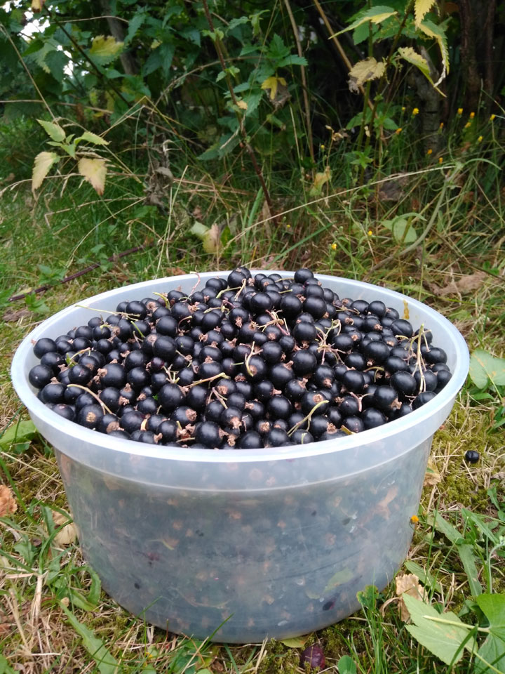 Johannisbeeren nahm ich nach den kleinen Schauern auch ab. Eine halbe Schale der roten und eine richtig große Ernte der schwarzen, wo ich gut eine Stunde dran saß. Machte aber Spaß mit Petersons banalem Hörbuch nebenbei. Die Brenneseln waren weniger angenehm aber auch egal.