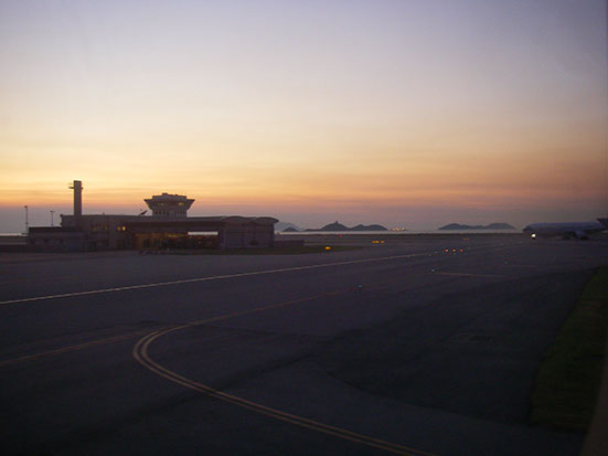 Kostenloses Internet-Terminal, McDonalds und dann in’s Flugzeug. Der Flug nach Hong Kong sollte 3 ½ Stunden dauern. B und zu konnte ich schlafen, trank ein Milo und dämmerte noch so vor mich hin. Pünktlich zum Sonnenuntergang schwebte man in Hong Kong ein. Sehr schöne Wolken. Unten war’s dann dunkel.