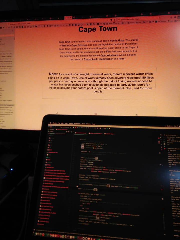 Abends joggte ich mal die Schafstreibe. Zwei Mal hin und her machte auch 4,8km. Entspannt, weil nur geradeaus aber eben Asphalt. Motiviert war ich heute und nahm nochmal den Konverter von ZIM in Angriff. Bis in die Nacht kam ich gut weiter. Das Ding lief dann, das erste mal auch mit ’ner Python Class statt Spaghetti Parameter. Das Hugo Theme müsste dann ganz stark angepasst werden, doch es ist schonmal cool, dass die HTML Sachen mit den Farben besser aussehen, als ich es mit Markdown hinbekommen hätte.