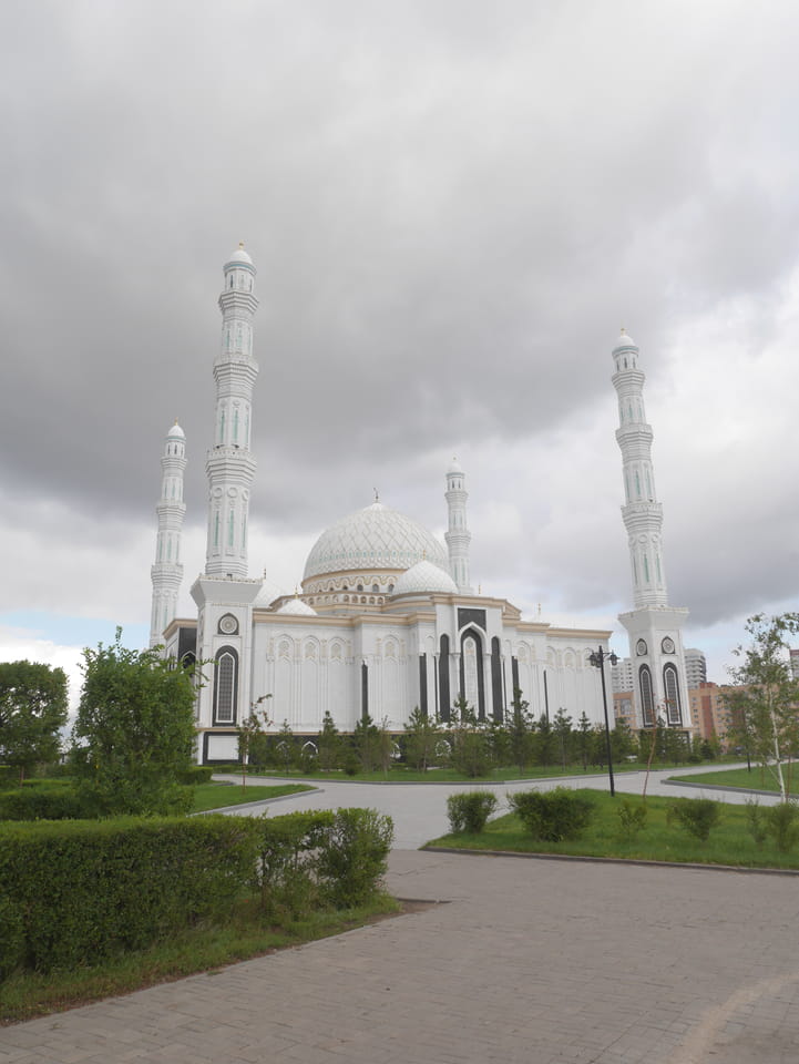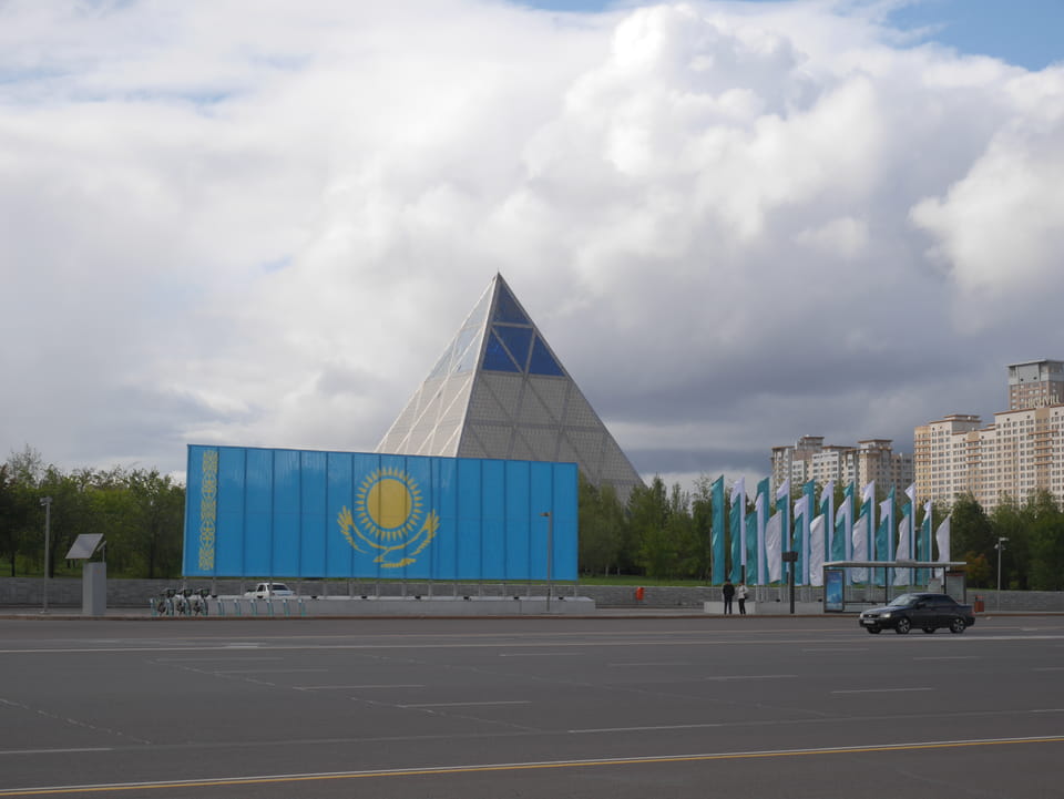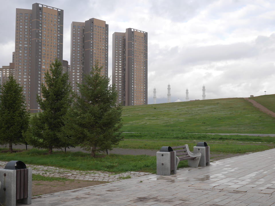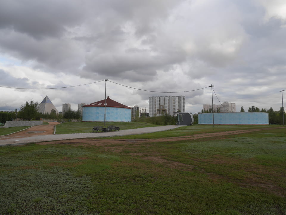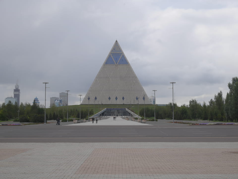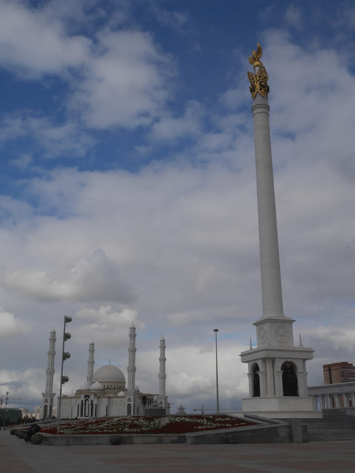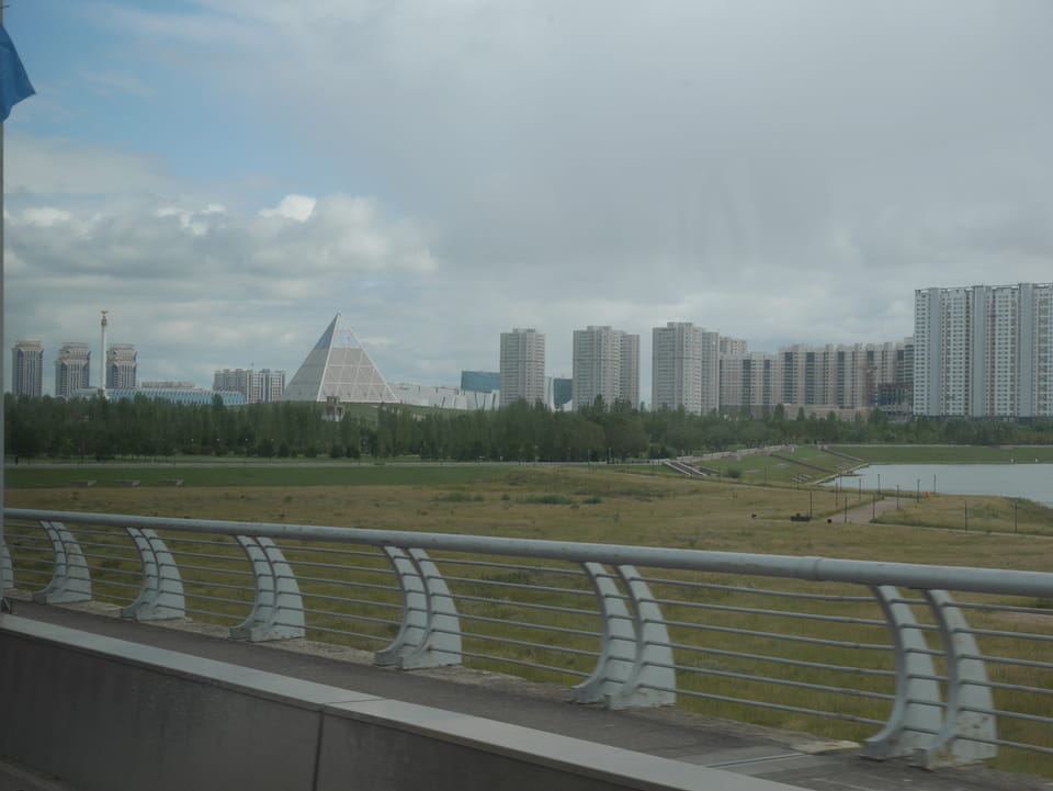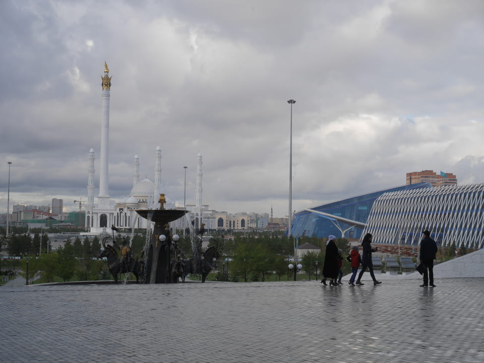 In der Nähe der Pyramide stieg ich aus. Da waren auch gleich eine Moschee und weiter zum Museum futuristische Bauwerke zu sehen. Kustakademie oder so. Wenig Leute waren heute unterwegs, obwohl hier einige Apartmenthäuser gebaut wurden. Astana macht eben einen zu modernen Eindruck, ist eben bisher nur eine politische Hauptstadt.
