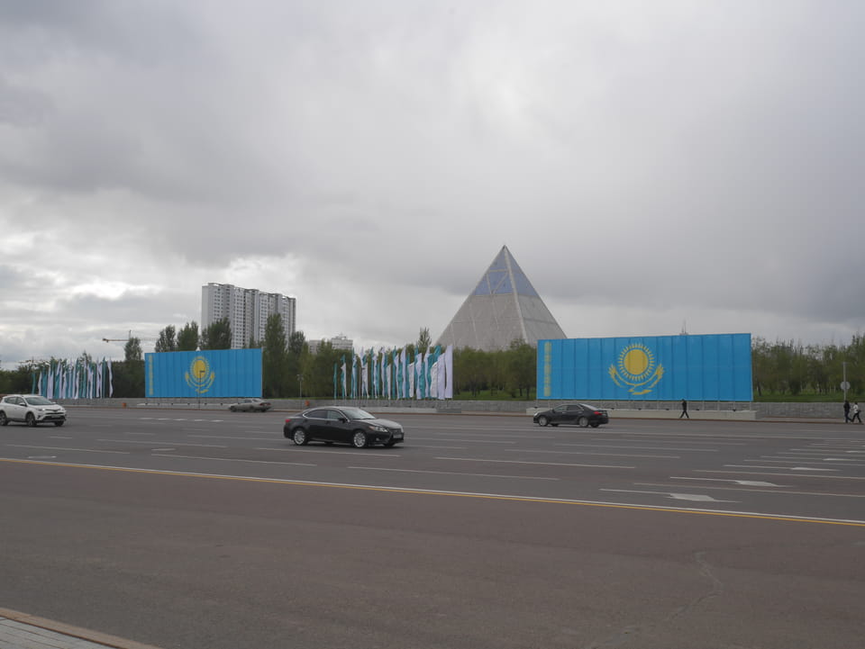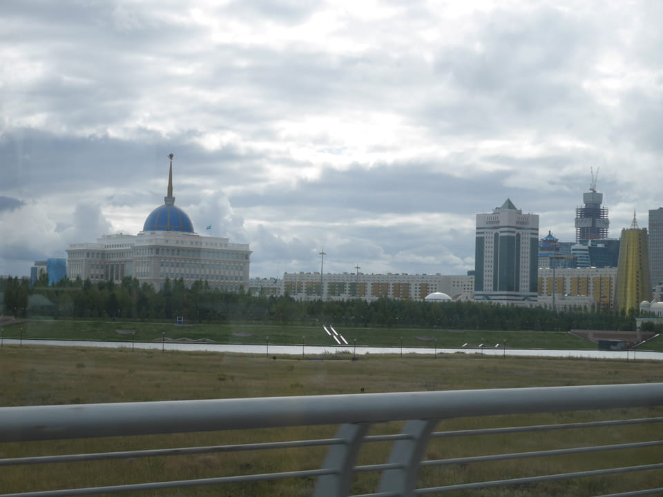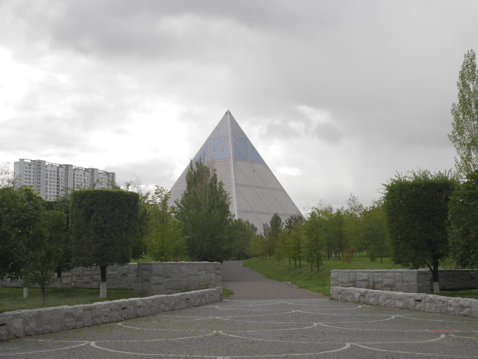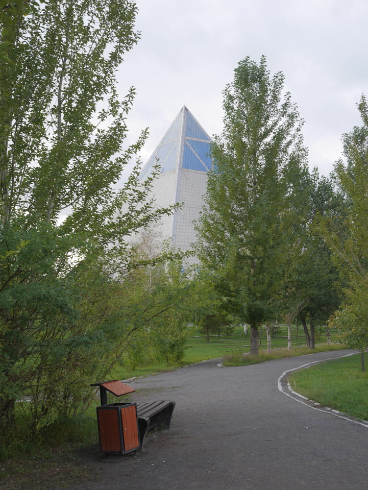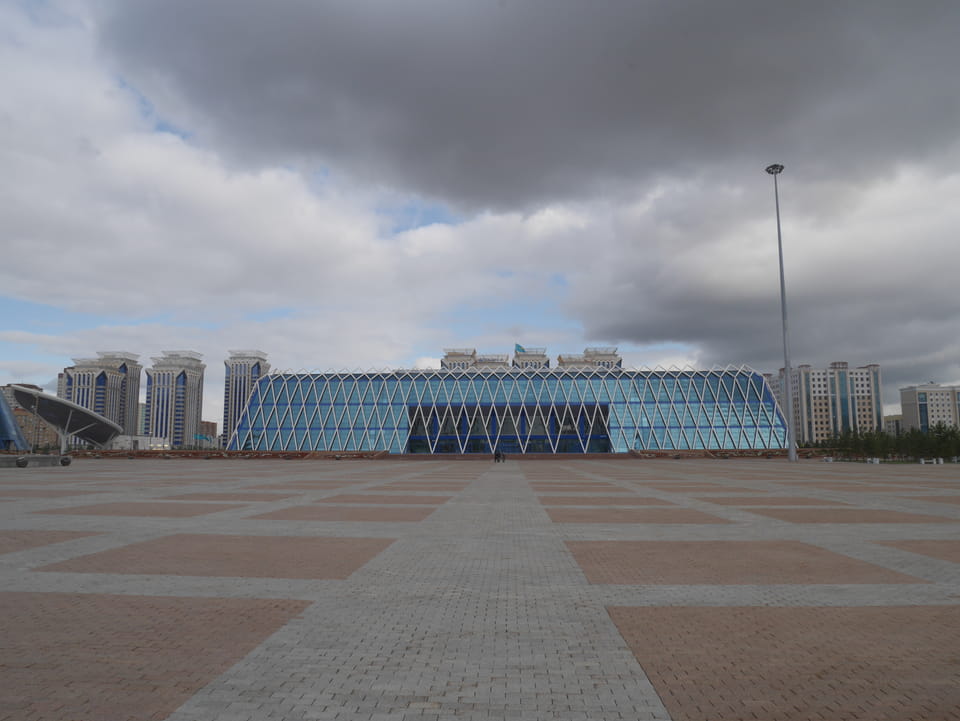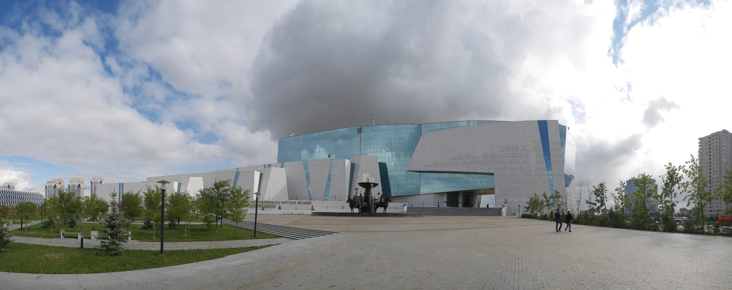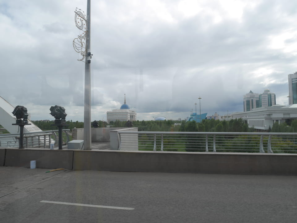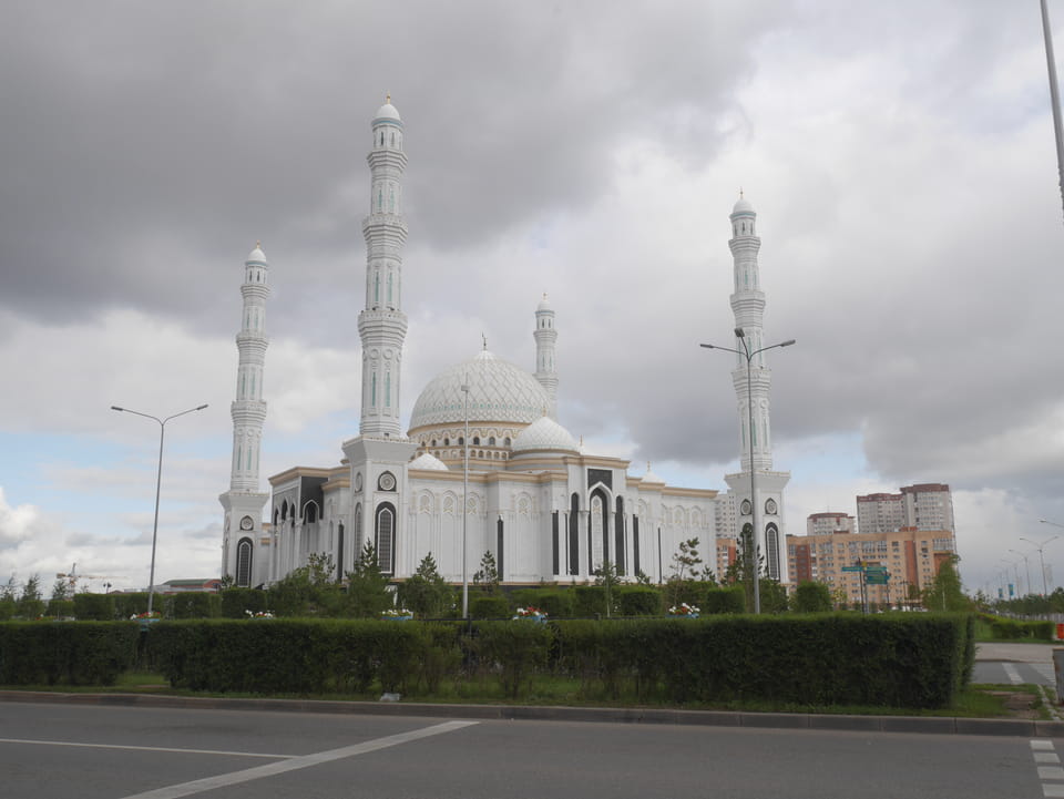 In der Nähe der Pyramide stieg ich aus. Da waren auch gleich eine Moschee und weiter zum Museum futuristische Bauwerke zu sehen. Kustakademie oder so. Wenig Leute waren heute unterwegs, obwohl hier einige Apartmenthäuser gebaut wurden. Astana macht eben einen zu modernen Eindruck, ist eben bisher nur eine politische Hauptstadt.