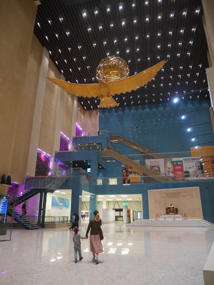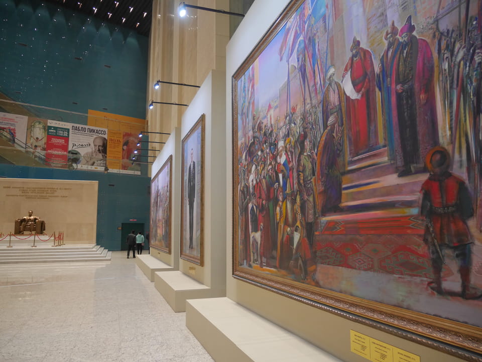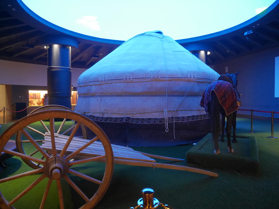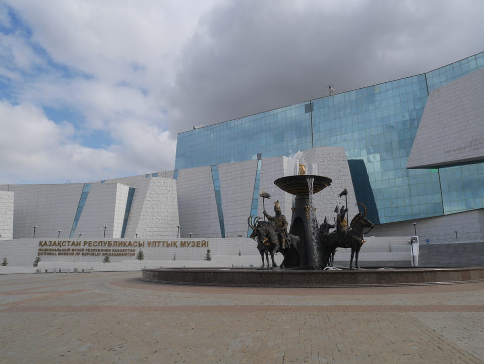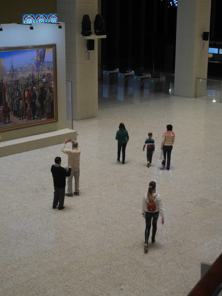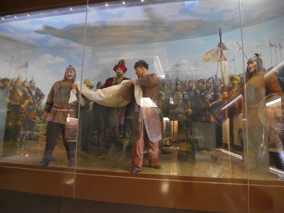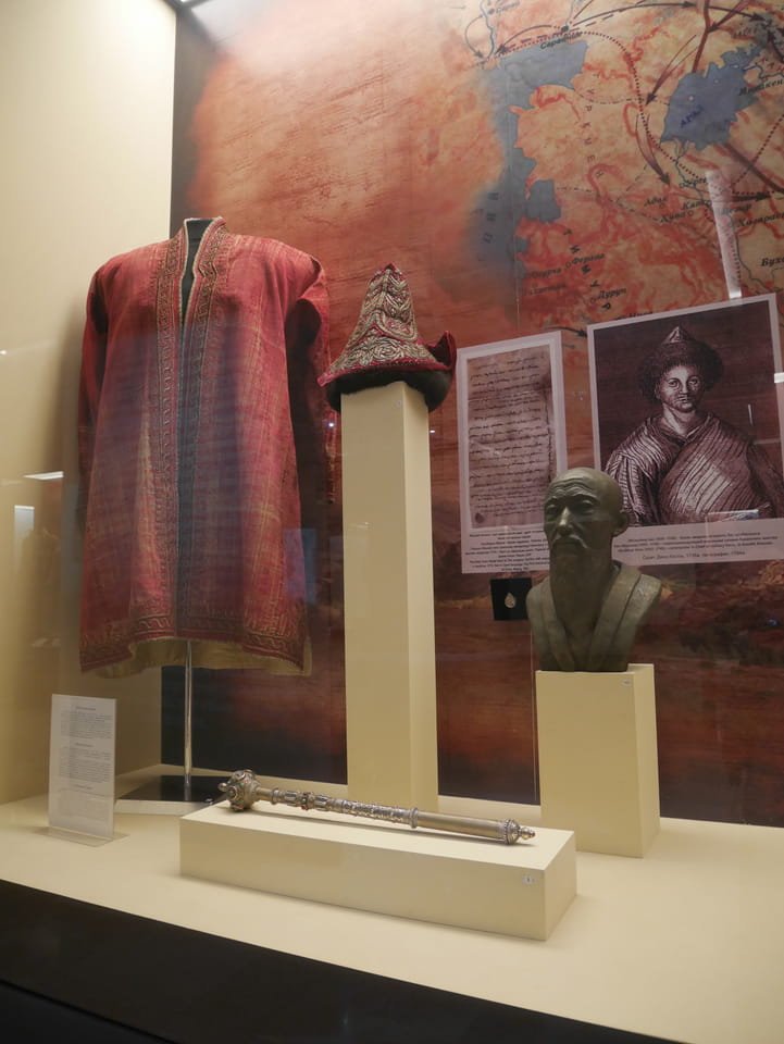 Ich schaute mir alles an. Das Volk der Kasachen mit den ganzen Stämmen wurde seit Stein oder Bronzezeit gut dargestellt. Das weite Land hatte auch einige „Horden“, die mal mehr und weniger Macht hatten. Die Türken waren auch hier und am Ende die Russen halt. Dann flog alles auseinander und so weiter und so fort. Ich fand das alles ganz nett und kam gerade so zum Ende der ganzen Sache. Die Goldzimmer sah ich nicht, eben auch mangels Zeit und Tickets. Ich hatte genug gesehen, so richtig bleib in Museen bei mir nichts hängen. Das wichtigste Stück war wohl der pupurne Mantel des Khan, der über Generationen weitergegeben wurde. Ansonsten waren es hier eben Nomaden, sodass größere Siedlungen spärlich die Zeit überstanden.