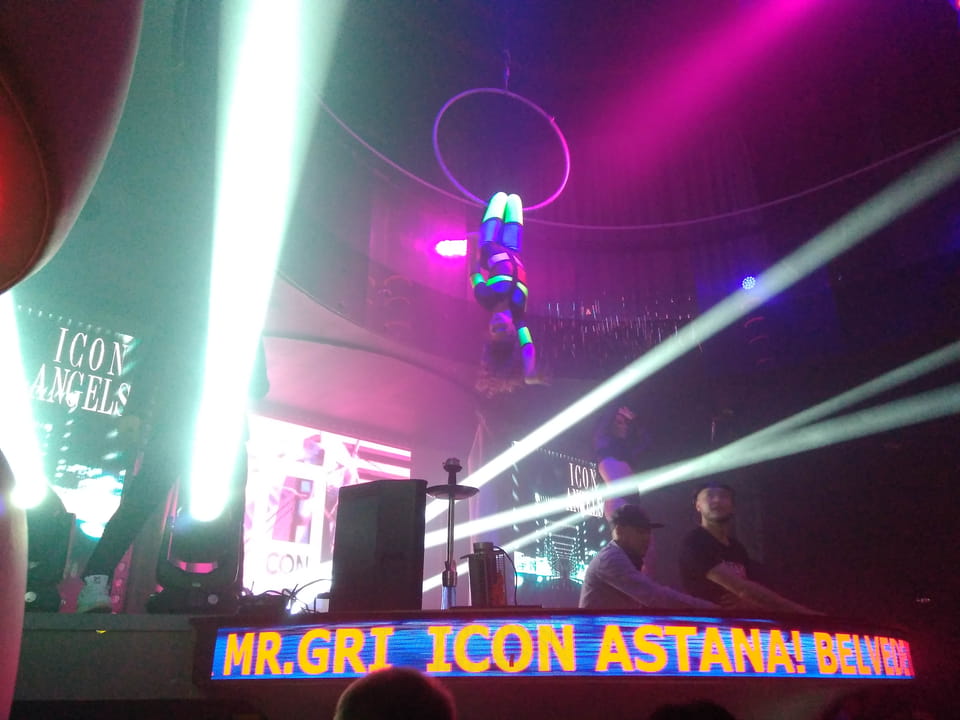 Abends dann wurde es aber ganz nett im Nightlife. Ich fuhr per Taxi zum Icon. Dort kam ich durch die Face Control und musste gepfefferte 7000T (€16) zahlen. Das war das Barguthaben, das sich nach Mitternacht eben von 5 auf 7000 erhöhte. Das reichte für 3 Drinks und ganz gute Laune. Da wurde geturnt und die Musik + Lightshow war auch super. Nette Leute überall doch es rächt sich, dass ich mein Russisch ungenügend ist. Ich blieb lange und am Ende fuhr ich wieder mit ’nem Uber/Yandex Taxi zurück. Da suchte ich ’ne Weile nach dem Fahrer, war schließlich gegen 5 wieder in der Heija.