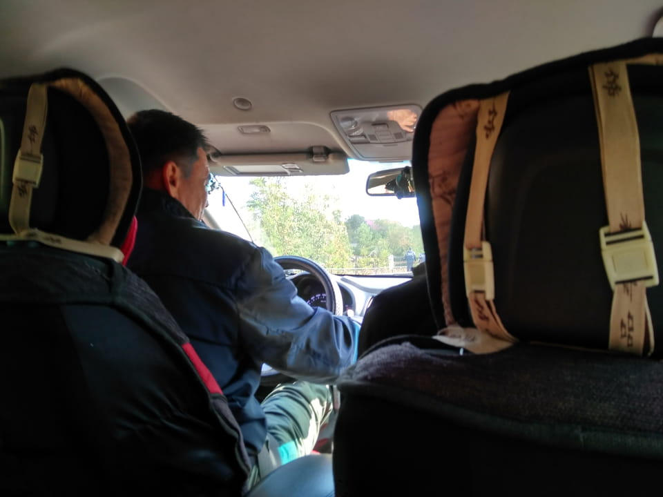 Im Hotel bekam man kein Taxi organisiert. Ich ging also zurück zum Haltepunkt, wo schon ein Auto bereit stand. Zwei Leute drin und der Fahrer auf Ausschau nach dem letzten Mittelplatz. Wir warteten und warteten. Kein weiterer Passagier ließ sich auftreiben. Hier kam die Fahrt 3000 Tenge pro Person, was über €7 sind und am Ende jemandem fehlen. Es ging also nach Shchuchinsk, wo man noch einen Fahrgast fand.