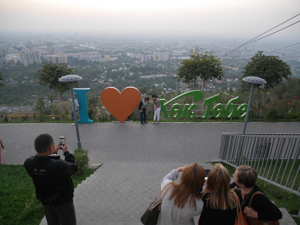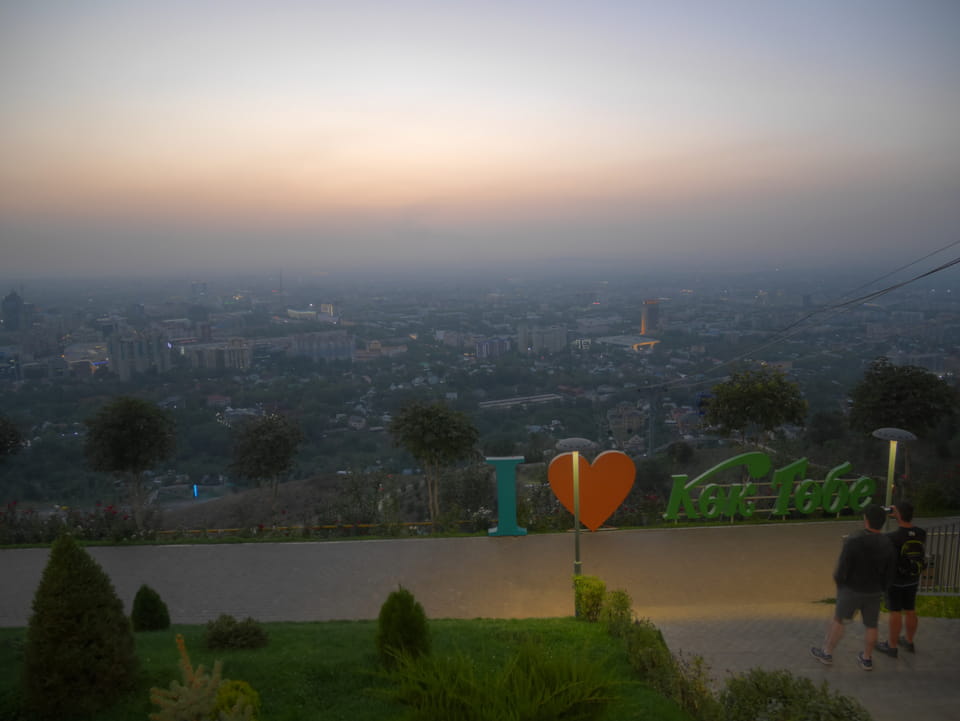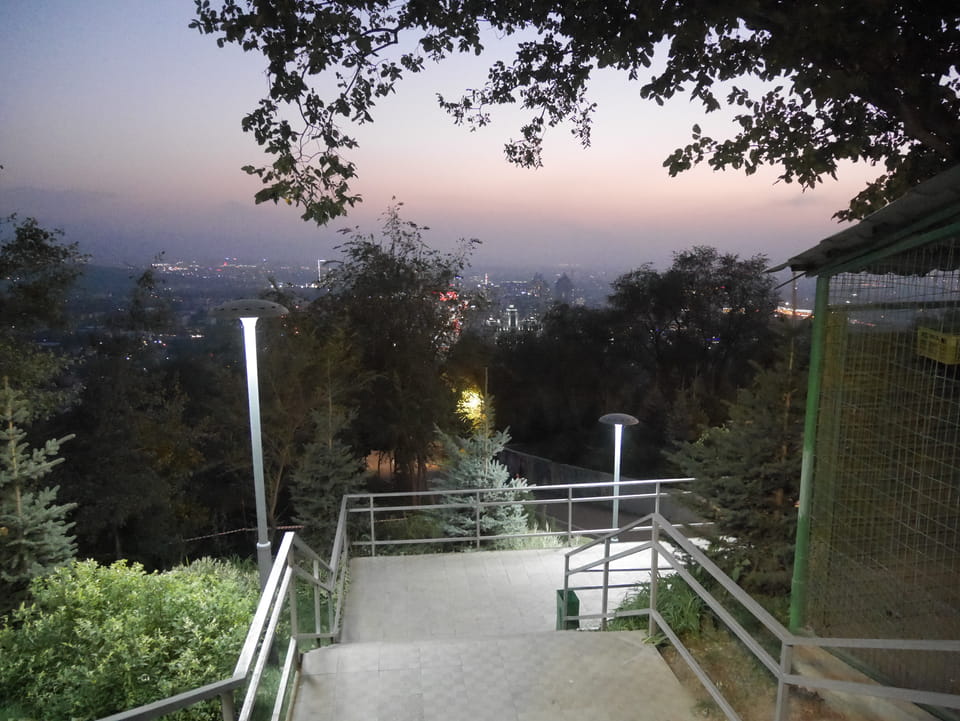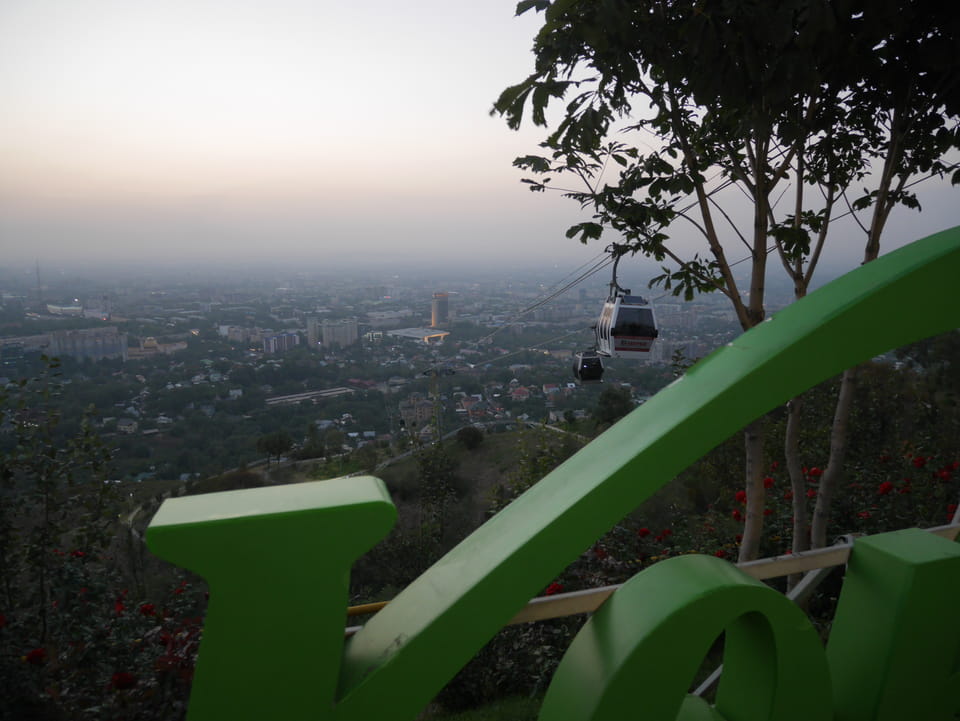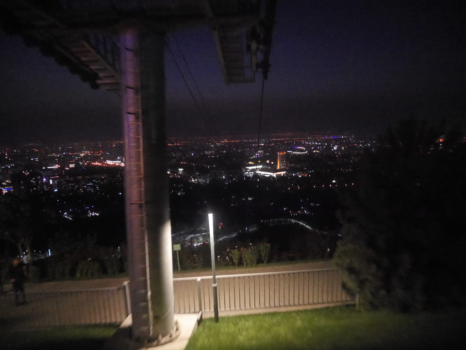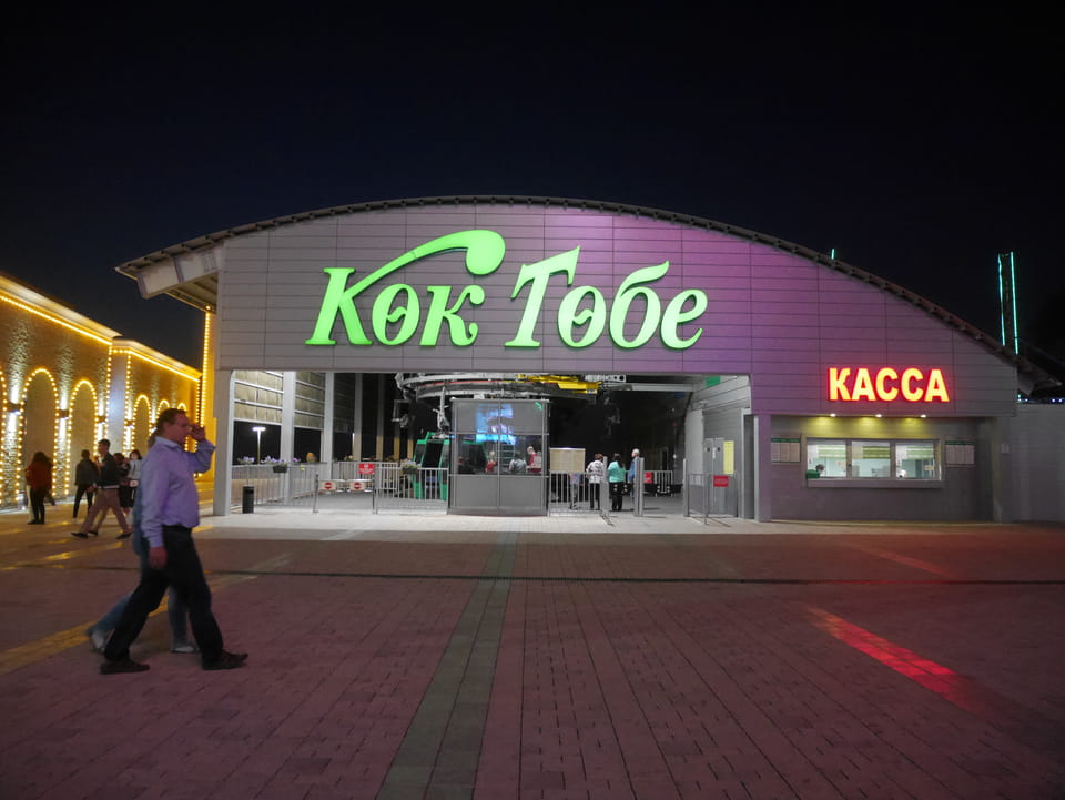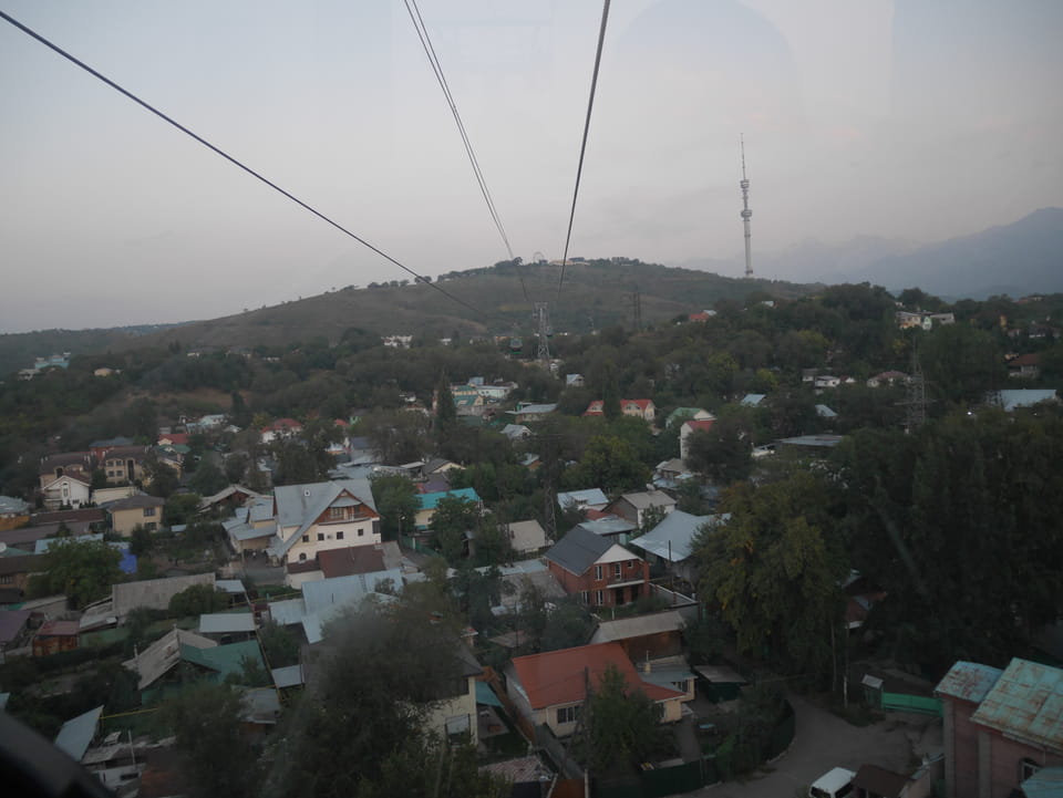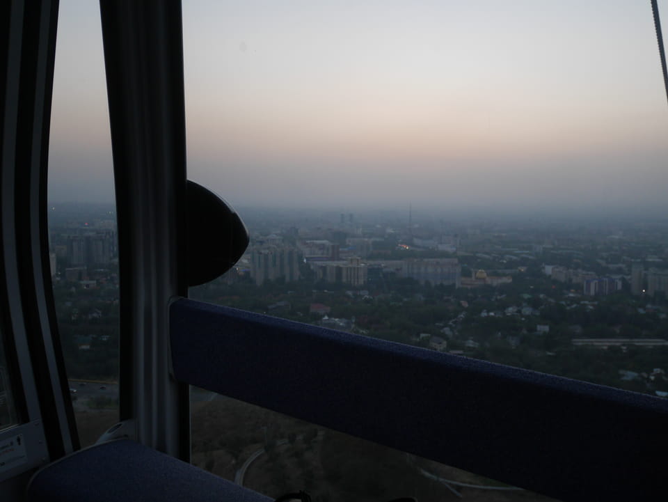 Ich nahm also den nächsten Bus zurück. Jetzt war ich etwas enttäuscht, dass der Tag mit Stunden im Linienbus quasi im Eimer war. Müde und frustriert verfolgte ich auf Google Map dann meine Fahrt in der 63. Dann sah ich, dass es die Drahtseilbahn hoch zu Kok Tobe in der Nähe gab. Inzwischen war’s 19:00 und der Sonnenuntergang rückte näher. Bis ich dort war oben, wäre der Sonnenuntergang vorüber aber egal. Für 2000 Tenge gab’s den Round-Trip per Schwebebahn und so saß ich schnell in der Gondel. Hoch auf ’nen Unterhaltungshügel wieder mal, wie es sie in den Sovjet-Städten oft gab. Da oben war’s ganz nett. Die Aussicht auf Almaty verbesserte sich mit den Lichtern der Stadt. Fahrgeschäfte und Knabberläden suchten nach Kunden. Eine Handvoll westlicher Touristen stieg auch herum. Alles OK und besser als nichts.