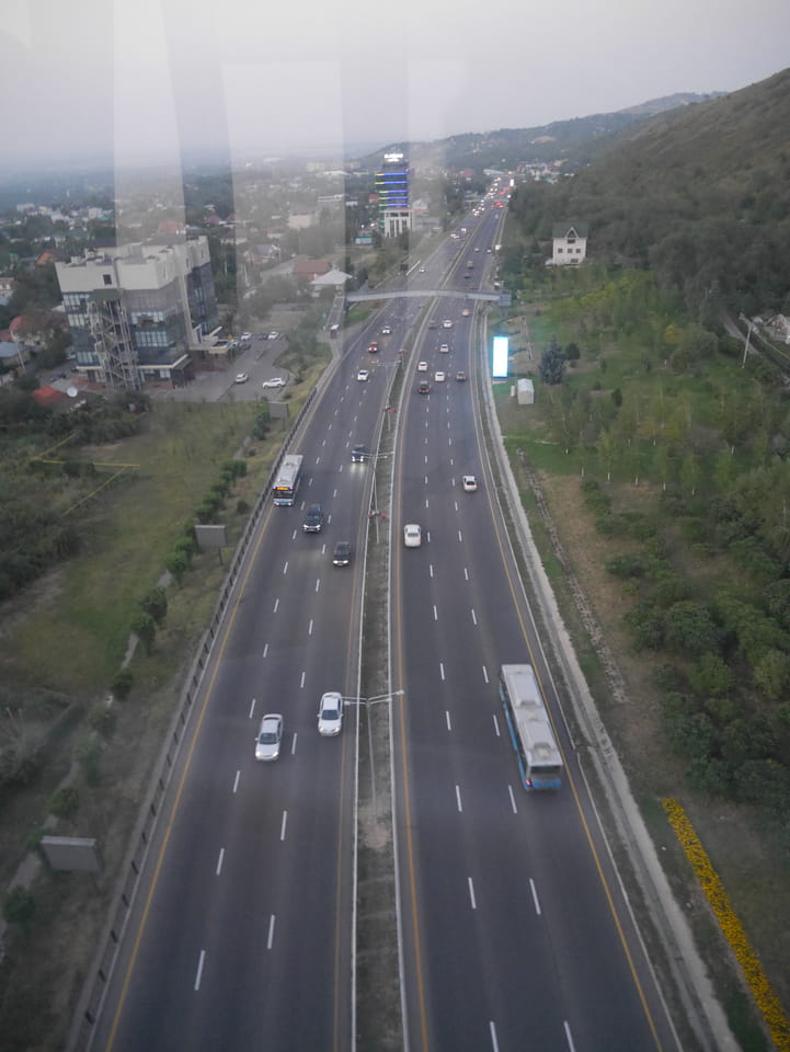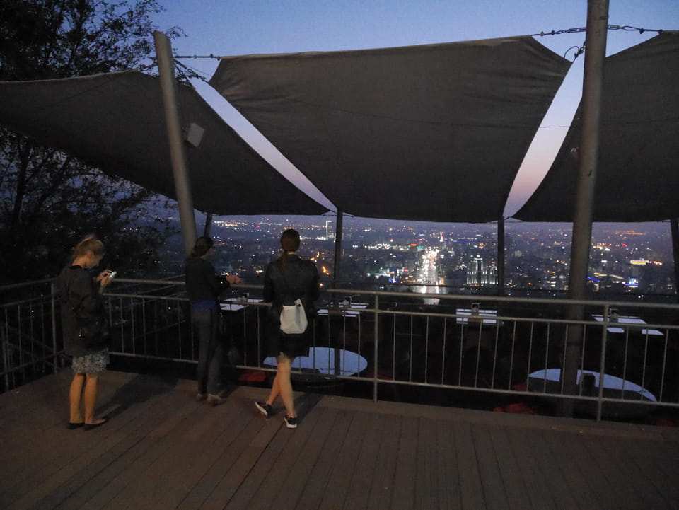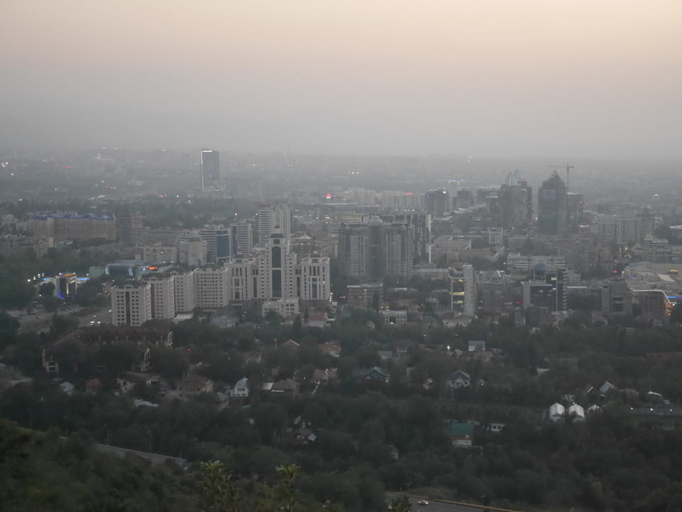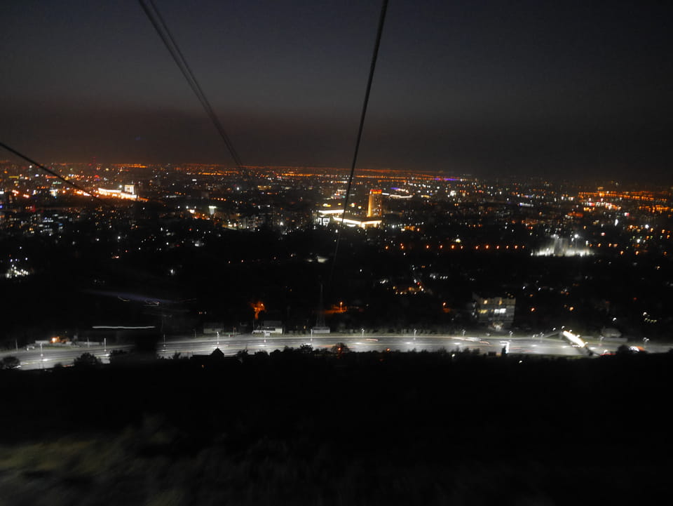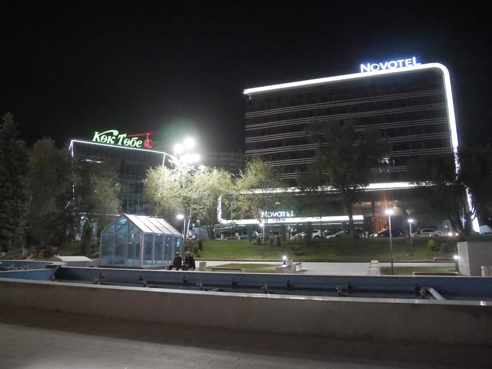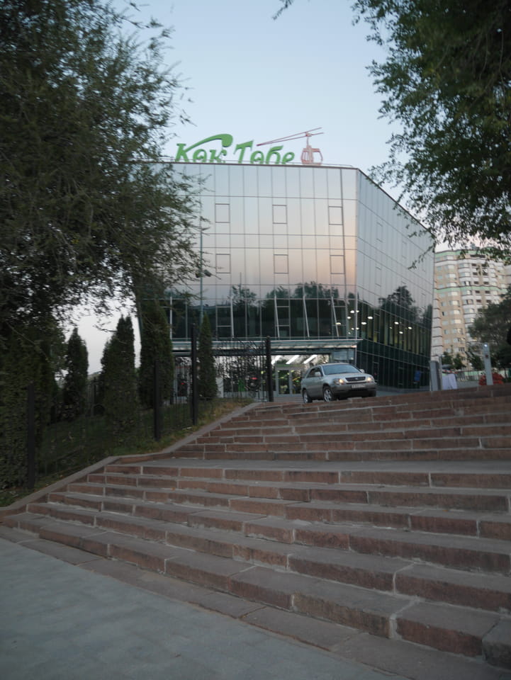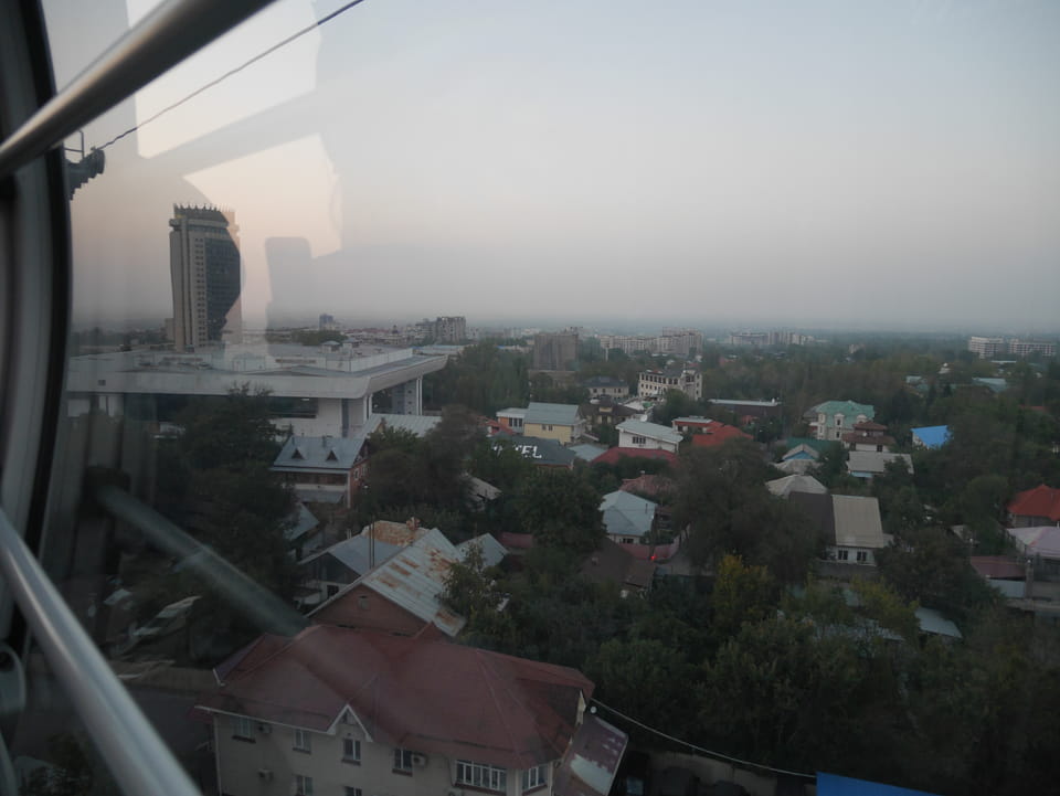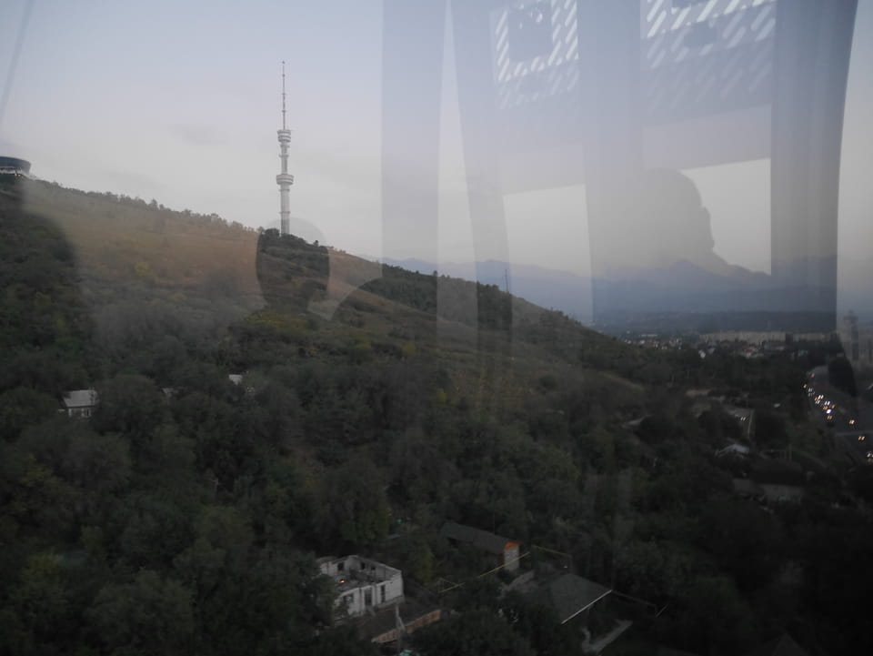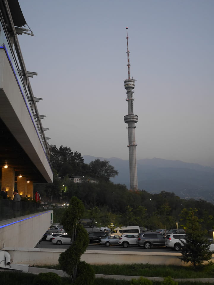 Ich nahm also den nächsten Bus zurück. Jetzt war ich etwas enttäuscht, dass der Tag mit Stunden im Linienbus quasi im Eimer war. Müde und frustriert verfolgte ich auf Google Map dann meine Fahrt in der 63. Dann sah ich, dass es die Drahtseilbahn hoch zu Kok Tobe in der Nähe gab. Inzwischen war’s 19:00 und der Sonnenuntergang rückte näher. Bis ich dort war oben, wäre der Sonnenuntergang vorüber aber egal. Für 2000 Tenge gab’s den Round-Trip per Schwebebahn und so saß ich schnell in der Gondel. Hoch auf ’nen Unterhaltungshügel wieder mal, wie es sie in den Sovjet-Städten oft gab. Da oben war’s ganz nett. Die Aussicht auf Almaty verbesserte sich mit den Lichtern der Stadt. Fahrgeschäfte und Knabberläden suchten nach Kunden. Eine Handvoll westlicher Touristen stieg auch herum. Alles OK und besser als nichts.