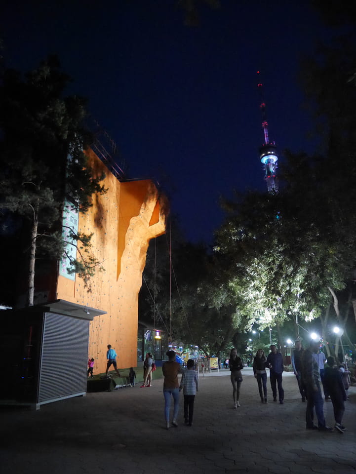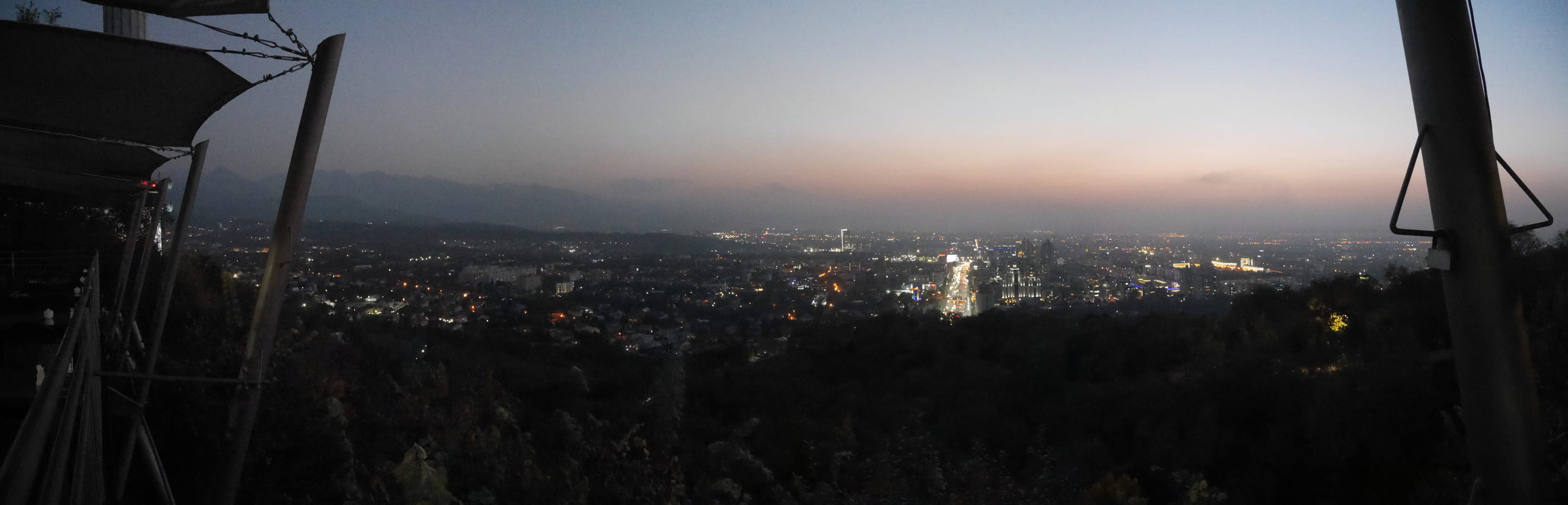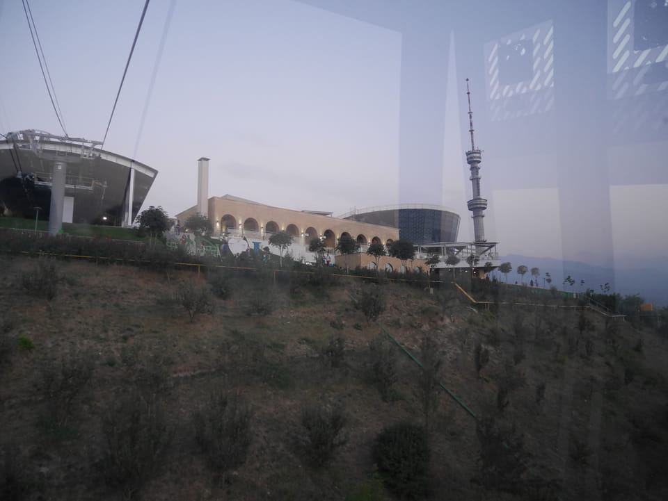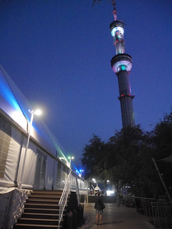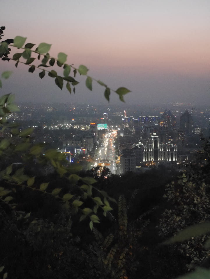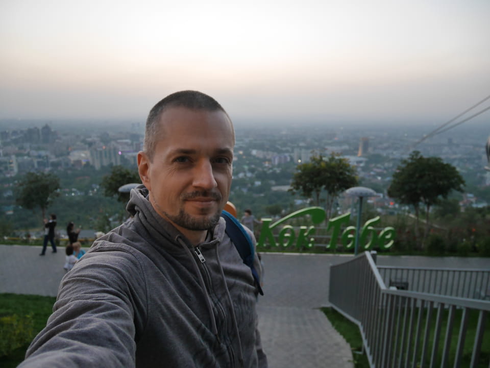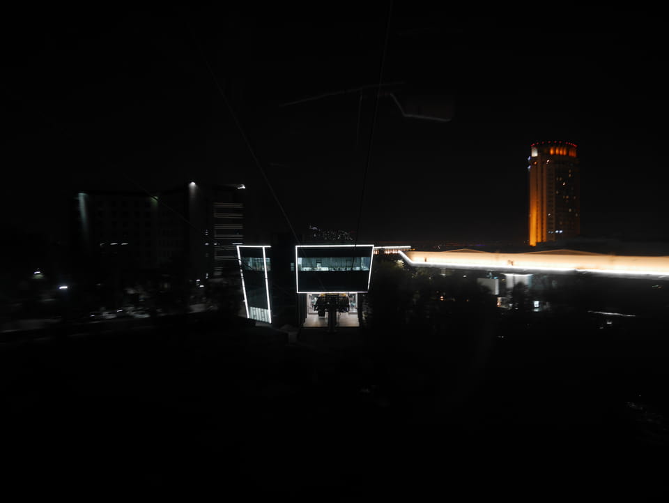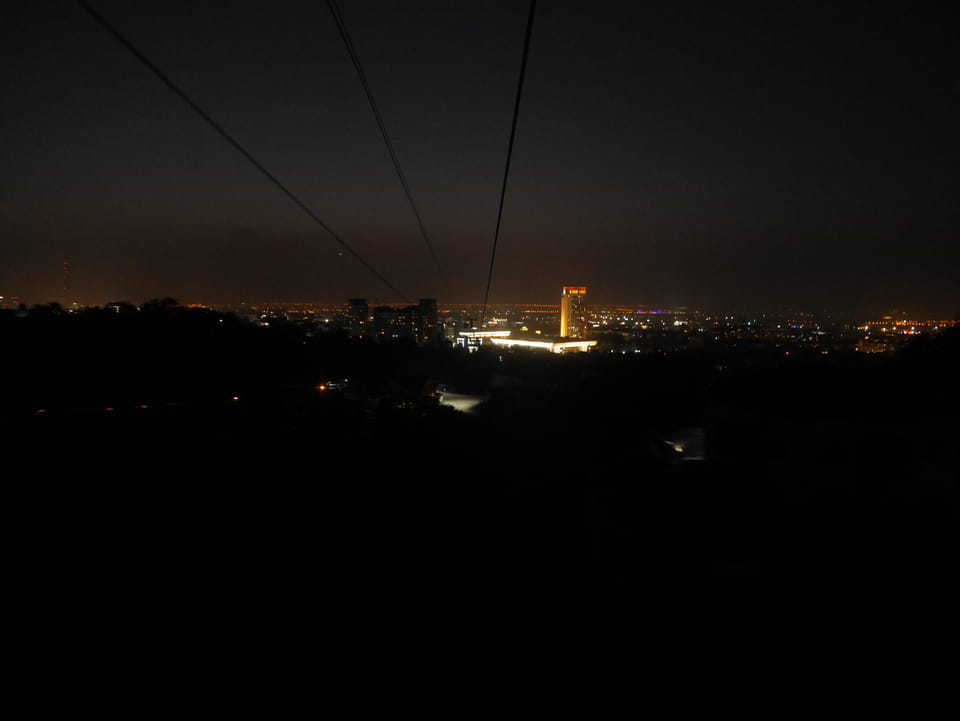 Ich nahm also den nächsten Bus zurück. Jetzt war ich etwas enttäuscht, dass der Tag mit Stunden im Linienbus quasi im Eimer war. Müde und frustriert verfolgte ich auf Google Map dann meine Fahrt in der 63. Dann sah ich, dass es die Drahtseilbahn hoch zu Kok Tobe in der Nähe gab. Inzwischen war’s 19:00 und der Sonnenuntergang rückte näher. Bis ich dort war oben, wäre der Sonnenuntergang vorüber aber egal. Für 2000 Tenge gab’s den Round-Trip per Schwebebahn und so saß ich schnell in der Gondel. Hoch auf ’nen Unterhaltungshügel wieder mal, wie es sie in den Sovjet-Städten oft gab. Da oben war’s ganz nett. Die Aussicht auf Almaty verbesserte sich mit den Lichtern der Stadt. Fahrgeschäfte und Knabberläden suchten nach Kunden. Eine Handvoll westlicher Touristen stieg auch herum. Alles OK und besser als nichts.