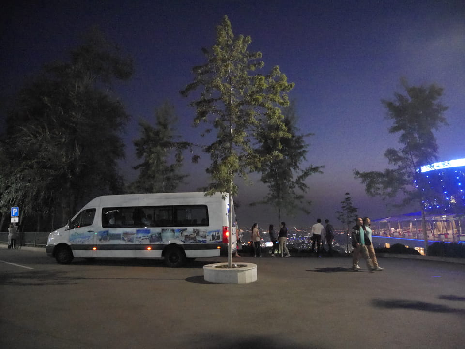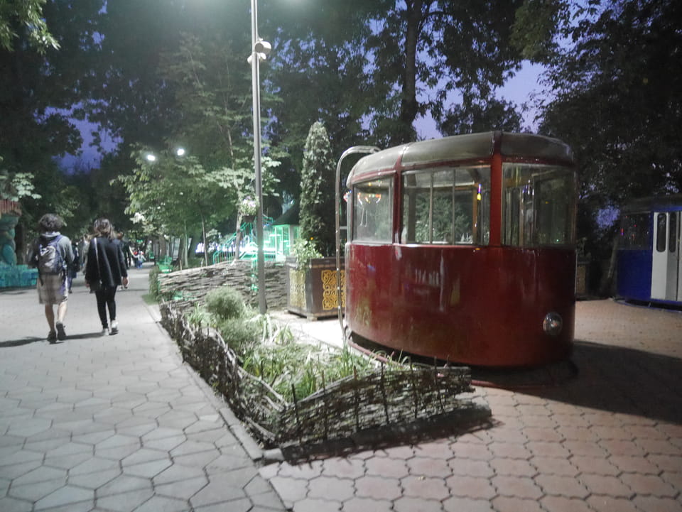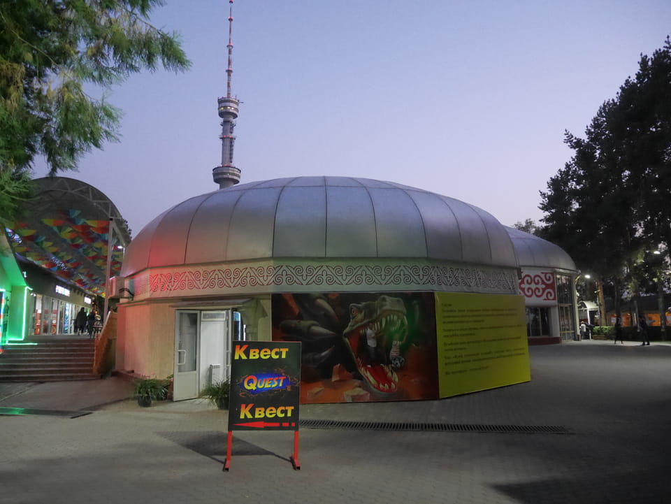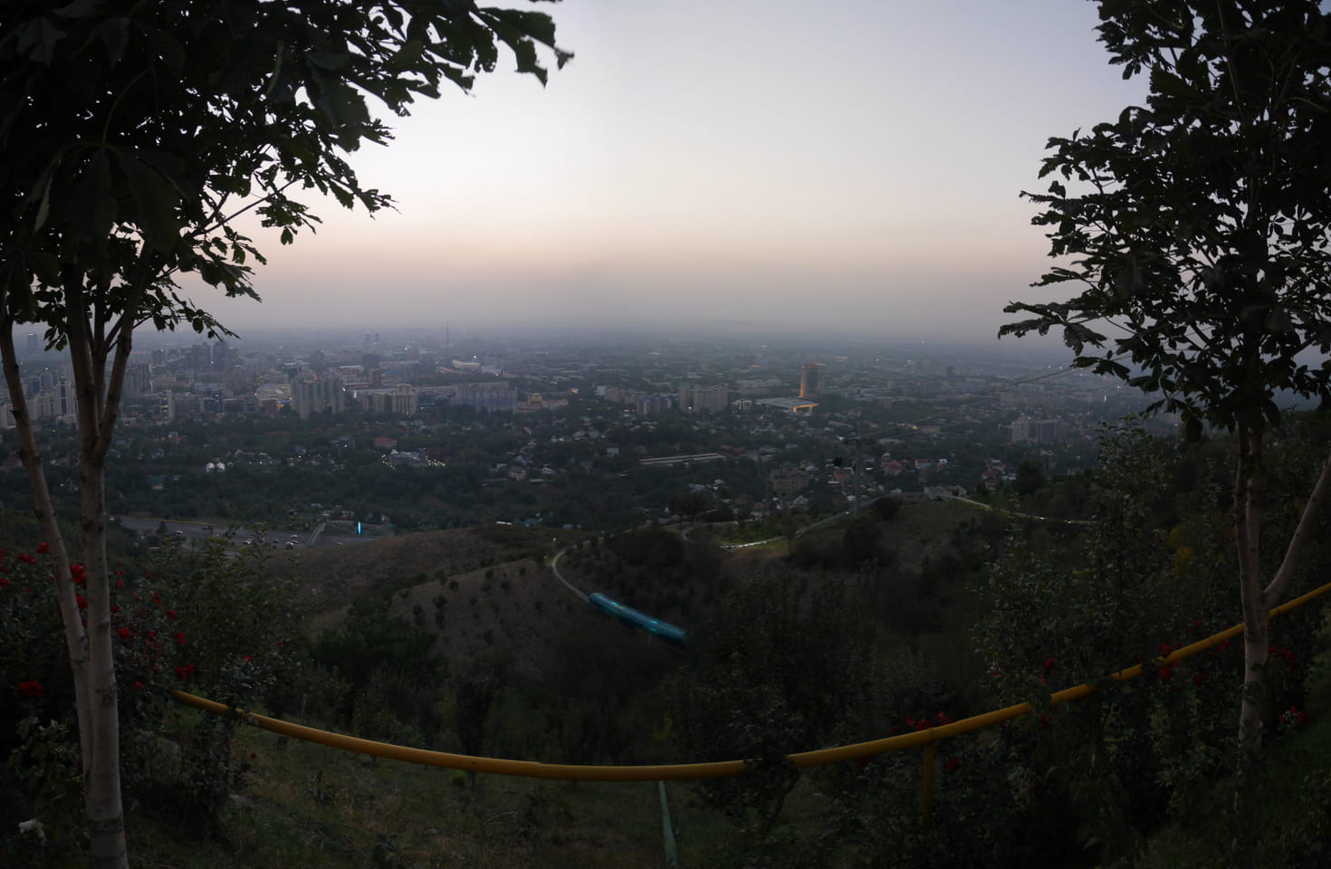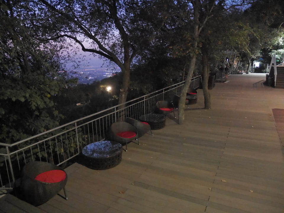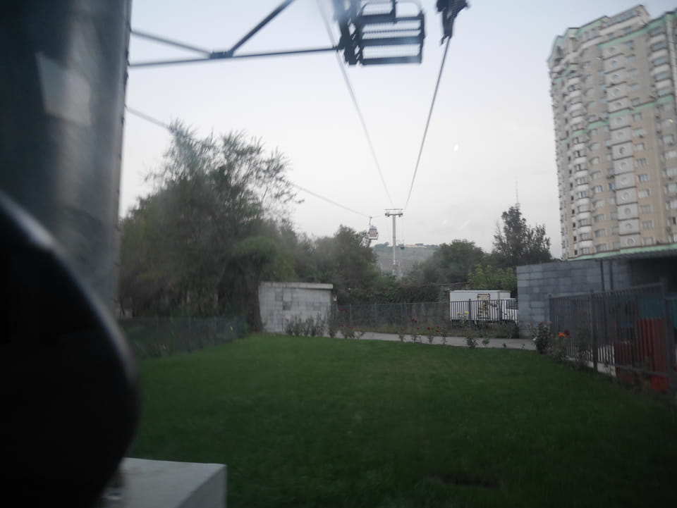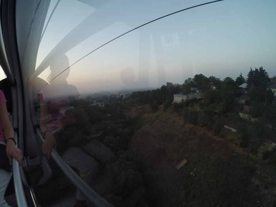 Ich nahm also den nächsten Bus zurück. Jetzt war ich etwas enttäuscht, dass der Tag mit Stunden im Linienbus quasi im Eimer war. Müde und frustriert verfolgte ich auf Google Map dann meine Fahrt in der 63. Dann sah ich, dass es die Drahtseilbahn hoch zu Kok Tobe in der Nähe gab. Inzwischen war’s 19:00 und der Sonnenuntergang rückte näher. Bis ich dort war oben, wäre der Sonnenuntergang vorüber aber egal. Für 2000 Tenge gab’s den Round-Trip per Schwebebahn und so saß ich schnell in der Gondel. Hoch auf ’nen Unterhaltungshügel wieder mal, wie es sie in den Sovjet-Städten oft gab. Da oben war’s ganz nett. Die Aussicht auf Almaty verbesserte sich mit den Lichtern der Stadt. Fahrgeschäfte und Knabberläden suchten nach Kunden. Eine Handvoll westlicher Touristen stieg auch herum. Alles OK und besser als nichts.