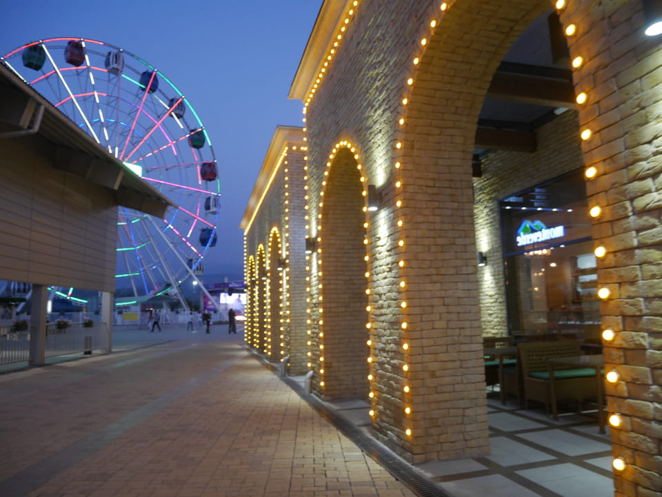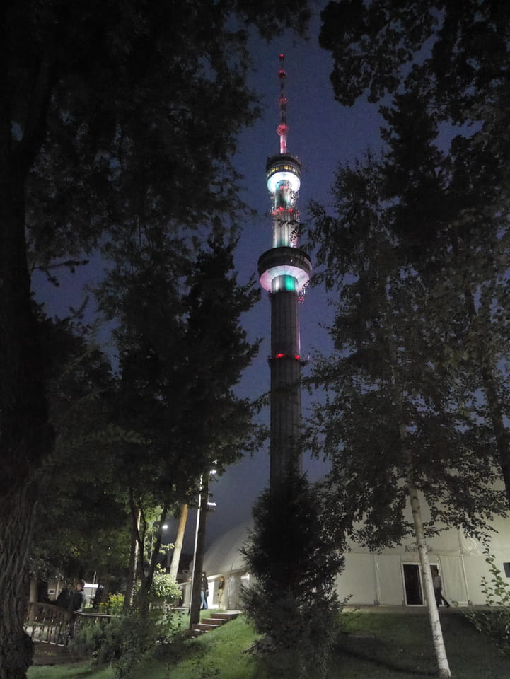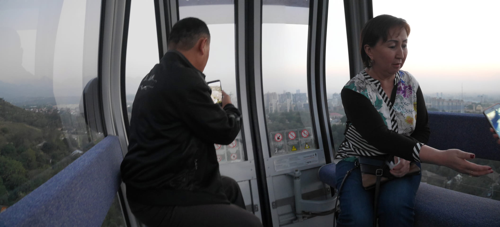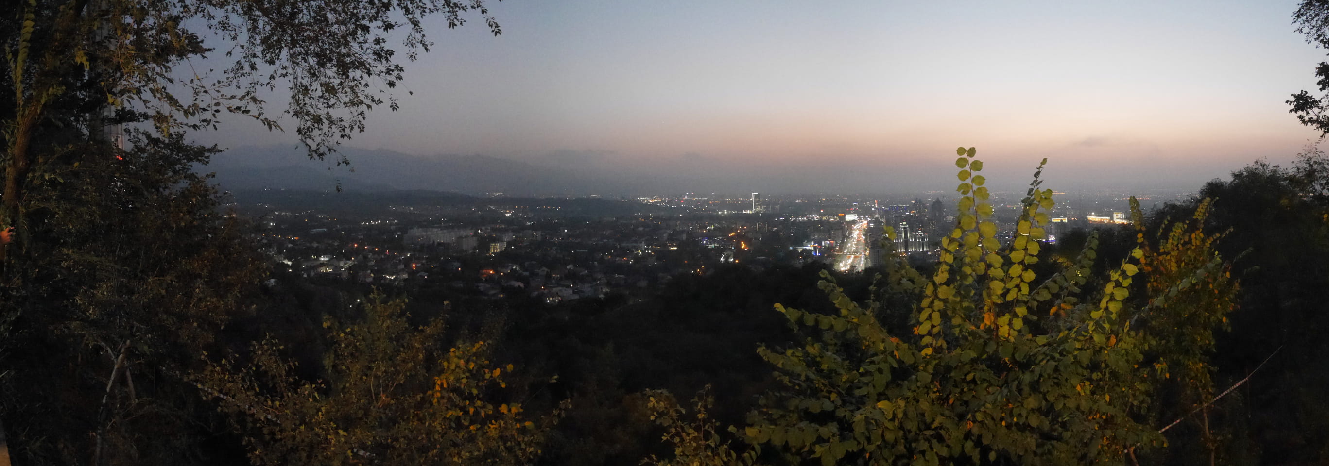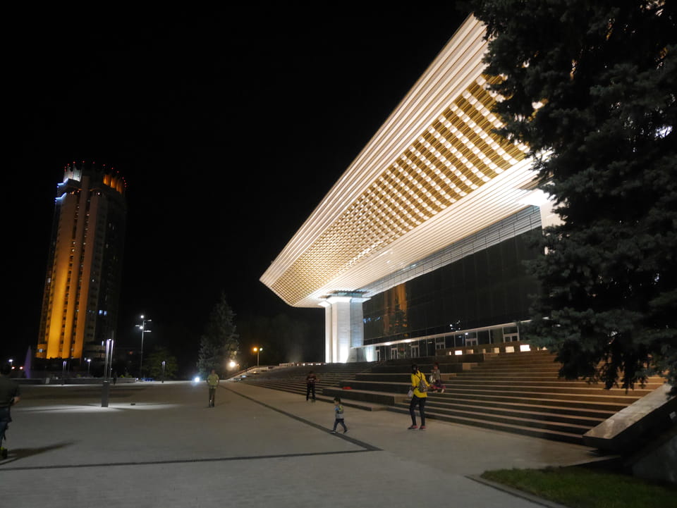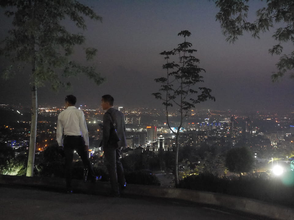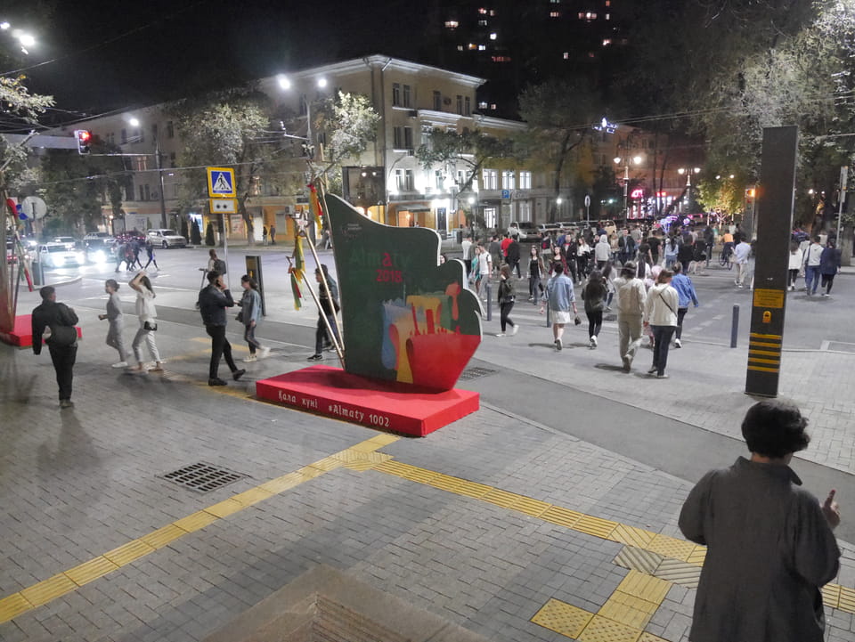 Ich nahm also den nächsten Bus zurück. Jetzt war ich etwas enttäuscht, dass der Tag mit Stunden im Linienbus quasi im Eimer war. Müde und frustriert verfolgte ich auf Google Map dann meine Fahrt in der 63. Dann sah ich, dass es die Drahtseilbahn hoch zu Kok Tobe in der Nähe gab. Inzwischen war’s 19:00 und der Sonnenuntergang rückte näher. Bis ich dort war oben, wäre der Sonnenuntergang vorüber aber egal. Für 2000 Tenge gab’s den Round-Trip per Schwebebahn und so saß ich schnell in der Gondel. Hoch auf ’nen Unterhaltungshügel wieder mal, wie es sie in den Sovjet-Städten oft gab. Da oben war’s ganz nett. Die Aussicht auf Almaty verbesserte sich mit den Lichtern der Stadt. Fahrgeschäfte und Knabberläden suchten nach Kunden. Eine Handvoll westlicher Touristen stieg auch herum. Alles OK und besser als nichts.