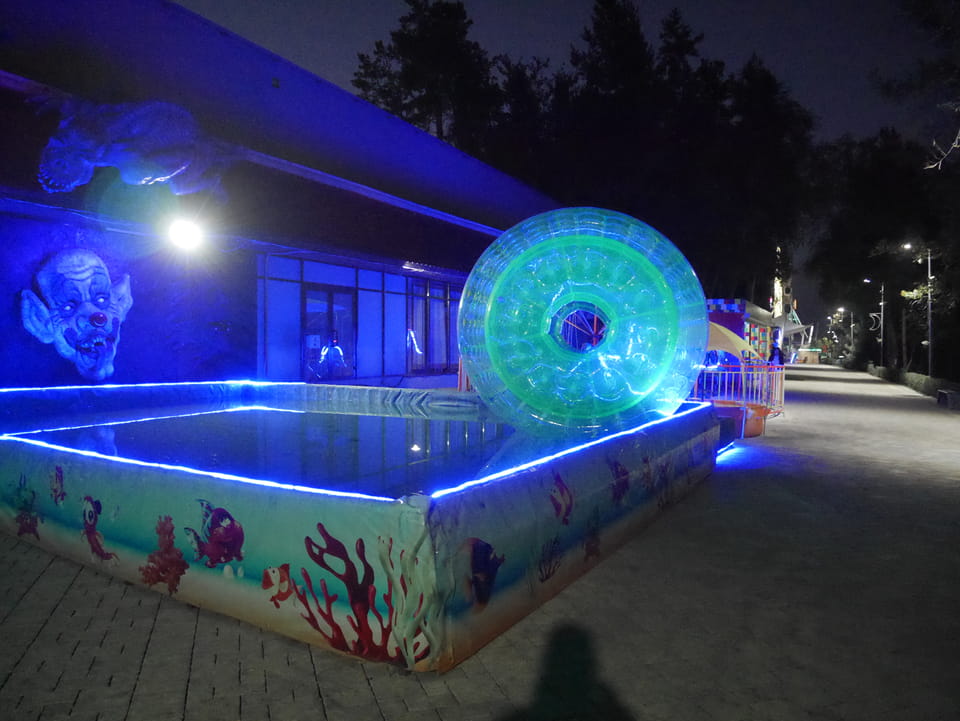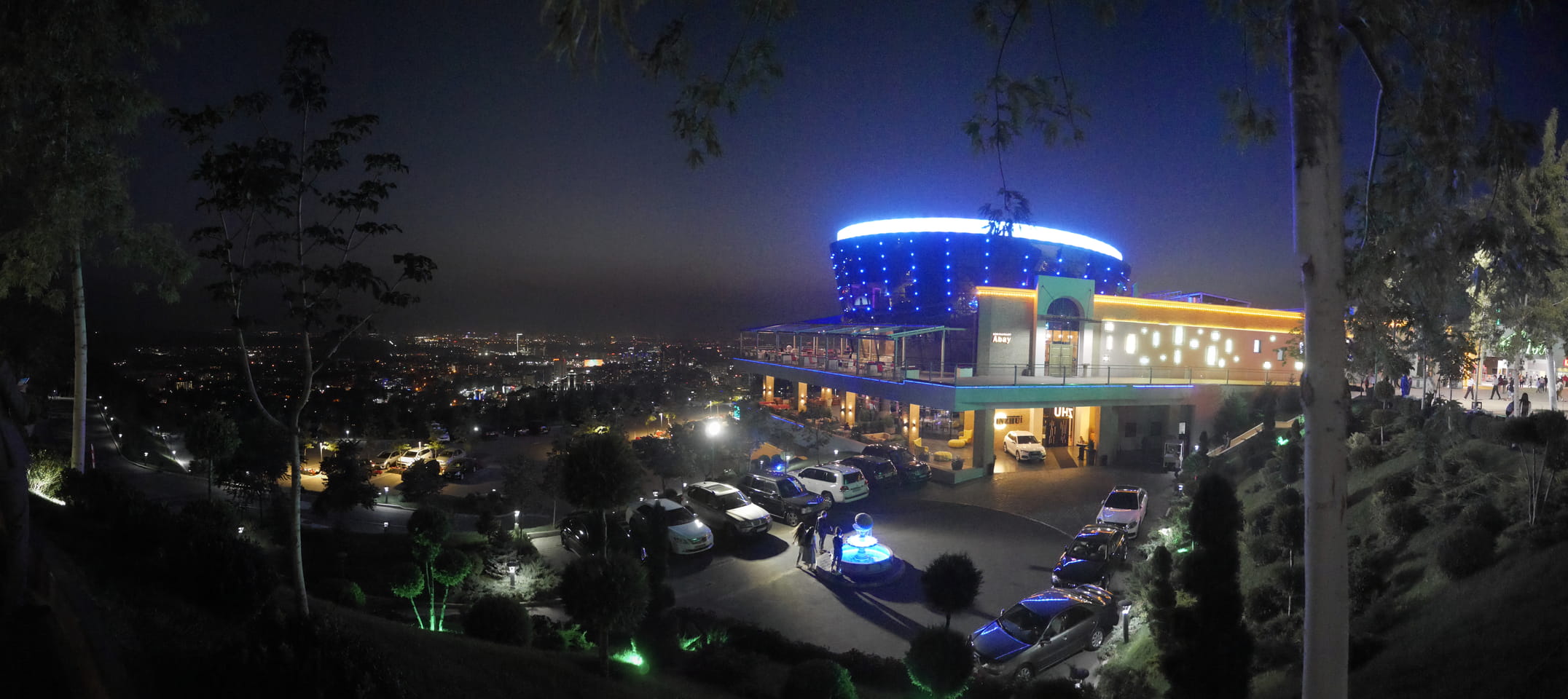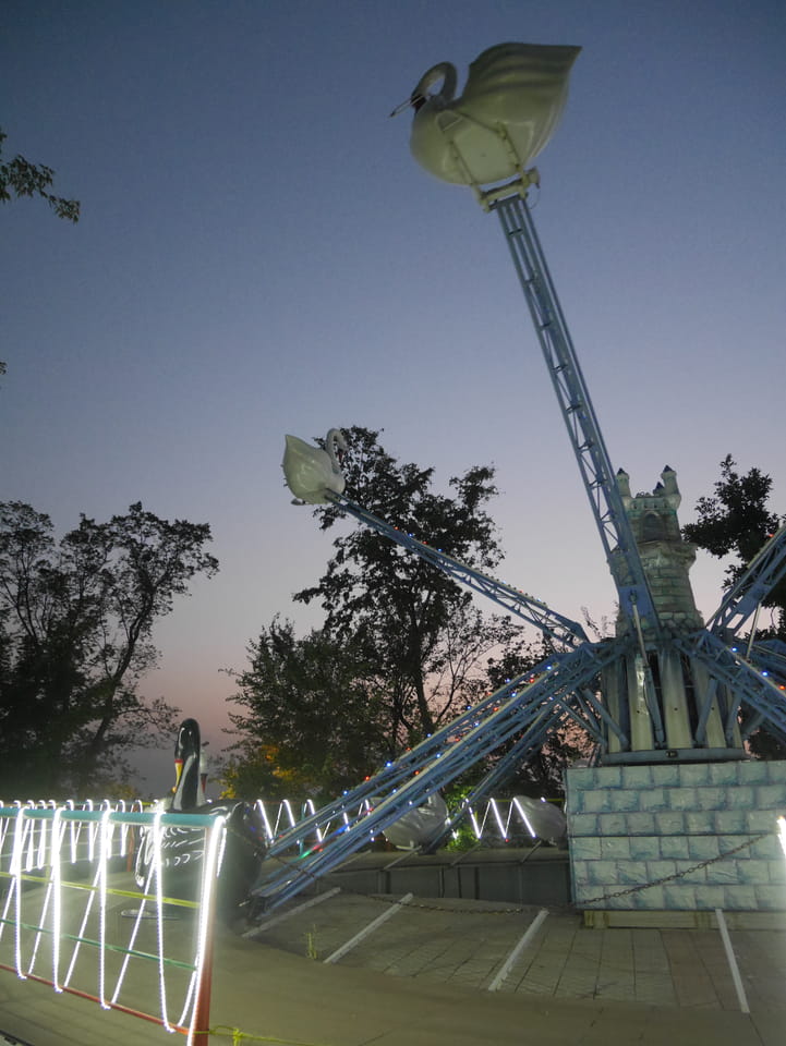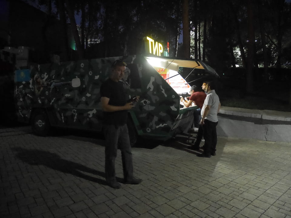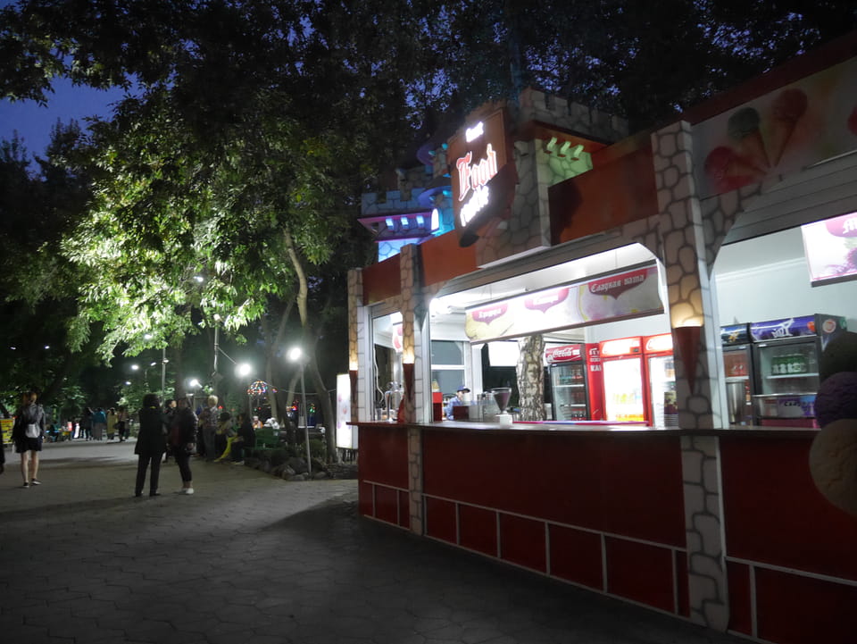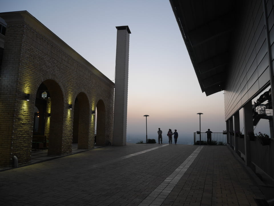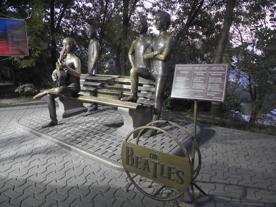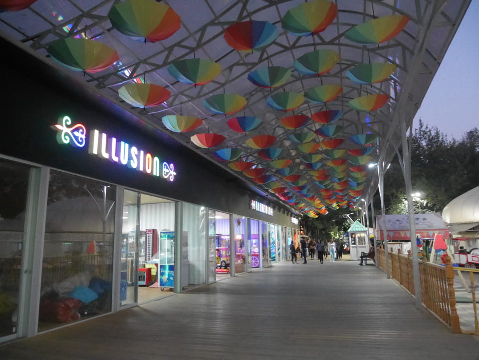 Ich nahm also den nächsten Bus zurück. Jetzt war ich etwas enttäuscht, dass der Tag mit Stunden im Linienbus quasi im Eimer war. Müde und frustriert verfolgte ich auf Google Map dann meine Fahrt in der 63. Dann sah ich, dass es die Drahtseilbahn hoch zu Kok Tobe in der Nähe gab. Inzwischen war’s 19:00 und der Sonnenuntergang rückte näher. Bis ich dort war oben, wäre der Sonnenuntergang vorüber aber egal. Für 2000 Tenge gab’s den Round-Trip per Schwebebahn und so saß ich schnell in der Gondel. Hoch auf ’nen Unterhaltungshügel wieder mal, wie es sie in den Sovjet-Städten oft gab. Da oben war’s ganz nett. Die Aussicht auf Almaty verbesserte sich mit den Lichtern der Stadt. Fahrgeschäfte und Knabberläden suchten nach Kunden. Eine Handvoll westlicher Touristen stieg auch herum. Alles OK und besser als nichts.