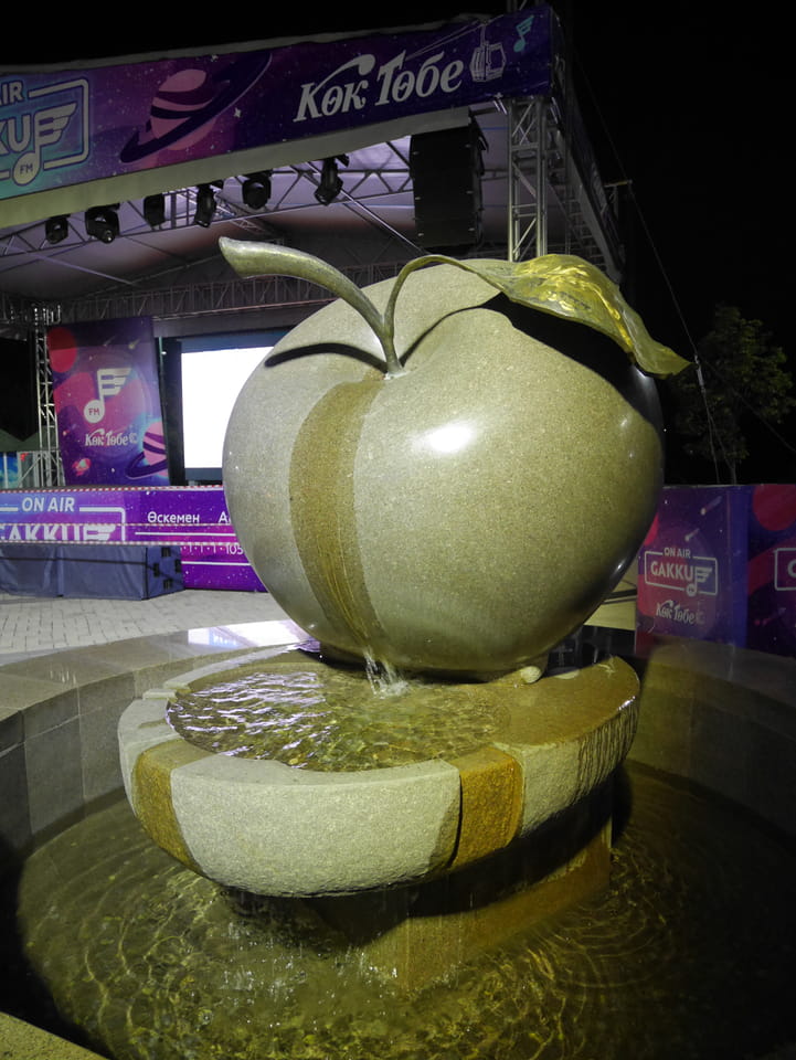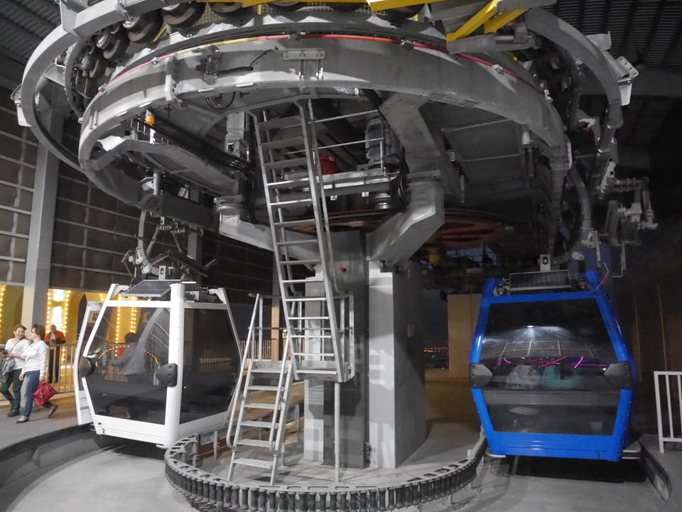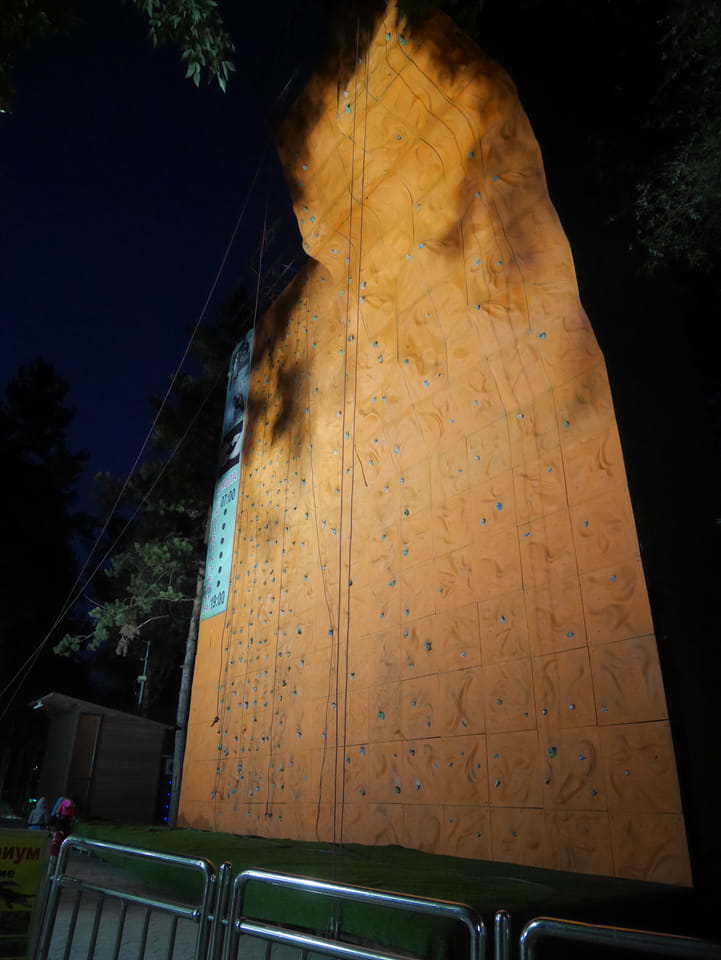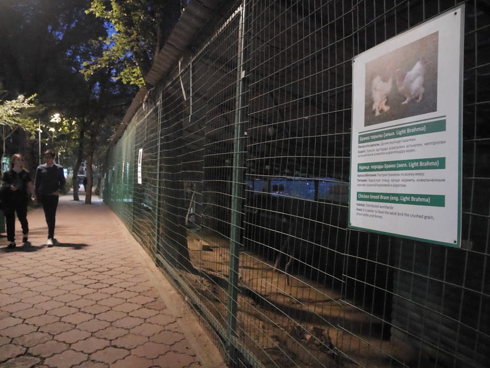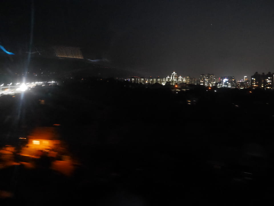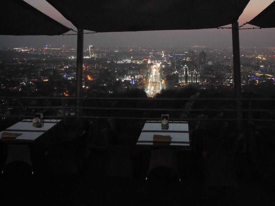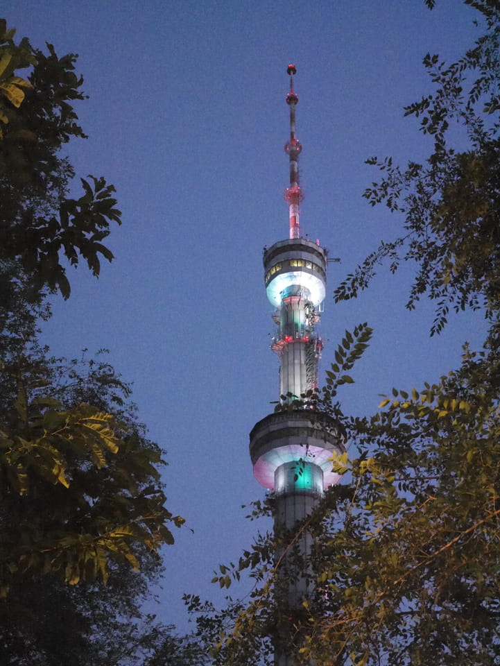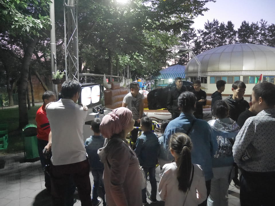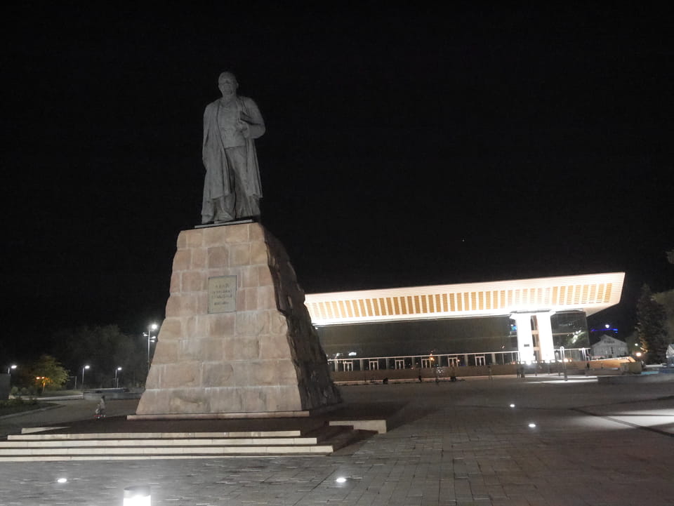 Ich nahm also den nächsten Bus zurück. Jetzt war ich etwas enttäuscht, dass der Tag mit Stunden im Linienbus quasi im Eimer war. Müde und frustriert verfolgte ich auf Google Map dann meine Fahrt in der 63. Dann sah ich, dass es die Drahtseilbahn hoch zu Kok Tobe in der Nähe gab. Inzwischen war’s 19:00 und der Sonnenuntergang rückte näher. Bis ich dort war oben, wäre der Sonnenuntergang vorüber aber egal. Für 2000 Tenge gab’s den Round-Trip per Schwebebahn und so saß ich schnell in der Gondel. Hoch auf ’nen Unterhaltungshügel wieder mal, wie es sie in den Sovjet-Städten oft gab. Da oben war’s ganz nett. Die Aussicht auf Almaty verbesserte sich mit den Lichtern der Stadt. Fahrgeschäfte und Knabberläden suchten nach Kunden. Eine Handvoll westlicher Touristen stieg auch herum. Alles OK und besser als nichts.