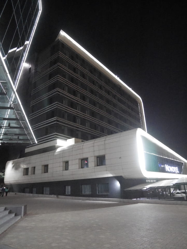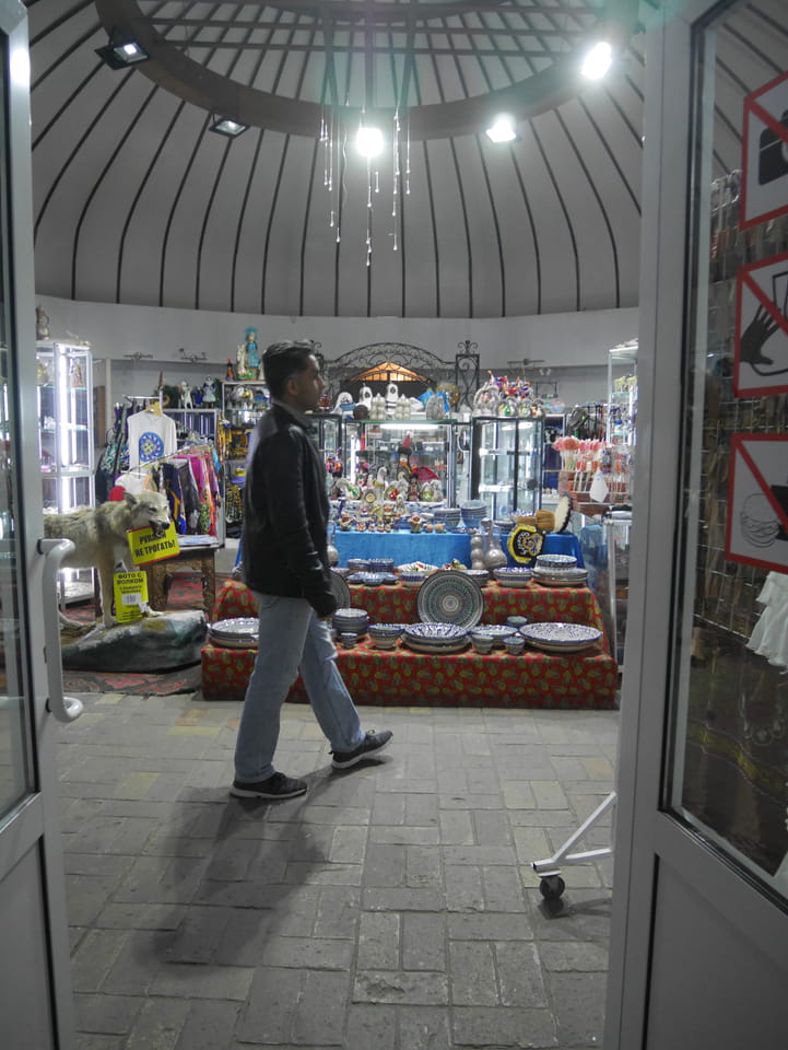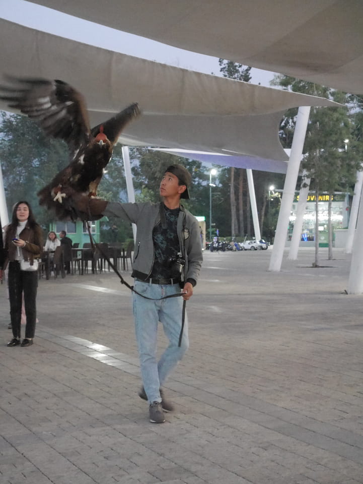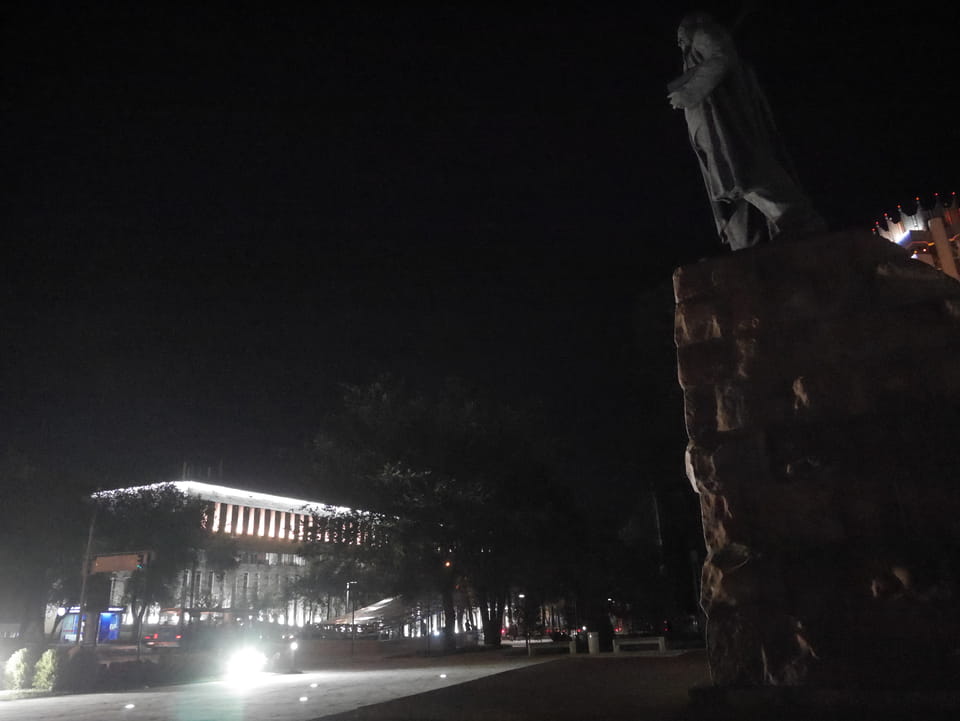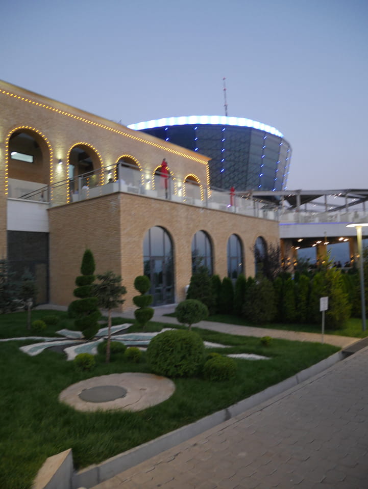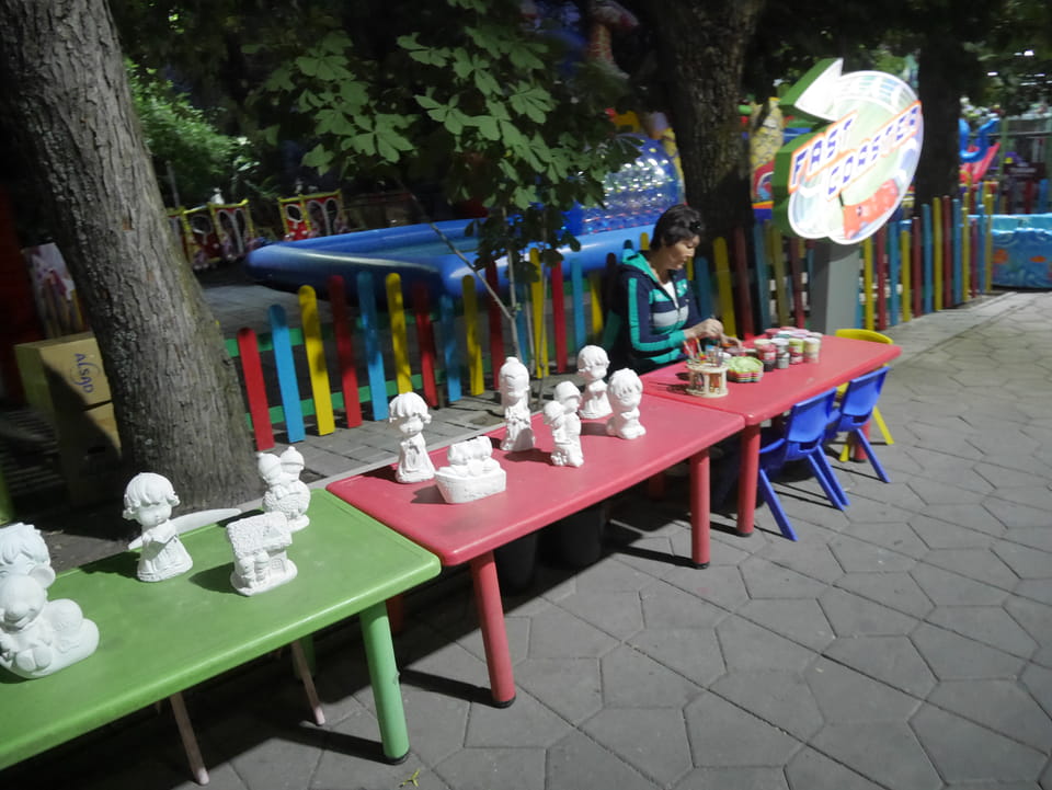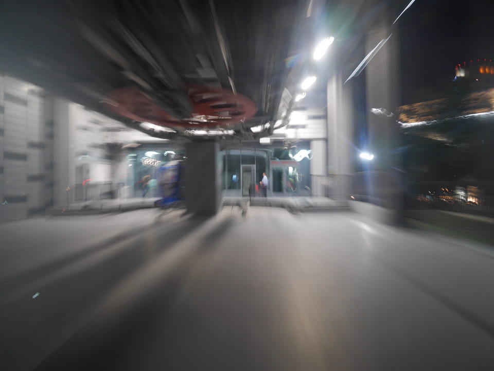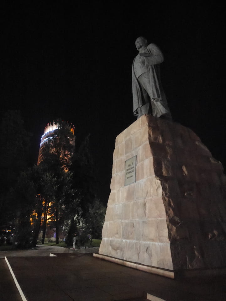 Ich nahm also den nächsten Bus zurück. Jetzt war ich etwas enttäuscht, dass der Tag mit Stunden im Linienbus quasi im Eimer war. Müde und frustriert verfolgte ich auf Google Map dann meine Fahrt in der 63. Dann sah ich, dass es die Drahtseilbahn hoch zu Kok Tobe in der Nähe gab. Inzwischen war’s 19:00 und der Sonnenuntergang rückte näher. Bis ich dort war oben, wäre der Sonnenuntergang vorüber aber egal. Für 2000 Tenge gab’s den Round-Trip per Schwebebahn und so saß ich schnell in der Gondel. Hoch auf ’nen Unterhaltungshügel wieder mal, wie es sie in den Sovjet-Städten oft gab. Da oben war’s ganz nett. Die Aussicht auf Almaty verbesserte sich mit den Lichtern der Stadt. Fahrgeschäfte und Knabberläden suchten nach Kunden. Eine Handvoll westlicher Touristen stieg auch herum. Alles OK und besser als nichts.