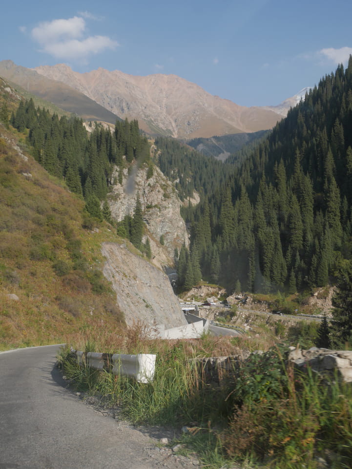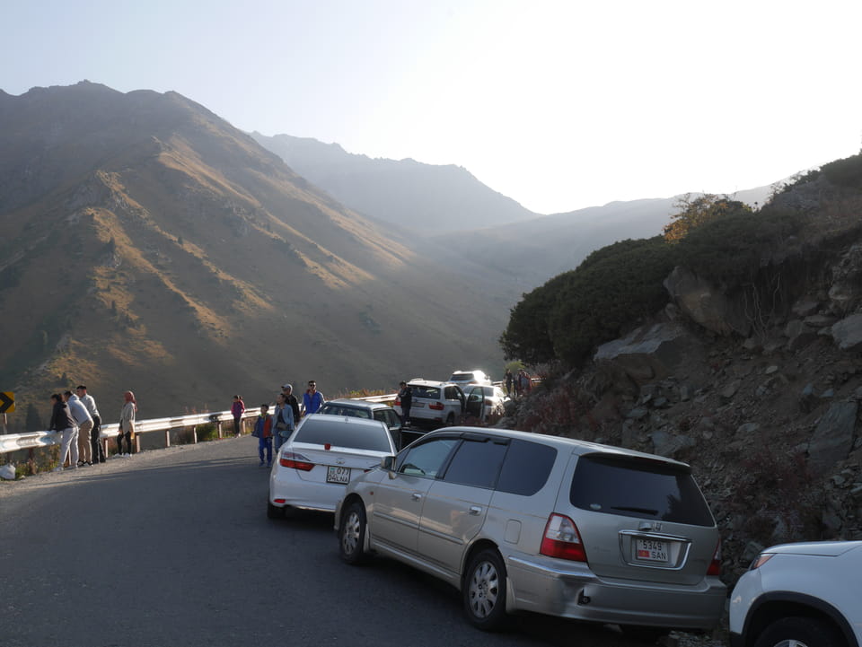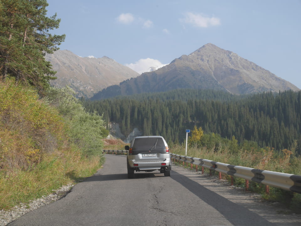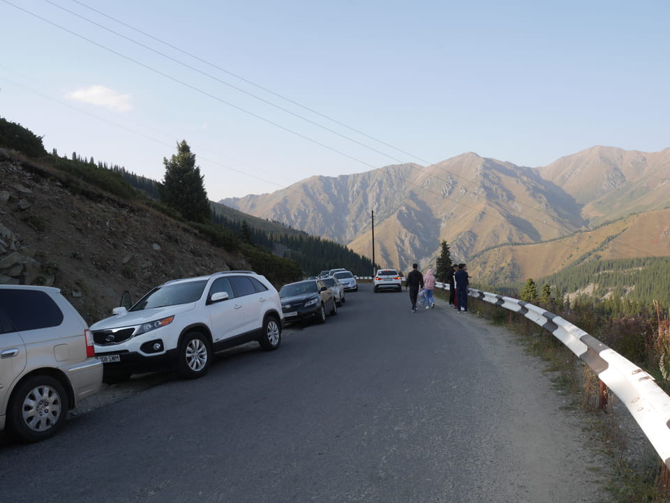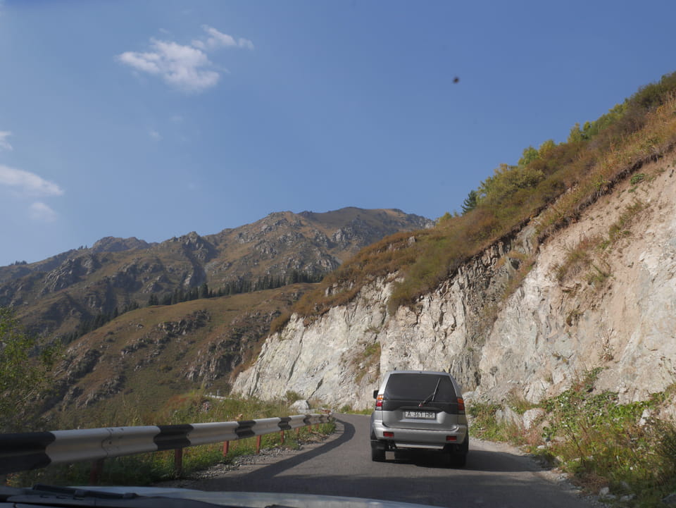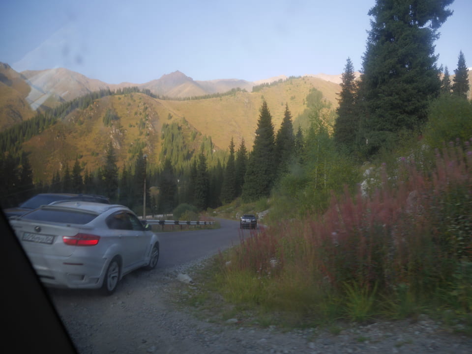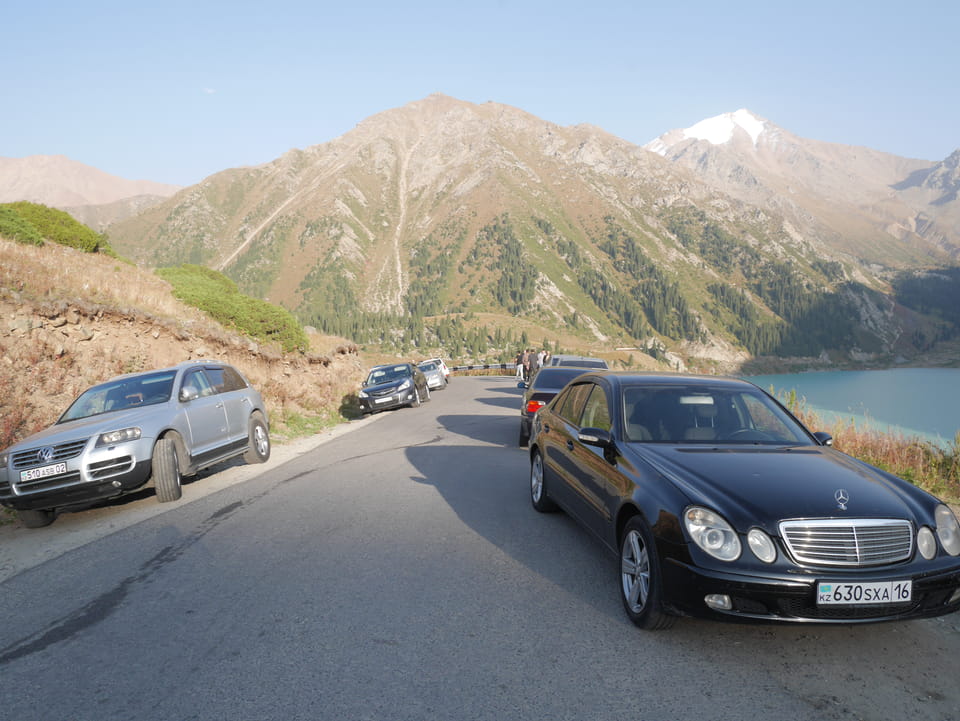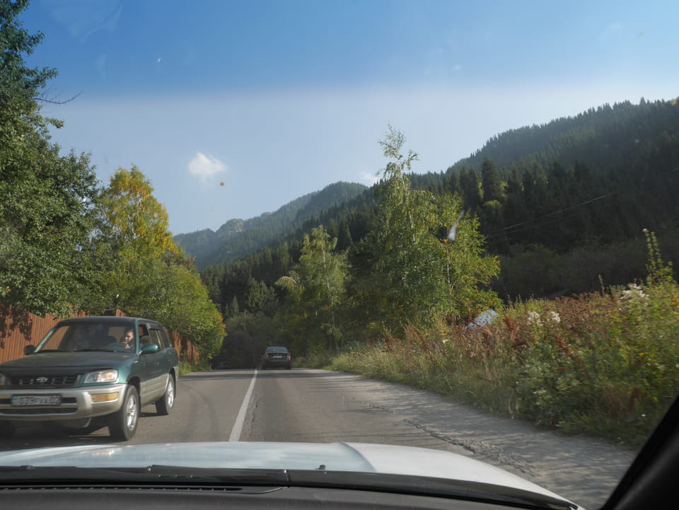 Seine Preisvorstellungen entsprangen der Fantasie. Er wollte 4000T hin und 4000T zurück – also über €18 für den Round-Trip. Zwi junge Kasachinnen kamen hinzu und wollten auch dahin. Schnell wurden wir uns einig, zusammen das Taxi zu bezahlen. Eine sprach sehr gut Englisch. Die andere wollte nur nicht so viel zahlen und eher noch eine Station wandern. Ich dagegen wollte schnellstens los und nichts riskieren. Der Fahrer stimmte schließlich 2 x 3000T zu, wobei ich 3000T von meiner Seite vorschlug. Sie zahlten die Hinfahrt und wir kamen über eine schöne Bergstraße zum populären Ausflugsort umgeben von Bergen.