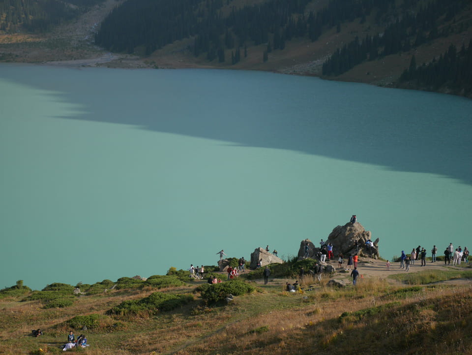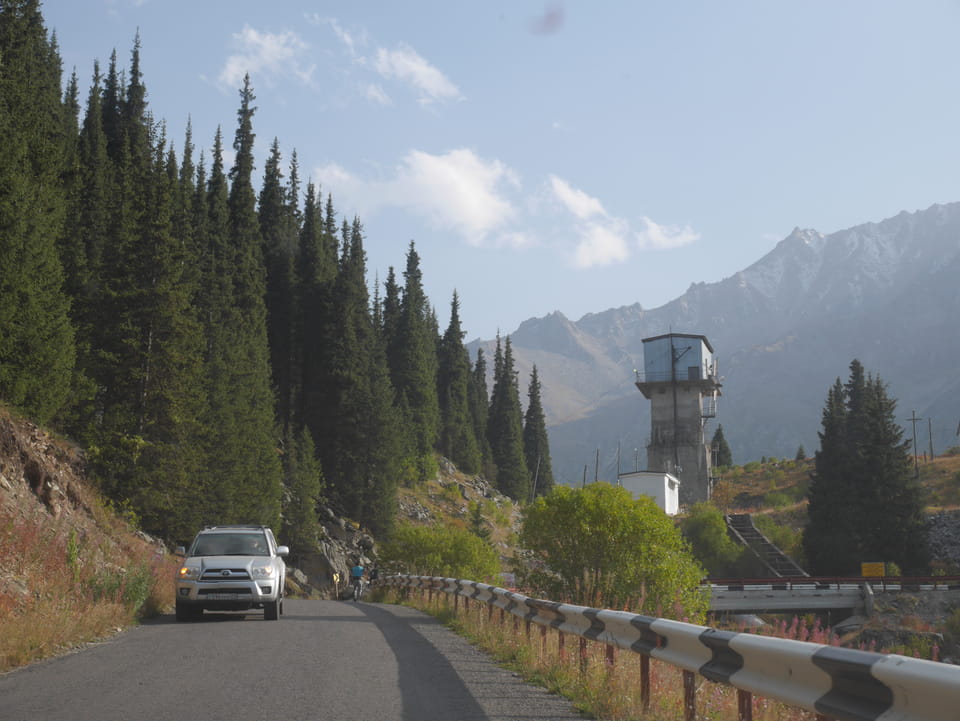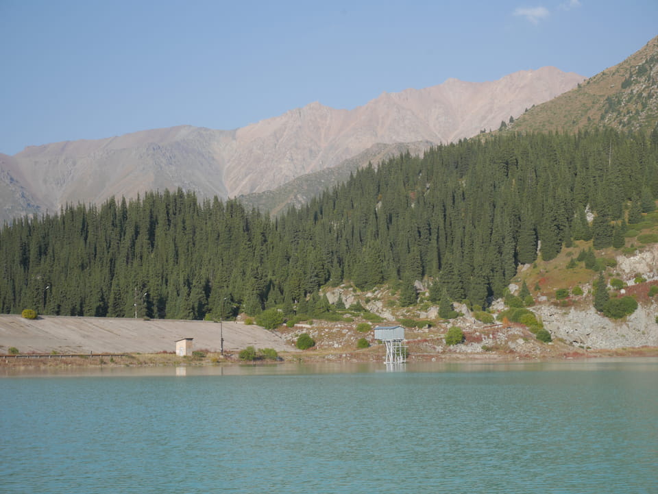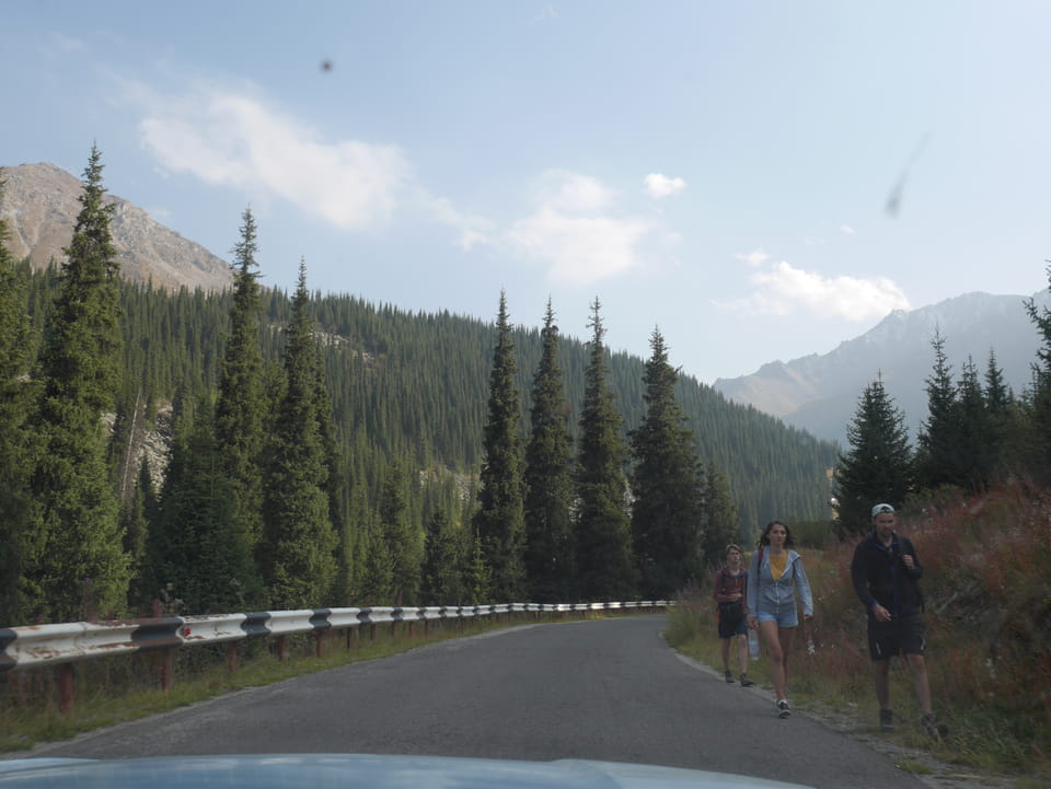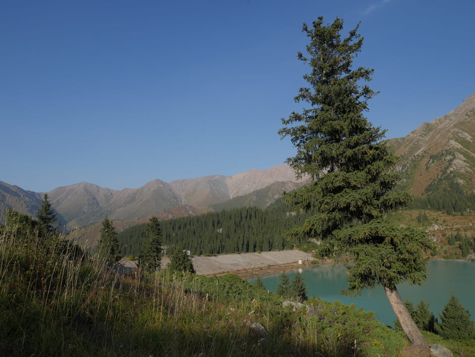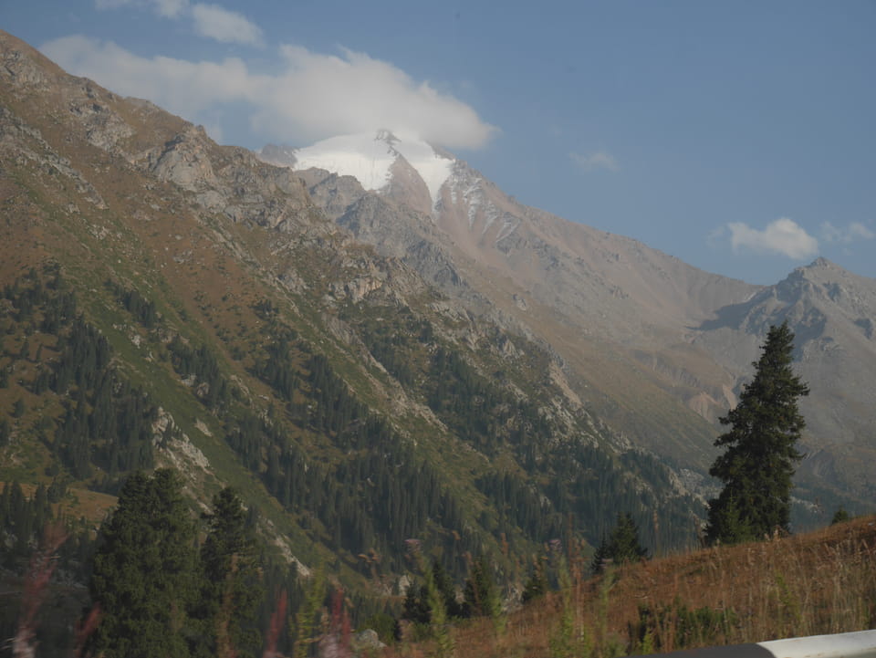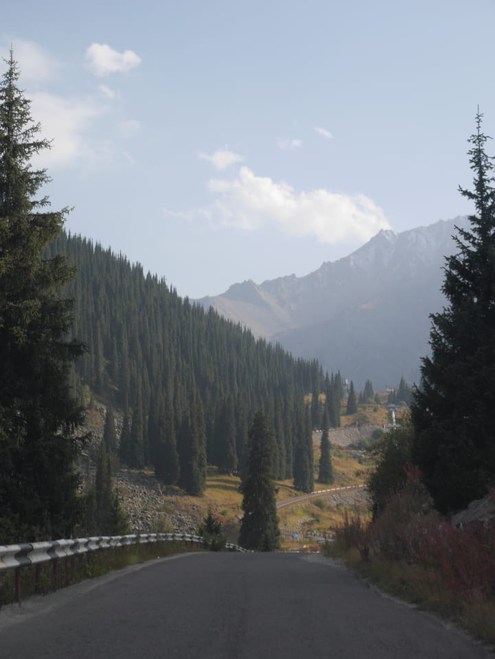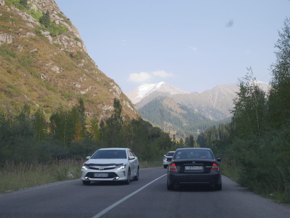 Seine Preisvorstellungen entsprangen der Fantasie. Er wollte 4000T hin und 4000T zurück – also über €18 für den Round-Trip. Zwi junge Kasachinnen kamen hinzu und wollten auch dahin. Schnell wurden wir uns einig, zusammen das Taxi zu bezahlen. Eine sprach sehr gut Englisch. Die andere wollte nur nicht so viel zahlen und eher noch eine Station wandern. Ich dagegen wollte schnellstens los und nichts riskieren. Der Fahrer stimmte schließlich 2 x 3000T zu, wobei ich 3000T von meiner Seite vorschlug. Sie zahlten die Hinfahrt und wir kamen über eine schöne Bergstraße zum populären Ausflugsort umgeben von Bergen.