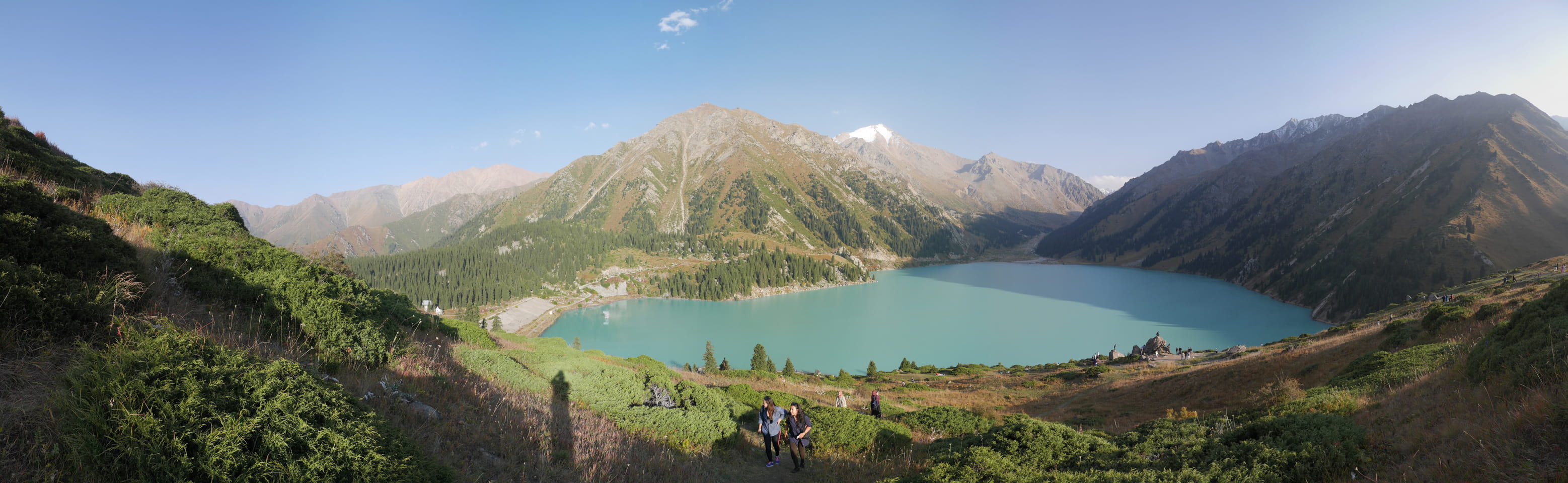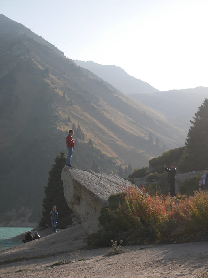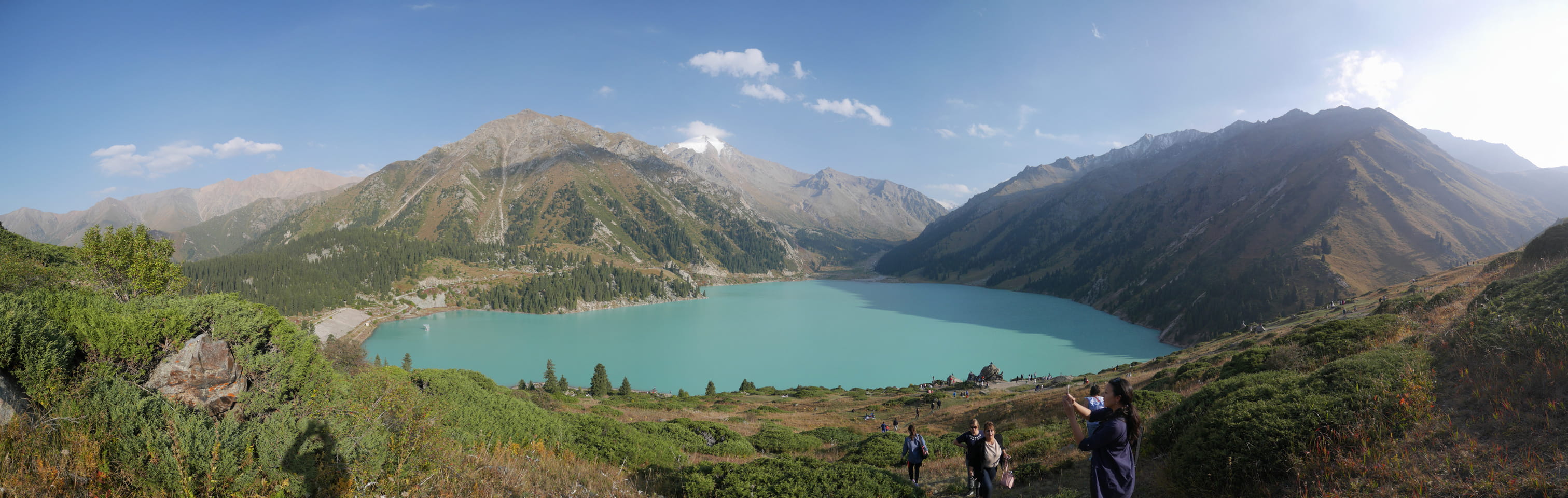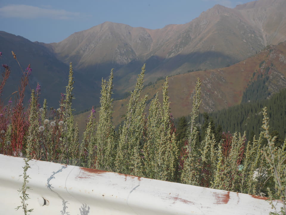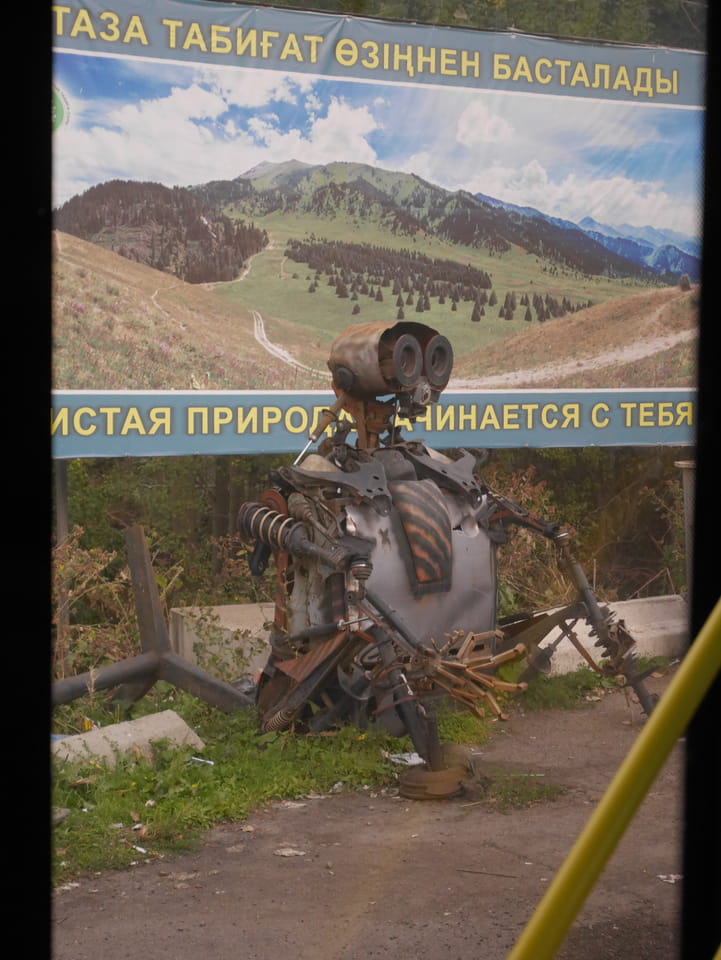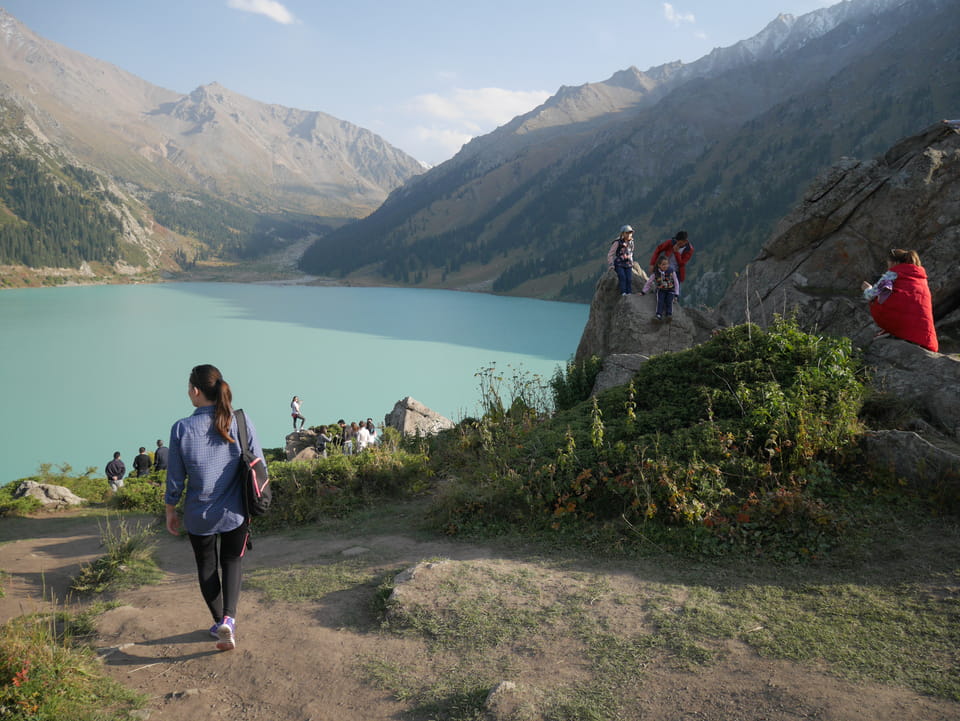 Seine Preisvorstellungen entsprangen der Fantasie. Er wollte 4000T hin und 4000T zurück – also über €18 für den Round-Trip. Zwi junge Kasachinnen kamen hinzu und wollten auch dahin. Schnell wurden wir uns einig, zusammen das Taxi zu bezahlen. Eine sprach sehr gut Englisch. Die andere wollte nur nicht so viel zahlen und eher noch eine Station wandern. Ich dagegen wollte schnellstens los und nichts riskieren. Der Fahrer stimmte schließlich 2 x 3000T zu, wobei ich 3000T von meiner Seite vorschlug. Sie zahlten die Hinfahrt und wir kamen über eine schöne Bergstraße zum populären Ausflugsort umgeben von Bergen.