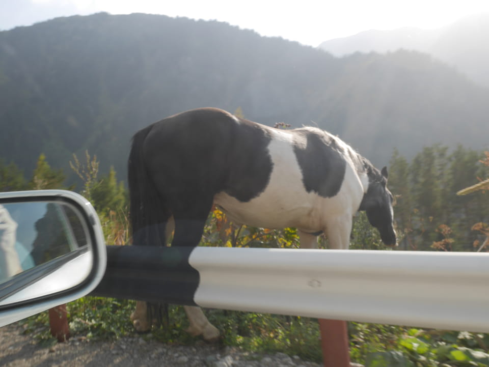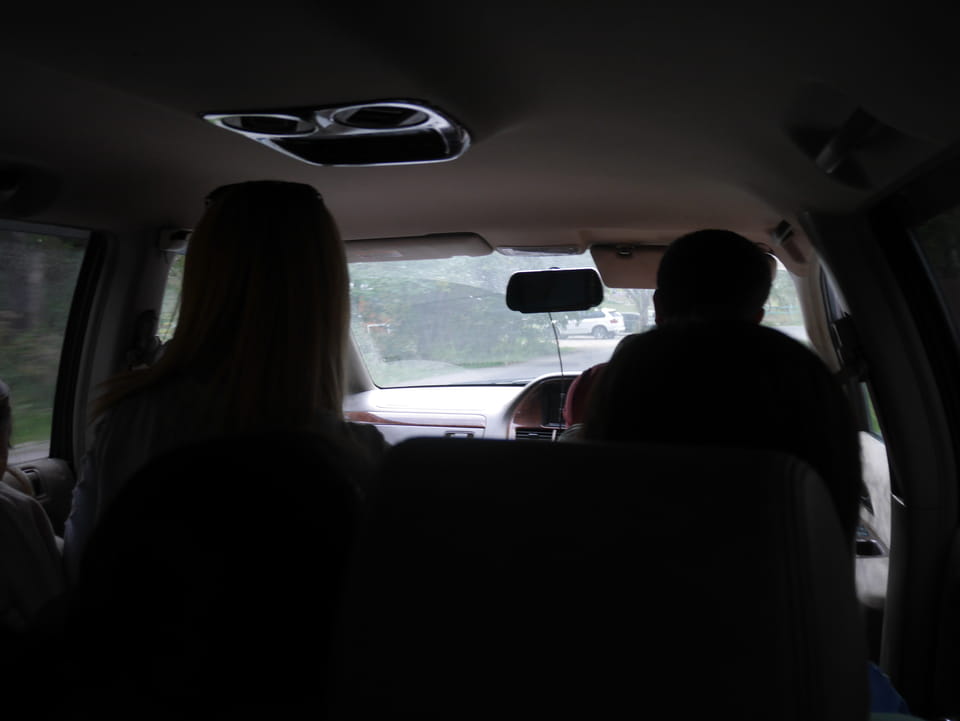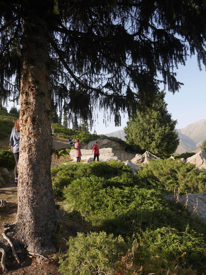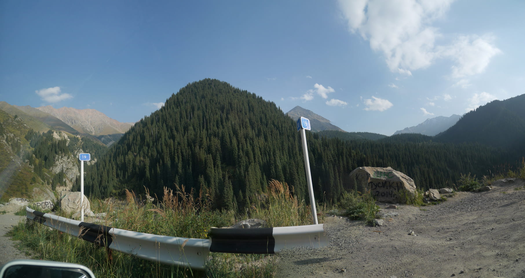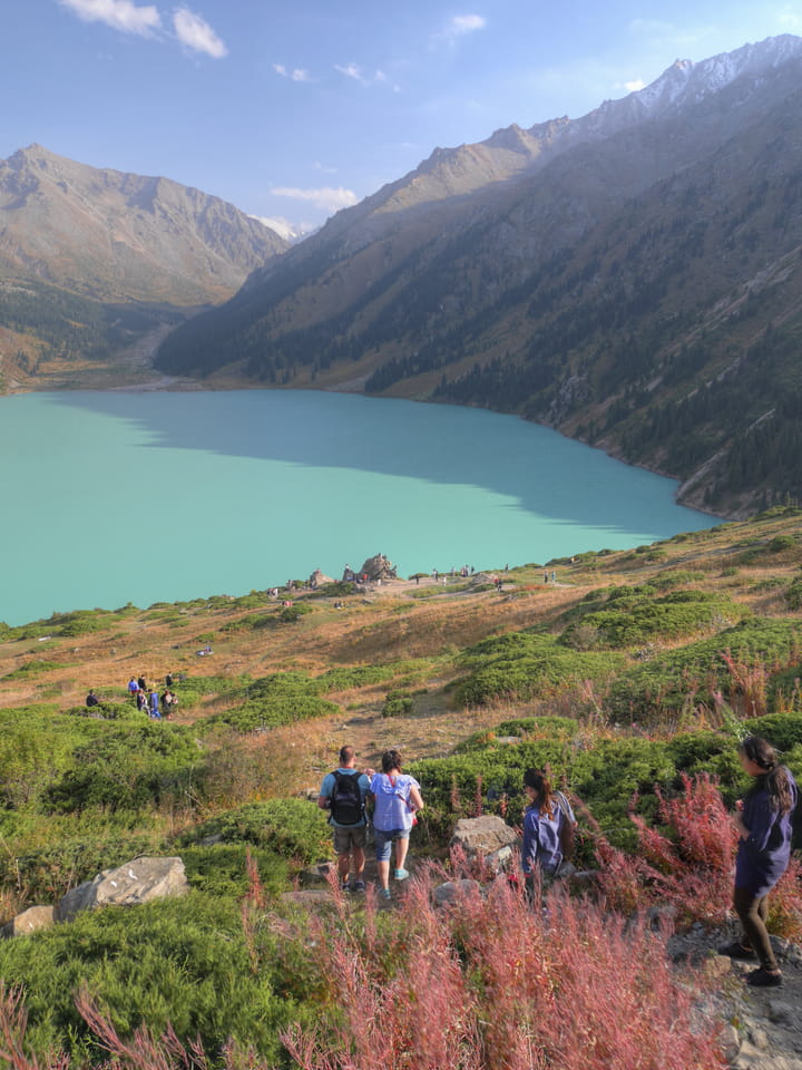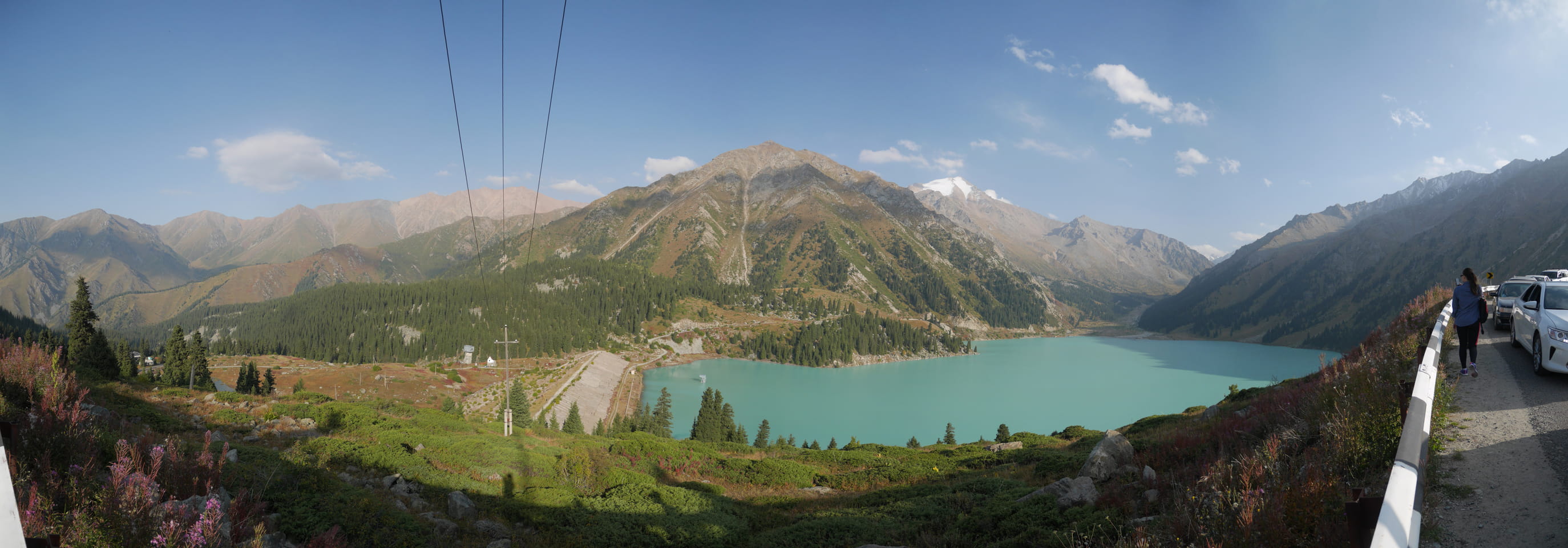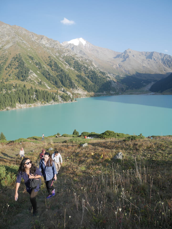 Seine Preisvorstellungen entsprangen der Fantasie. Er wollte 4000T hin und 4000T zurück – also über €18 für den Round-Trip. Zwi junge Kasachinnen kamen hinzu und wollten auch dahin. Schnell wurden wir uns einig, zusammen das Taxi zu bezahlen. Eine sprach sehr gut Englisch. Die andere wollte nur nicht so viel zahlen und eher noch eine Station wandern. Ich dagegen wollte schnellstens los und nichts riskieren. Der Fahrer stimmte schließlich 2 x 3000T zu, wobei ich 3000T von meiner Seite vorschlug. Sie zahlten die Hinfahrt und wir kamen über eine schöne Bergstraße zum populären Ausflugsort umgeben von Bergen.