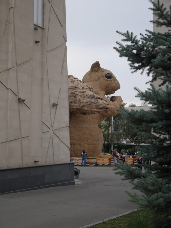 Es gibt hier in Almaty eine 12 Meter hohe Installation. Ein riesiges Eichhörnchen aus Holz und Stroh. Das einheimische Mädel gestern war darauf gar nicht gut zu sprechen, weil das Kunstwerk um die $67.000 kostete. „Korruption“, sagte sie.