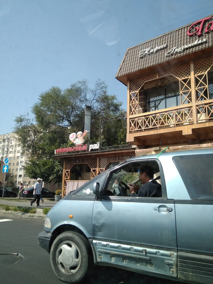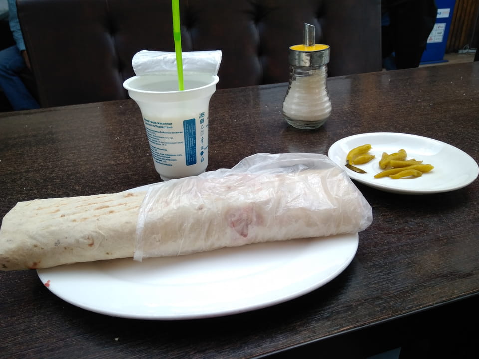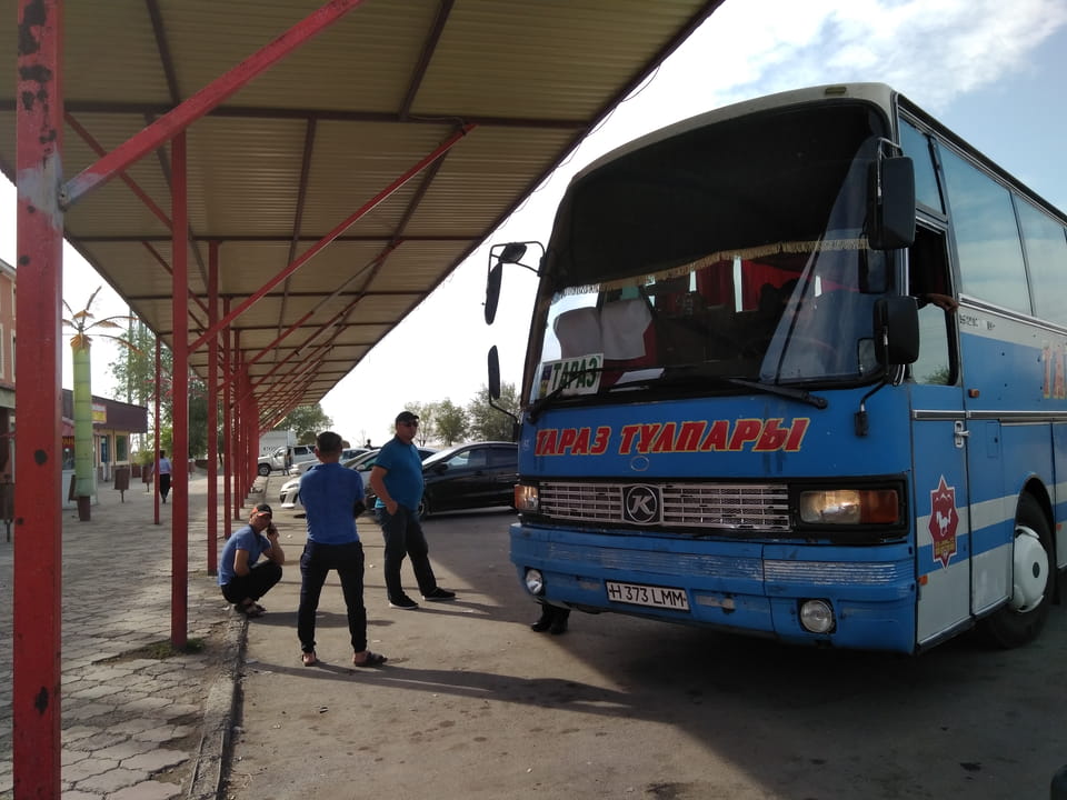 Ich ging dann los, aß nochmal einen Döner vor der langen Fahrt und kam mit dem Taxi (850 Tenge) zum Sairan Busbahnhof. Da fand ich schnell Anwerber für Bishkek. Ich solle aber kein Ticket kaufen, sondern einfach da mitfahren. Erst mal wollte ich aber meine restlichen Tenge in internationalere USD tauschen. Der Rest reichte nicht für $100 und das war mit meinem Russisch ein Problem, denn ich brauchte ja noch 1800 für das Bishkek Ticket. Am Ende tauschte man mir $90 und der Rest – ca. 3450 Tenge war später auch noch nützlich.