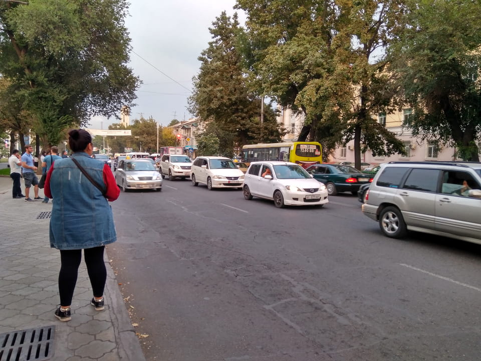Eine Frau vor mir bot mit ein Bonbon an. Wir redeten kurz mit meinem paar russischen Worten. Sie waren Uiguren. Ja, ich kannte die Geschichte mit China. Der Mann machte irgendwas, dass Deutschland wohl doch China bekämpfen solle oder so. Naja, richtig verstand ich das nicht. Die Frau half mir dann noch mehrfach, tauschte meine Tenge in Som um. Damit kam ich zu einer Marschrutka Richtung Zentrum (30 Som = €0,40). Ich bedankte mich, war etwas schnell weg aber gut.