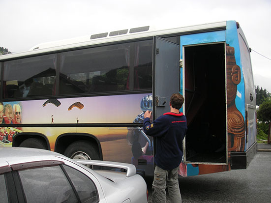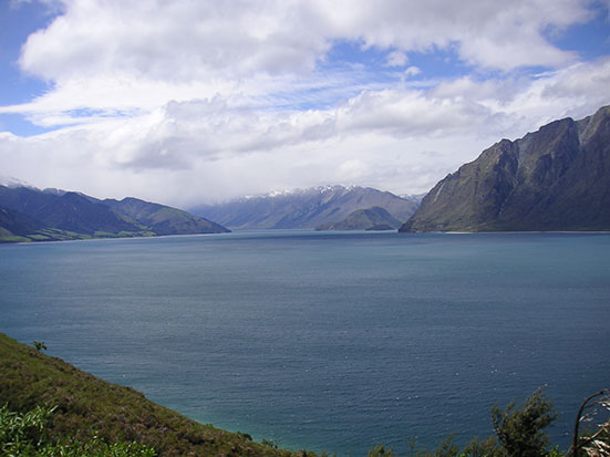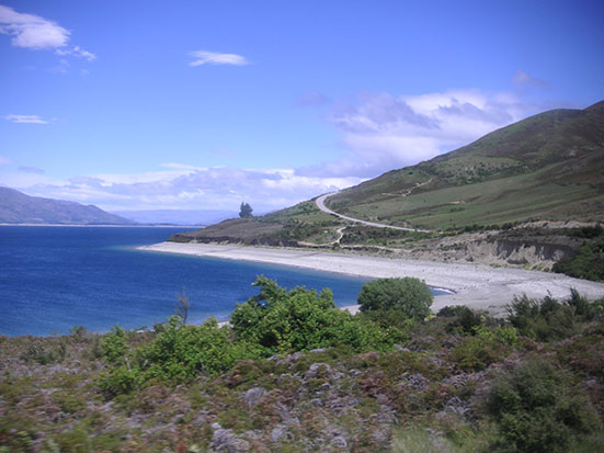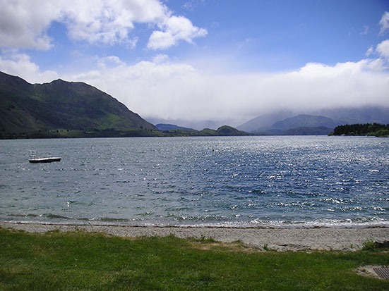 Wir fuhren so um die 8 km und wurden dann abgesetzt, wobei der Bus mit dem Rest der Truppe auftauchte. Gut durchgefroren ging es weiter und ein paar kleine Filmschnipsel der Aktion schaute ich mir im Bus an. Die anderen hatten schon Mittag gegessen und in Wanake hielten wir nochmal wo ich mein Lock im Magen mit bissel Pizza und Capucchino füllte. Die Gegend am Lake Wanaka ist wunderschön und bei inzwischen herrlichen Sonnenschein sah das alles traumhaft aus. An diesem See sollen einige der schönsten Fallschirmsprünge möglich sein.