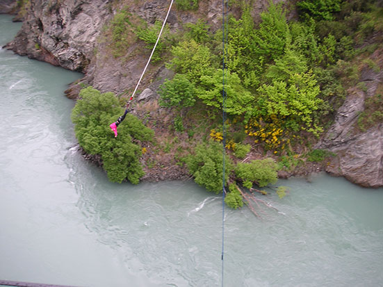 Dieser Bungie Shop ist jedenfalls mega-professionell organisiert. Man kann dort quasi im 2 Minutentakt springen, was auch passiert. Die Höhe war etwas mickrig – 43m über dem Fluss. In Antalya war das mindestens doppelt so hoch. Es gab 3 verschiedene Gewichtsklassen, doppelte Sicherheitschecks, Zuschauertribühne und Kameras für Video und Photos sind alle angebracht. Keinen Grund für Zweifel. Die machen das dort seit 1988 und der Erfinder (Hacket) hat noch 3 andere Sites hier in Queenstown. Naja, der Typ wollte also endlich springen. Wie das so ist: spontan wollte ich das auch! :-) Damit sollte das Warten nicht ganz umsonst sein. Kreditkarte gezückt und schon war ich dabei.