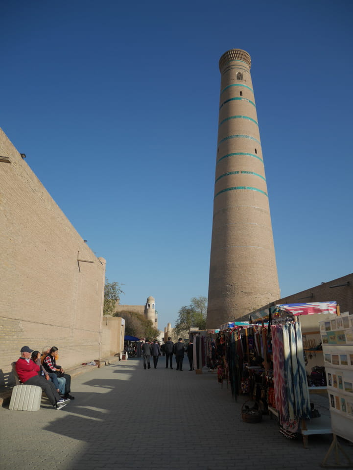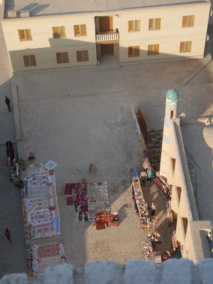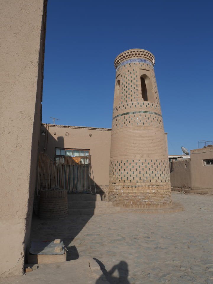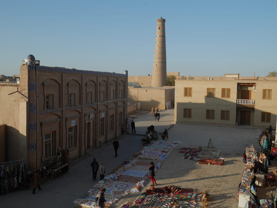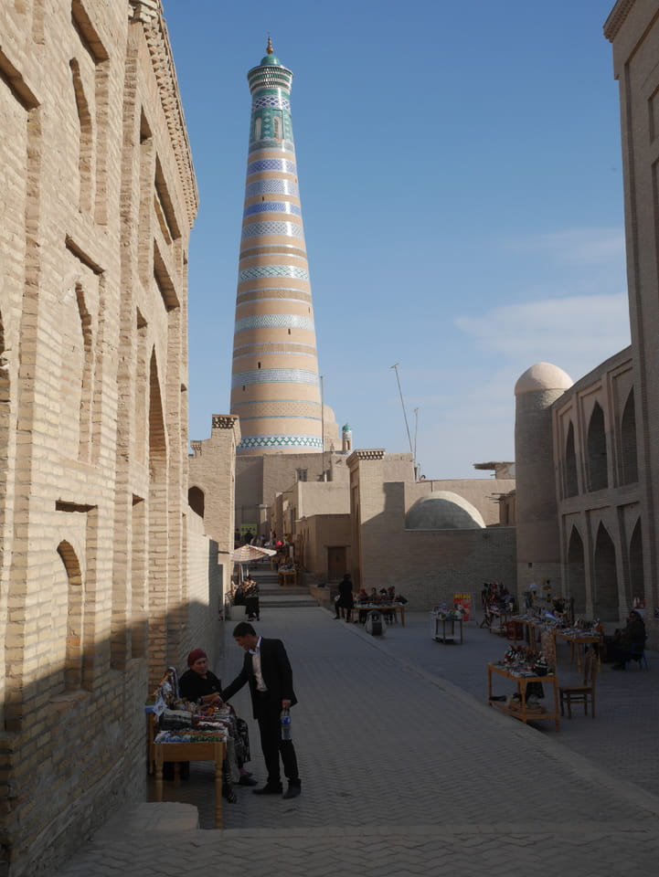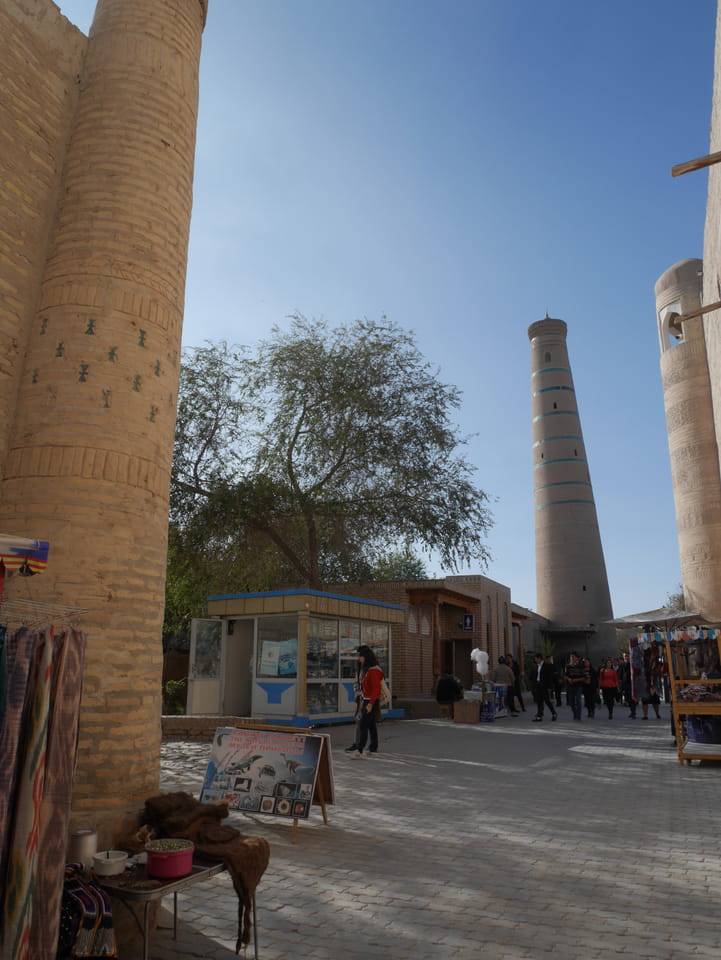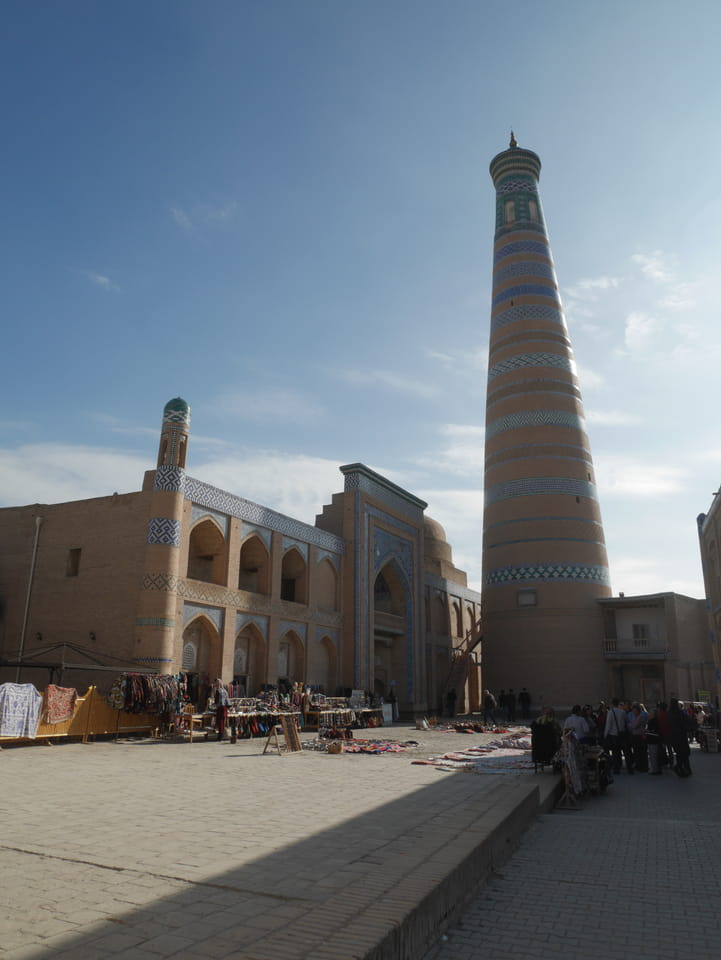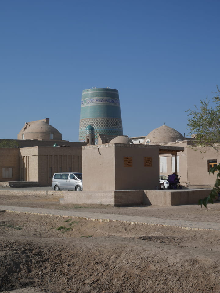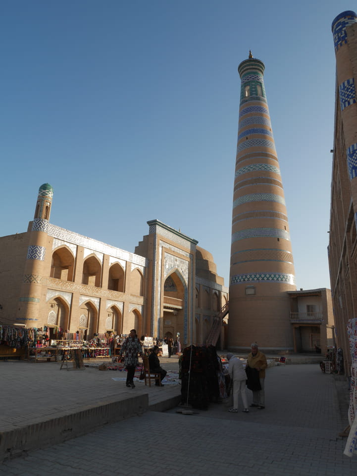Ich guckte bissel planlos herum, wollte Eintrittsgelder vermeiden. Die vielen hölzernen Träger in der Djuma Moschee waren teils aufwändig verziert. Das Islam Khoja Minaret dann aber war das Highlight heute, denn man konnte da hoch klettern. Eine Frau kassierte 100 Som ab (€1,10) wobei ich klar machte, da bis zu zwei Mal hochzukraxeln. Ich wollte später gegen Sonnenuntergang nochmal hoch.