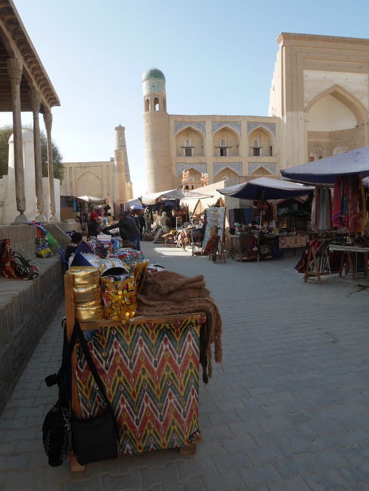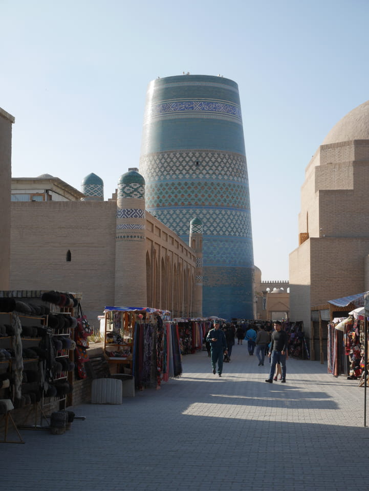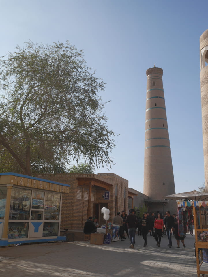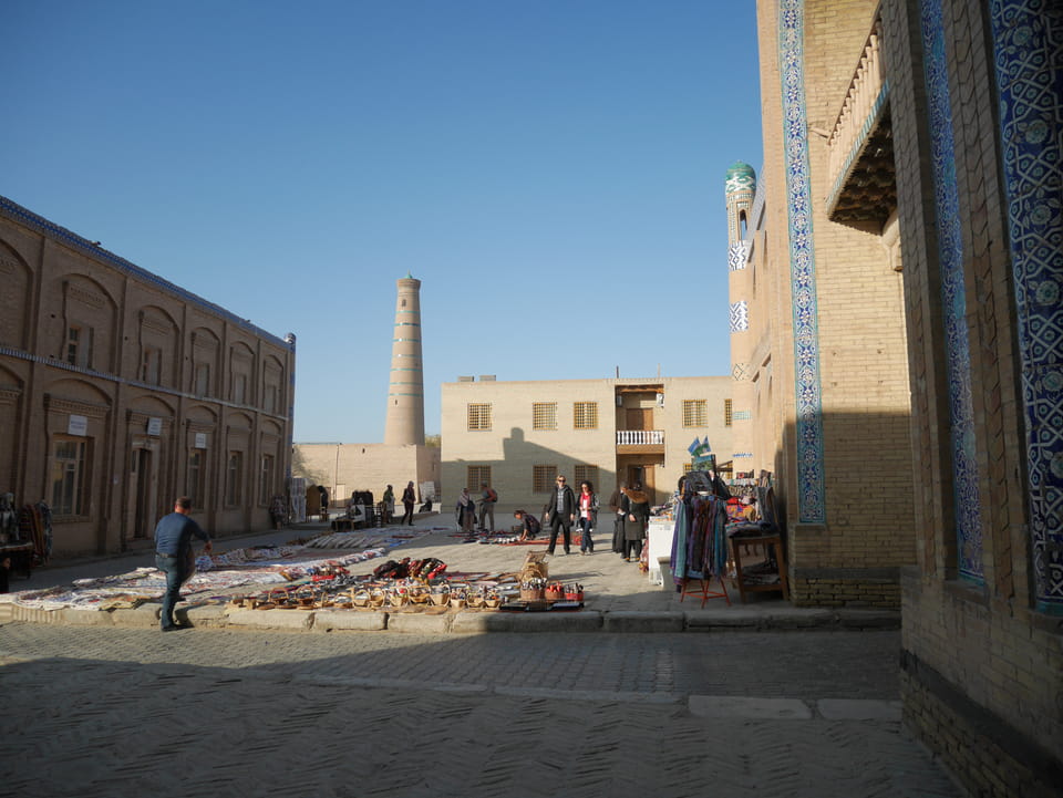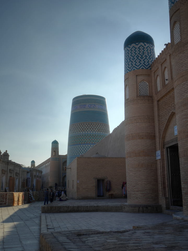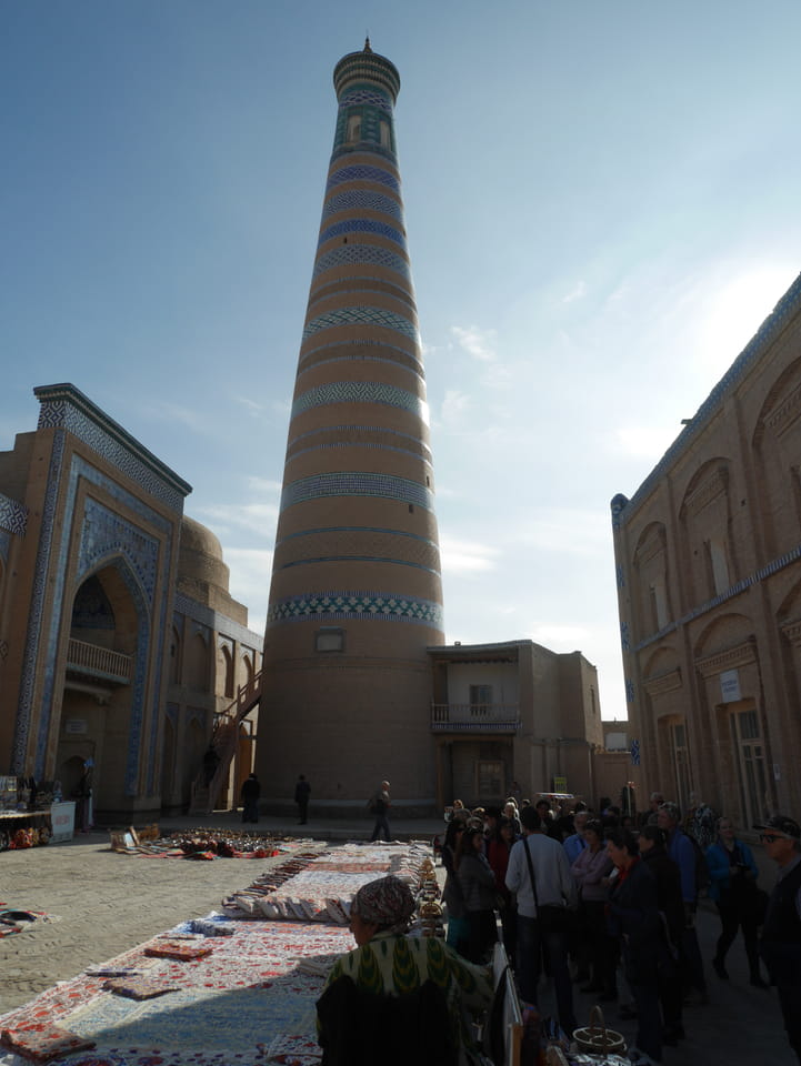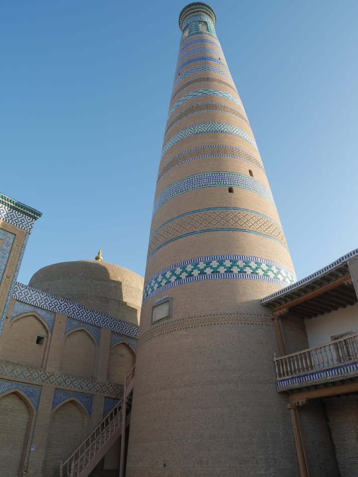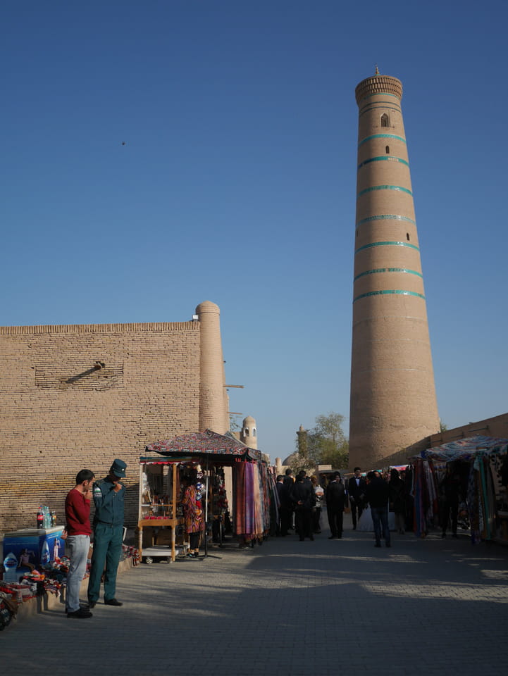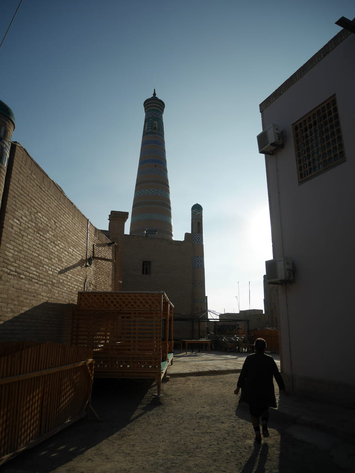 Ich guckte bissel planlos herum, wollte Eintrittsgelder vermeiden. Die vielen hölzernen Träger in der Djuma Moschee waren teils aufwändig verziert. Das Islam Khoja Minaret dann aber war das Highlight heute, denn man konnte da hoch klettern. Eine Frau kassierte 100 Som ab (€1,10) wobei ich klar machte, da bis zu zwei Mal hochzukraxeln. Ich wollte später gegen Sonnenuntergang nochmal hoch.