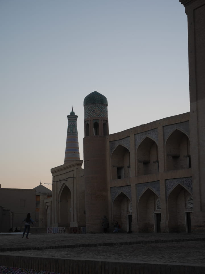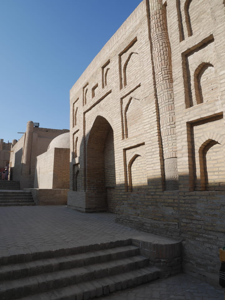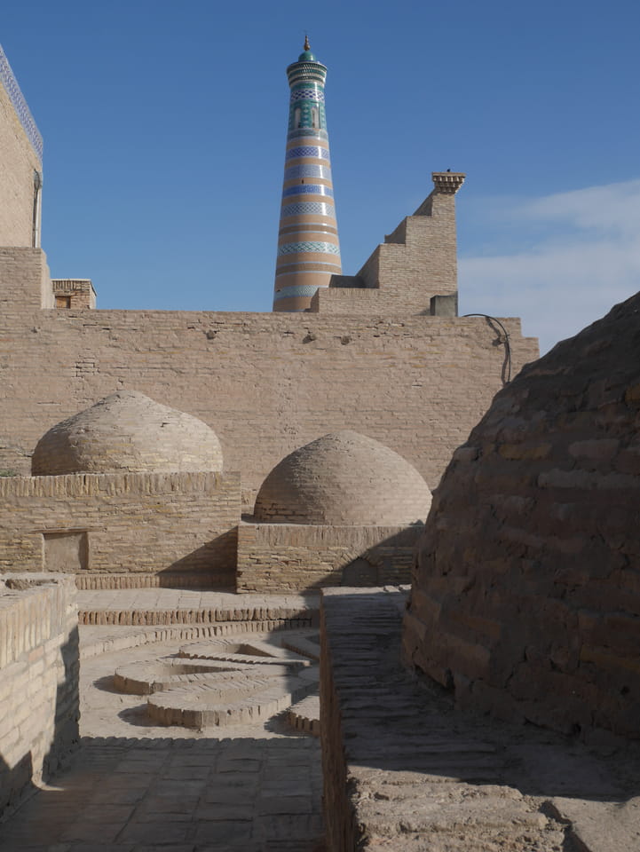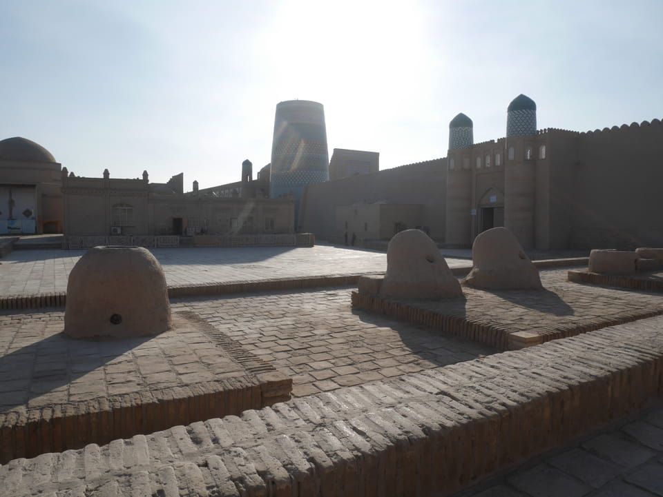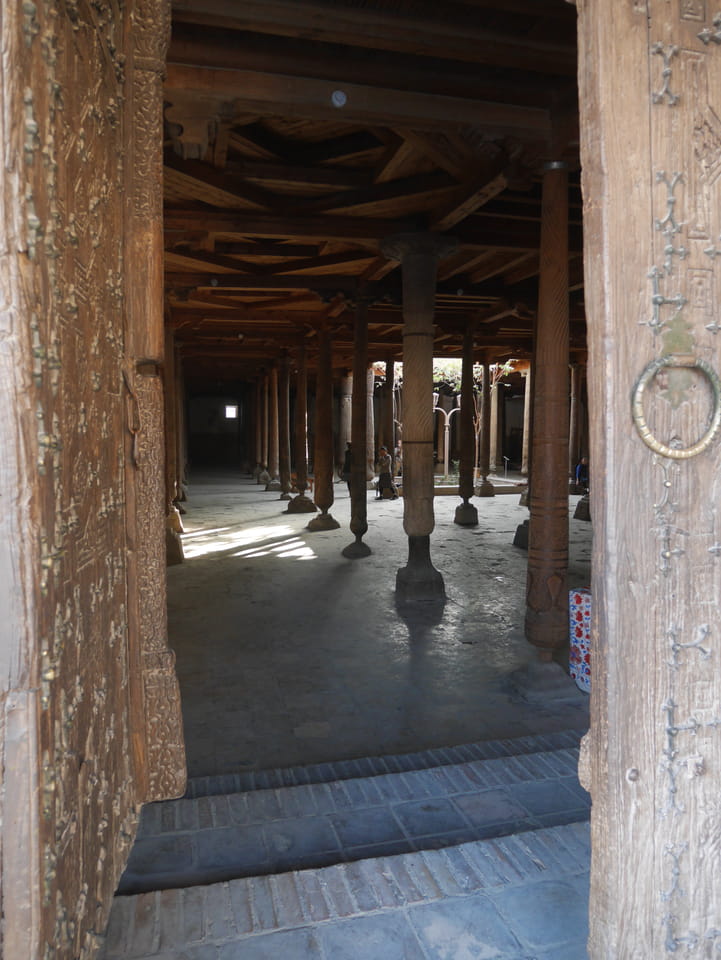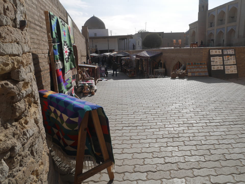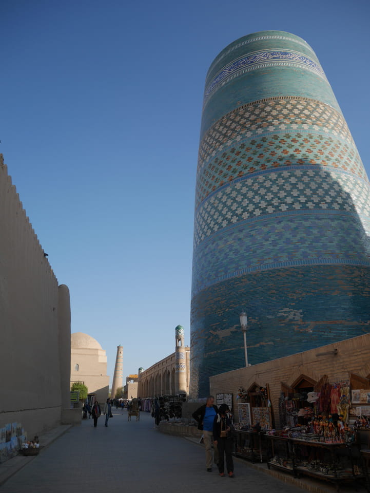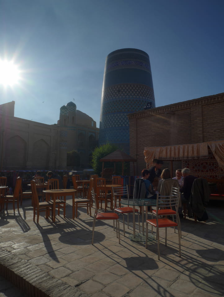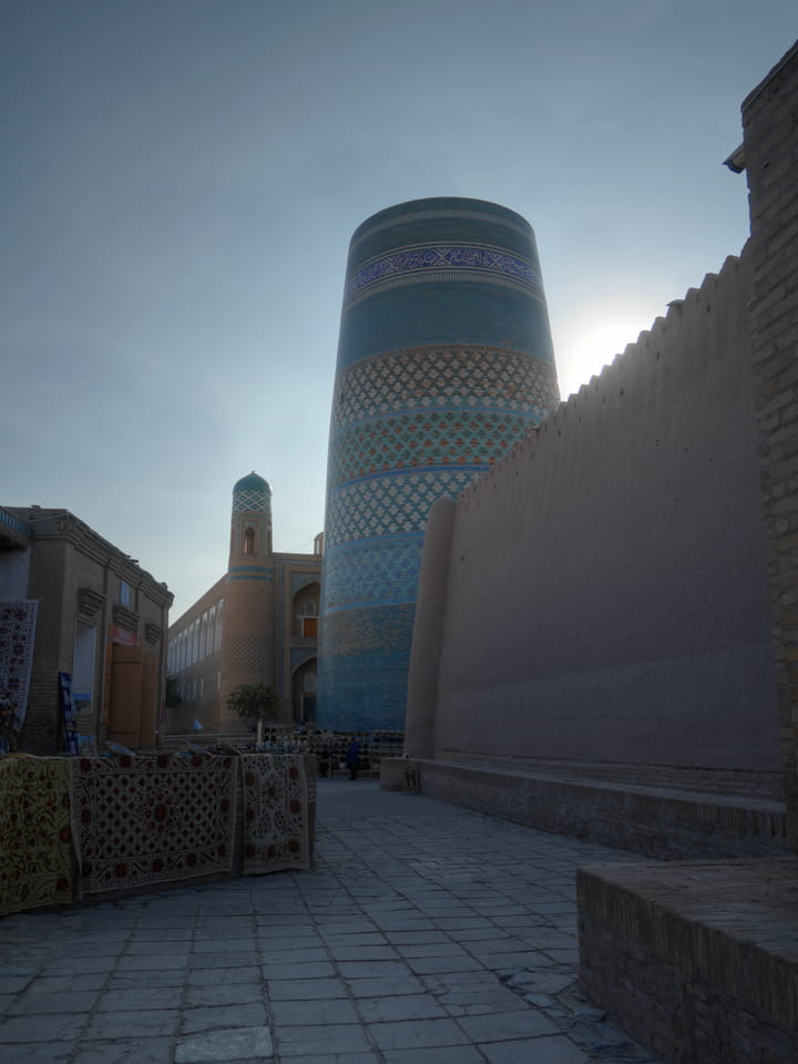 Ich guckte bissel planlos herum, wollte Eintrittsgelder vermeiden. Die vielen hölzernen Träger in der Djuma Moschee waren teils aufwändig verziert. Das Islam Khoja Minaret dann aber war das Highlight heute, denn man konnte da hoch klettern. Eine Frau kassierte 100 Som ab (€1,10) wobei ich klar machte, da bis zu zwei Mal hochzukraxeln. Ich wollte später gegen Sonnenuntergang nochmal hoch.