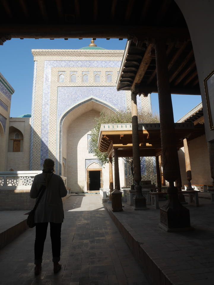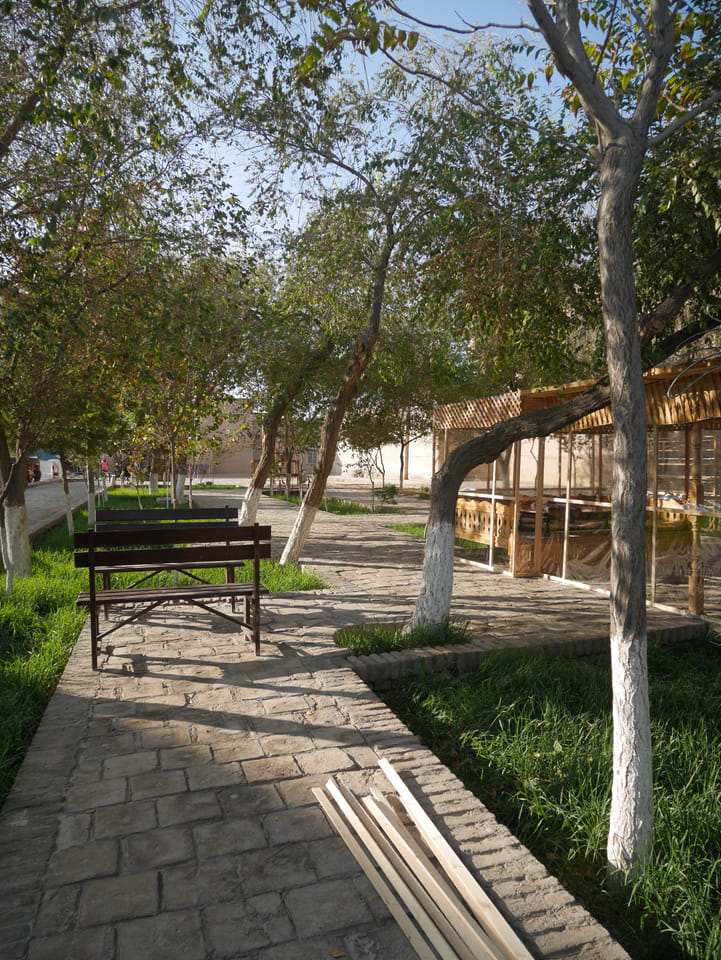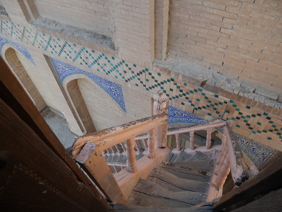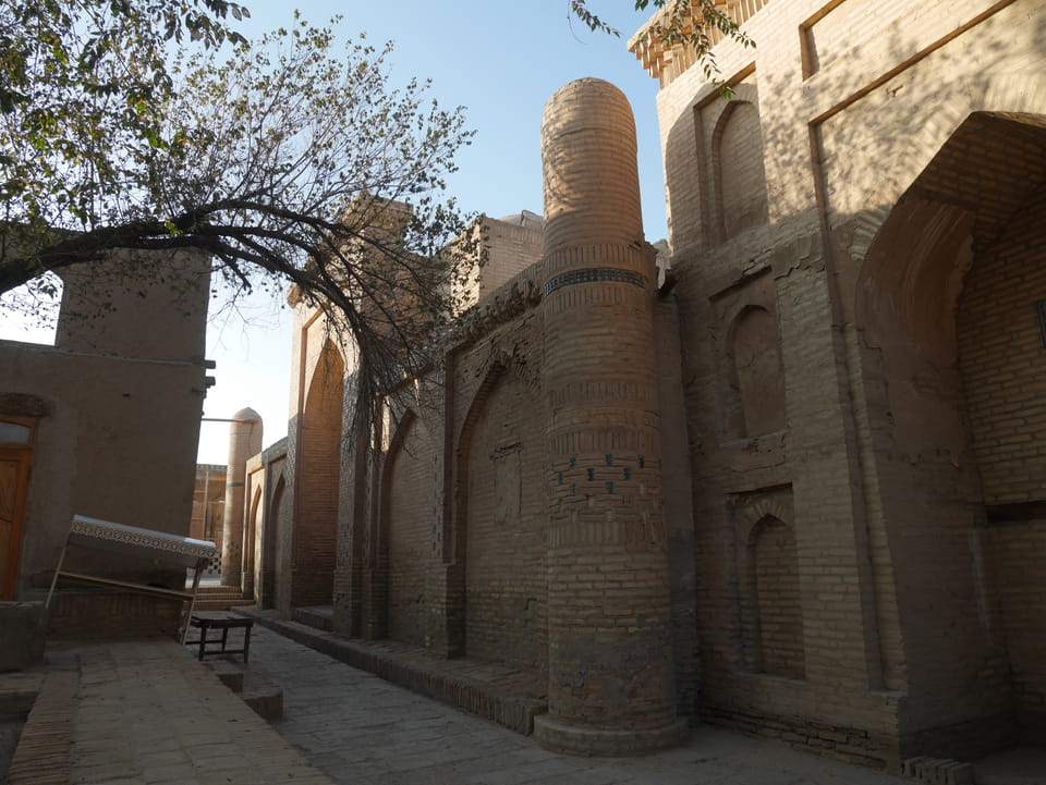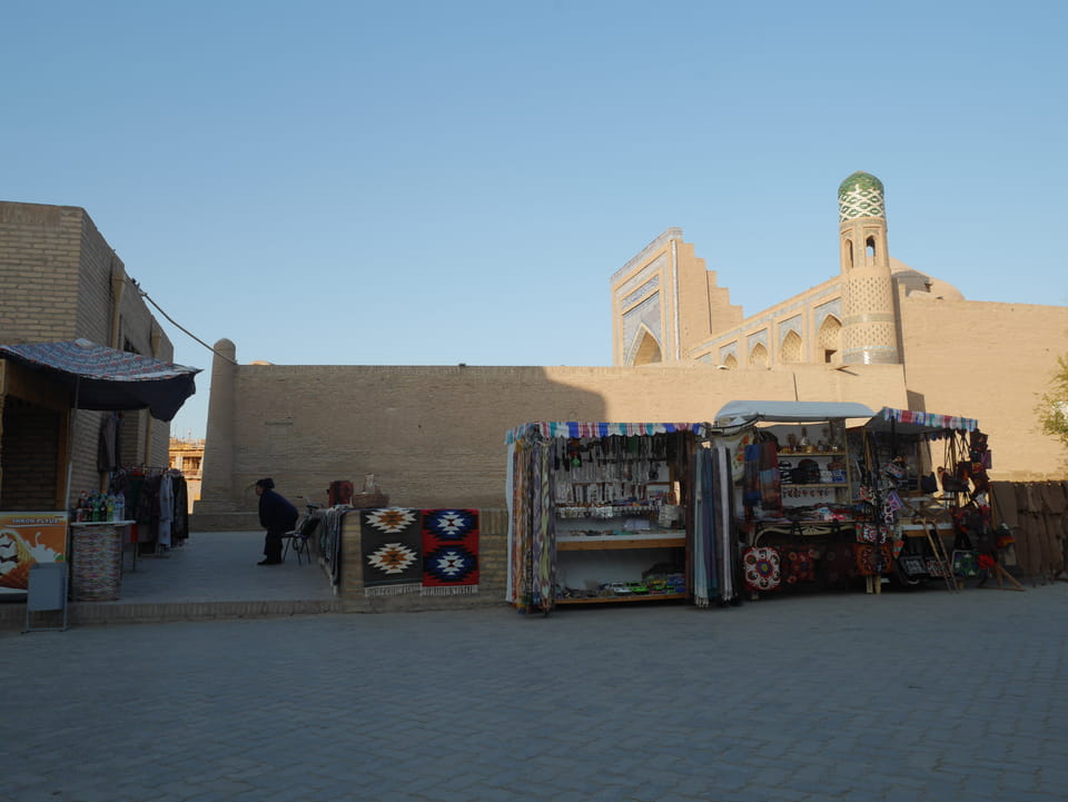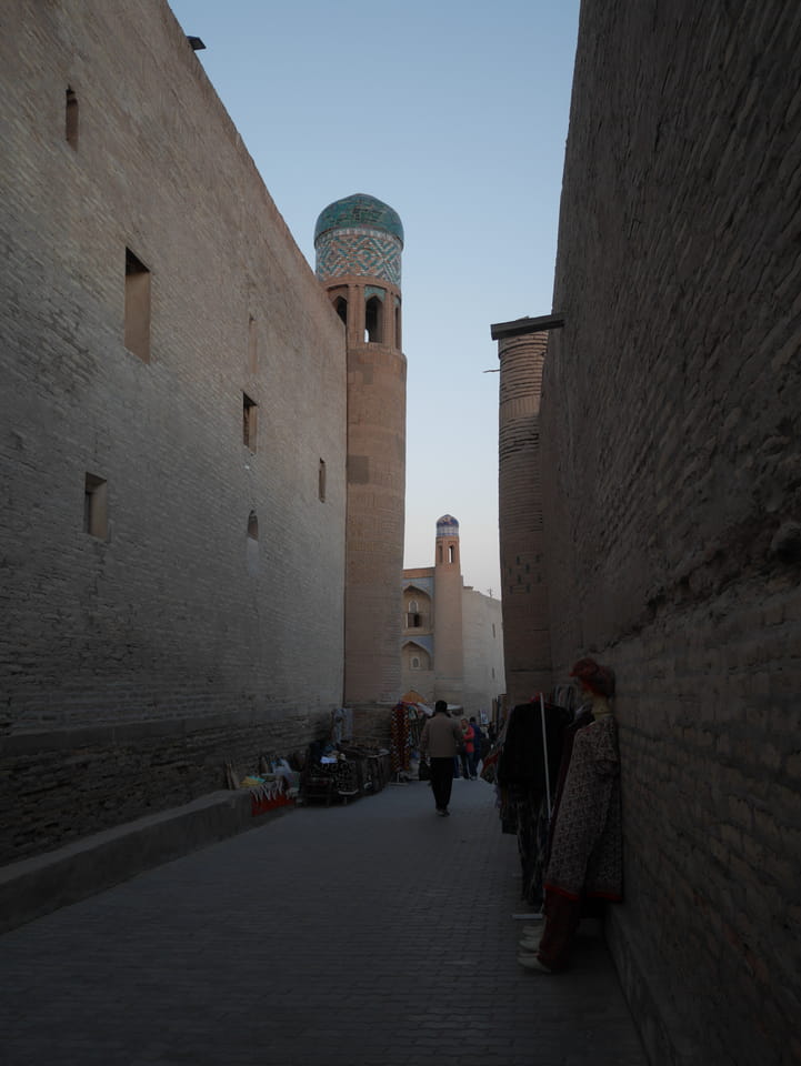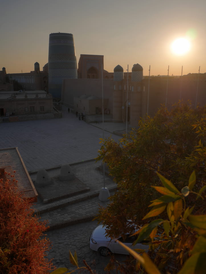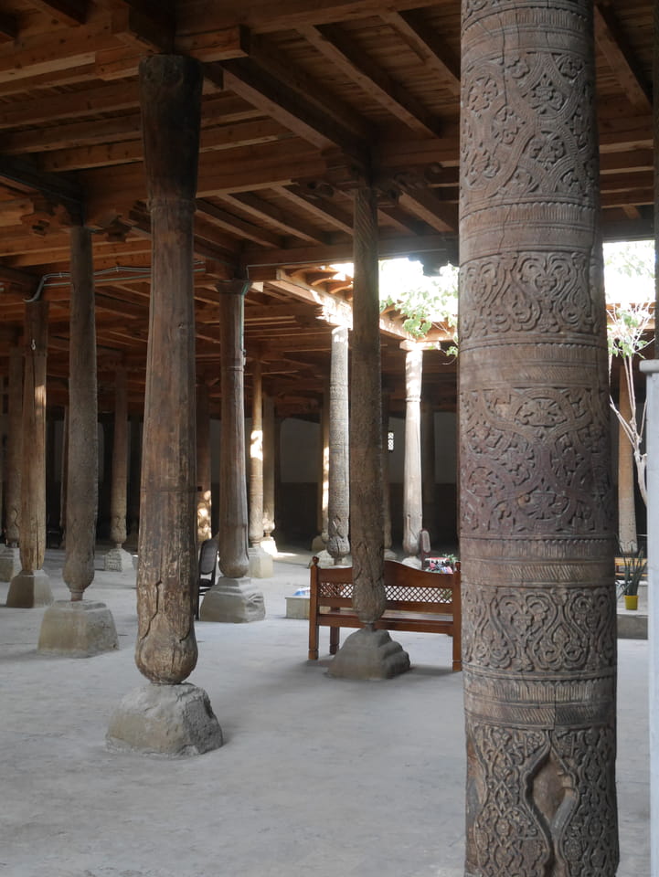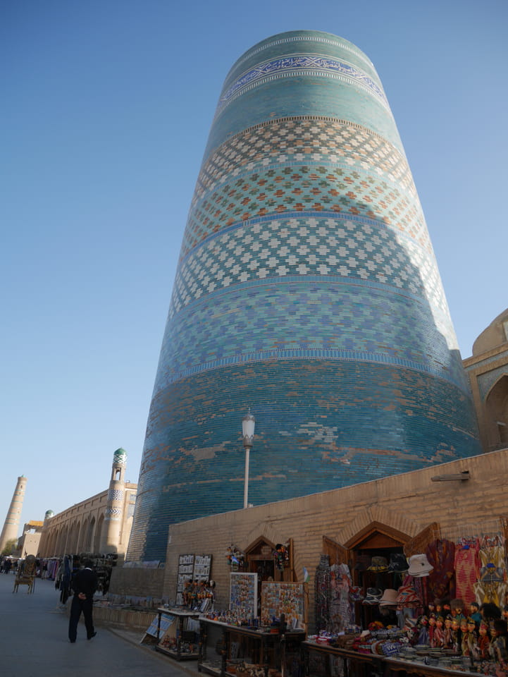 Ich guckte bissel planlos herum, wollte Eintrittsgelder vermeiden. Die vielen hölzernen Träger in der Djuma Moschee waren teils aufwändig verziert. Das Islam Khoja Minaret dann aber war das Highlight heute, denn man konnte da hoch klettern. Eine Frau kassierte 100 Som ab (€1,10) wobei ich klar machte, da bis zu zwei Mal hochzukraxeln. Ich wollte später gegen Sonnenuntergang nochmal hoch.