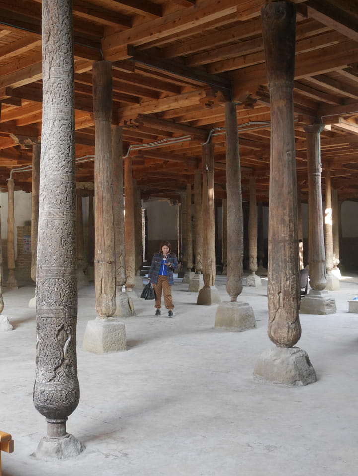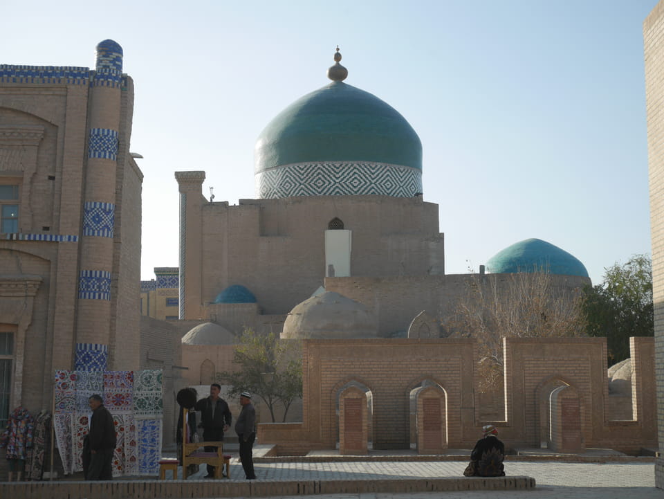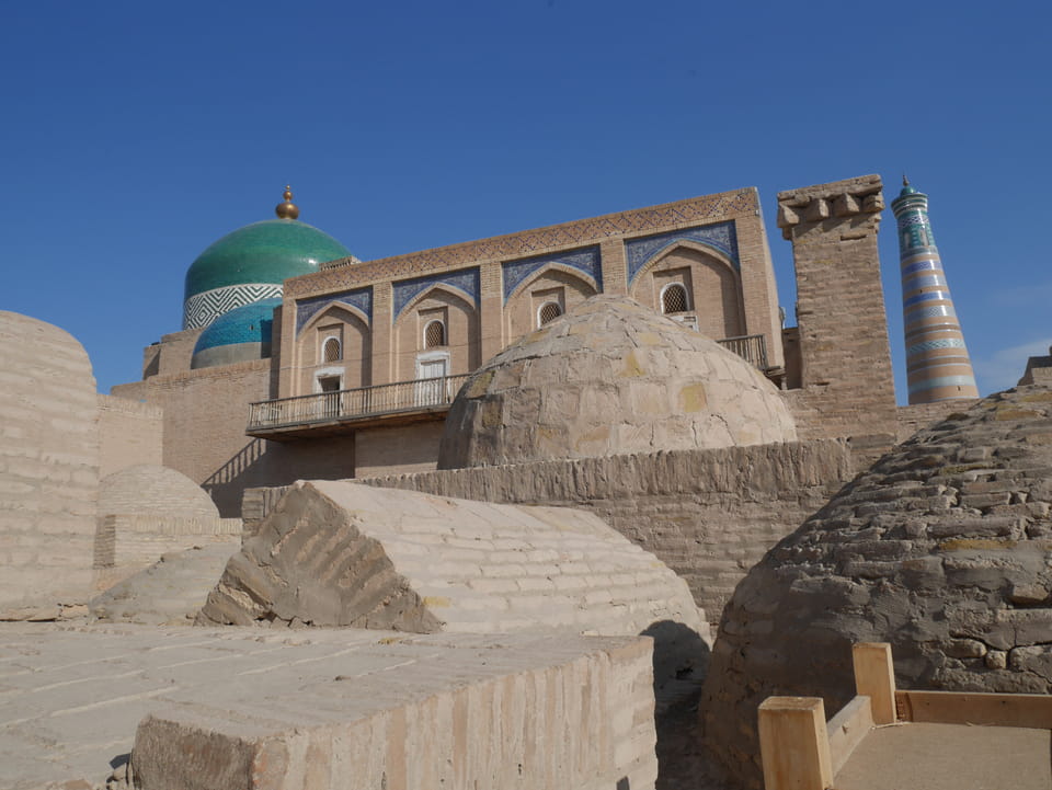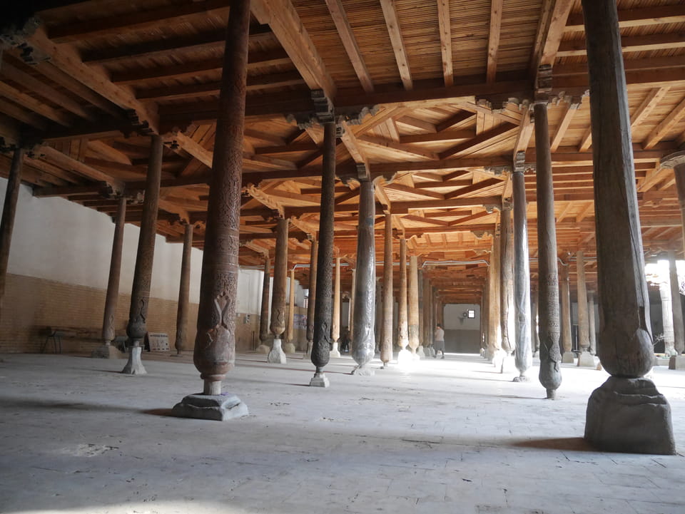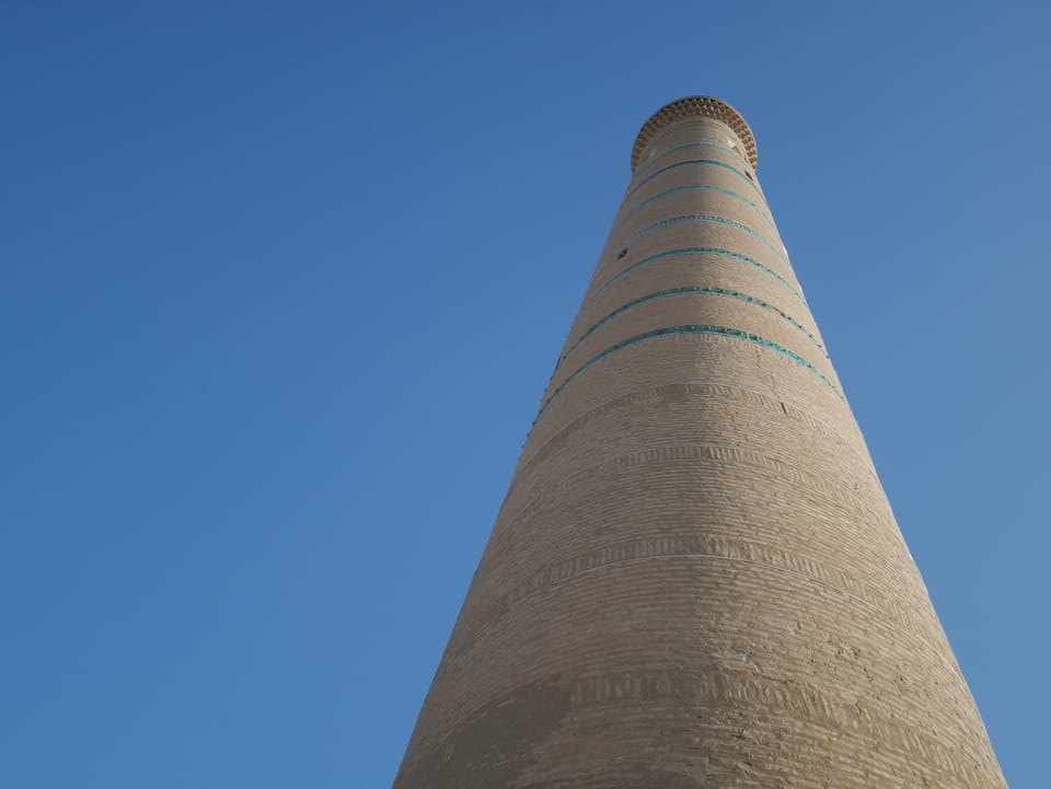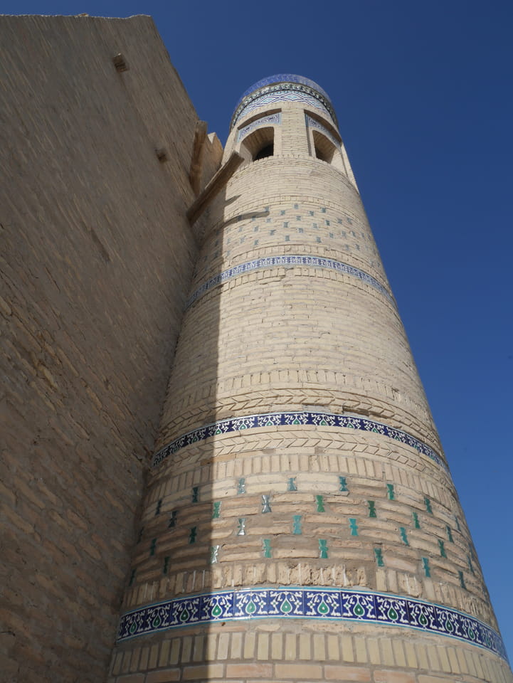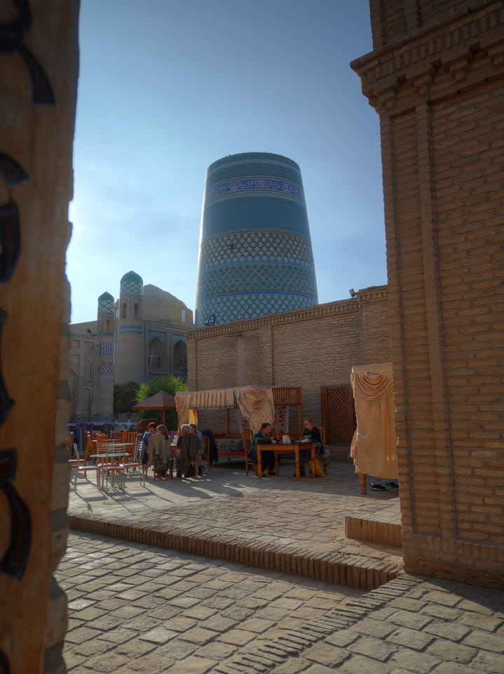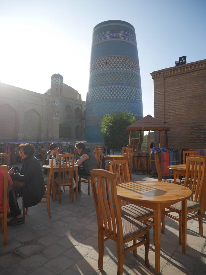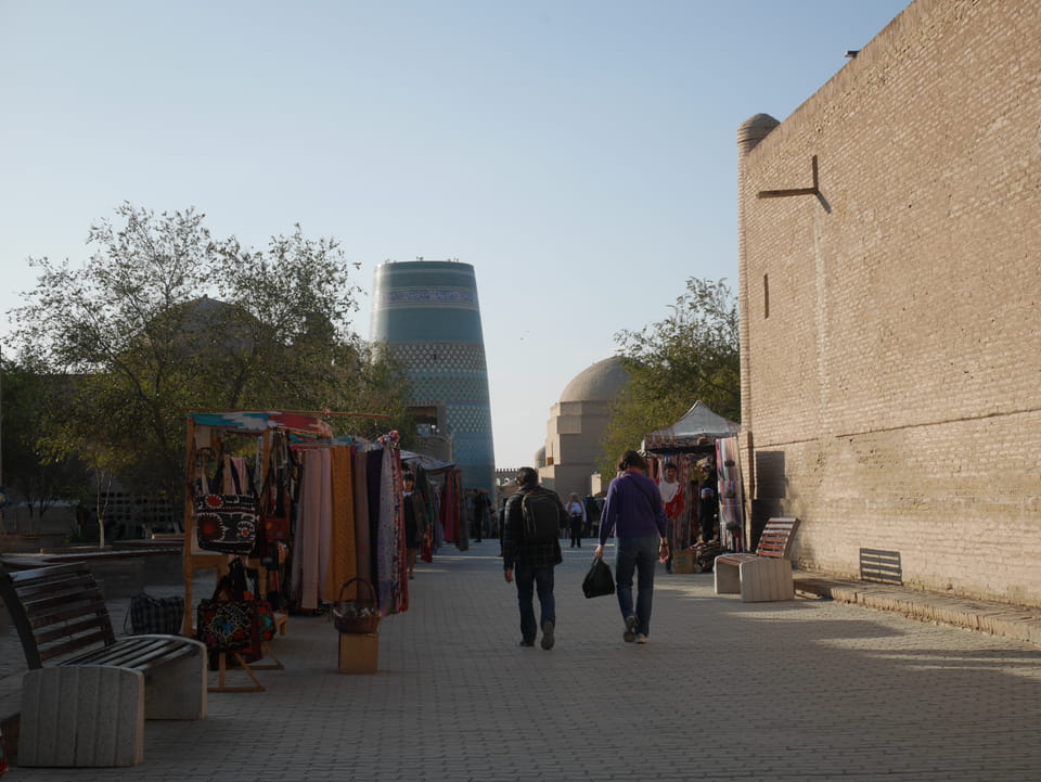 Ich guckte bissel planlos herum, wollte Eintrittsgelder vermeiden. Die vielen hölzernen Träger in der Djuma Moschee waren teils aufwändig verziert. Das Islam Khoja Minaret dann aber war das Highlight heute, denn man konnte da hoch klettern. Eine Frau kassierte 100 Som ab (€1,10) wobei ich klar machte, da bis zu zwei Mal hochzukraxeln. Ich wollte später gegen Sonnenuntergang nochmal hoch.