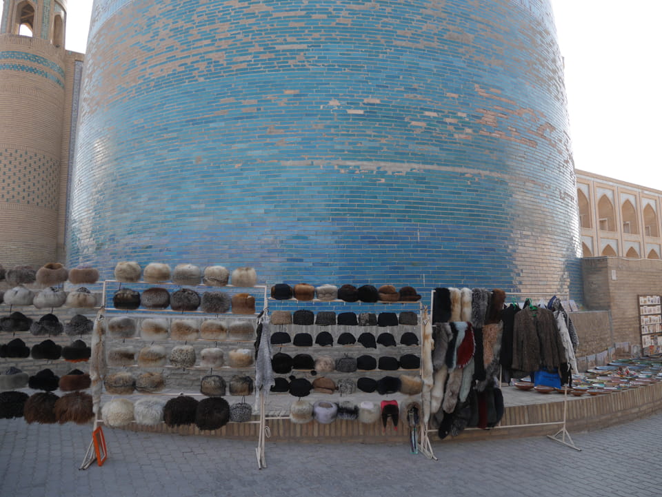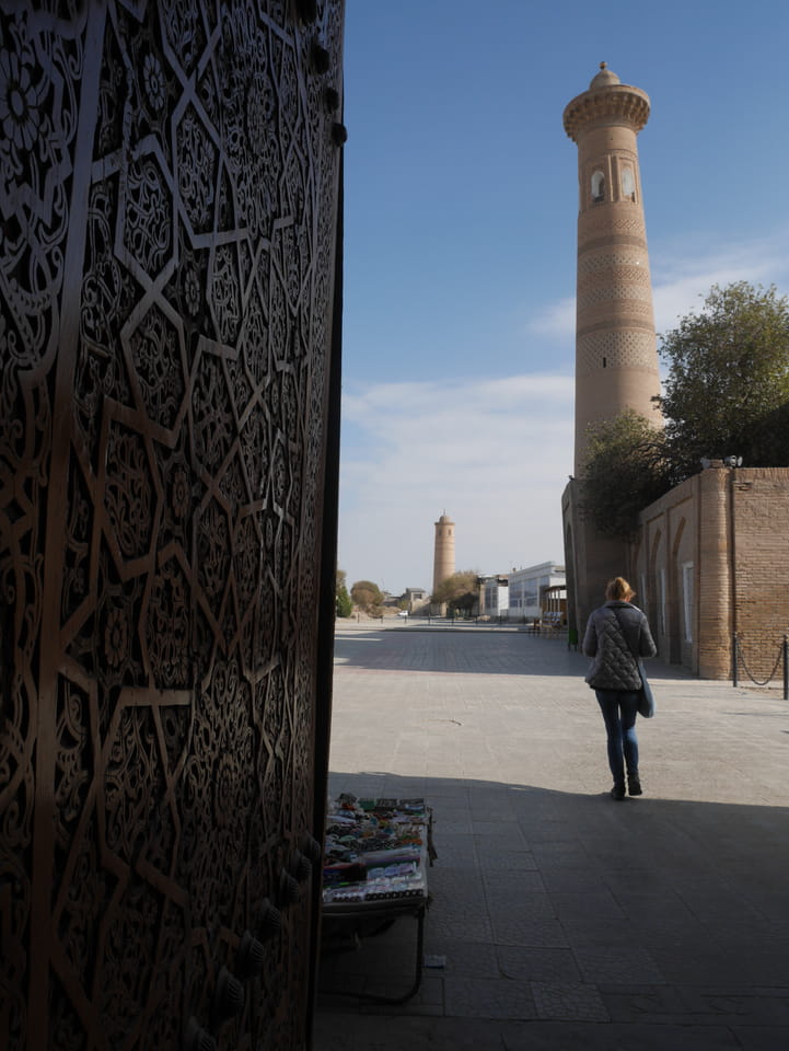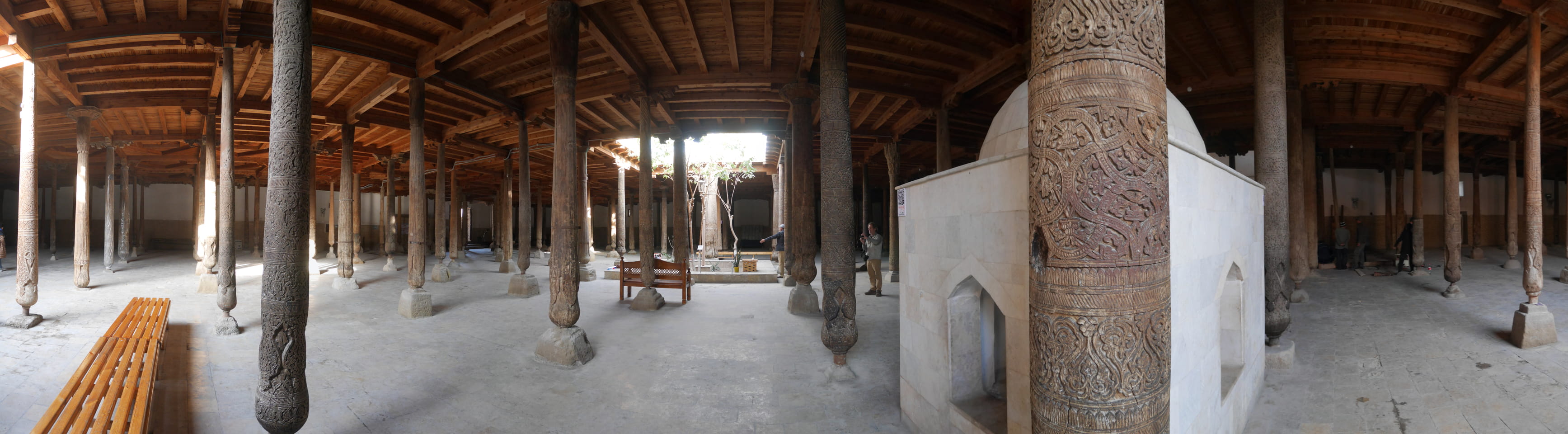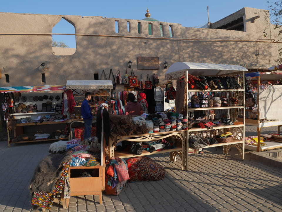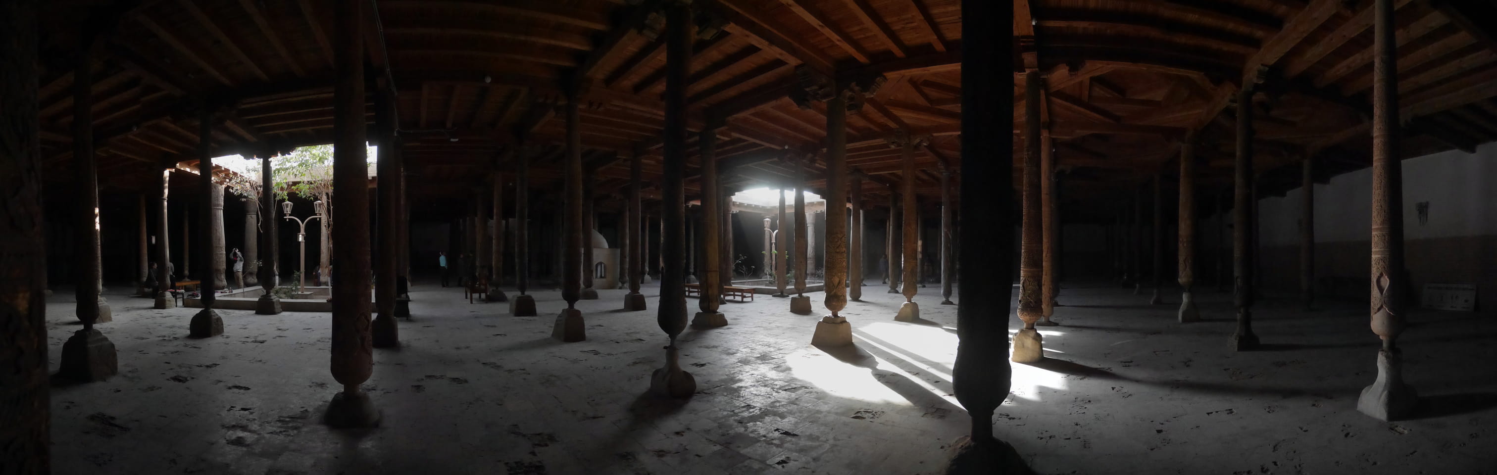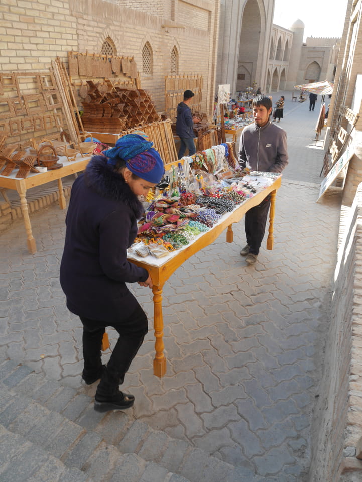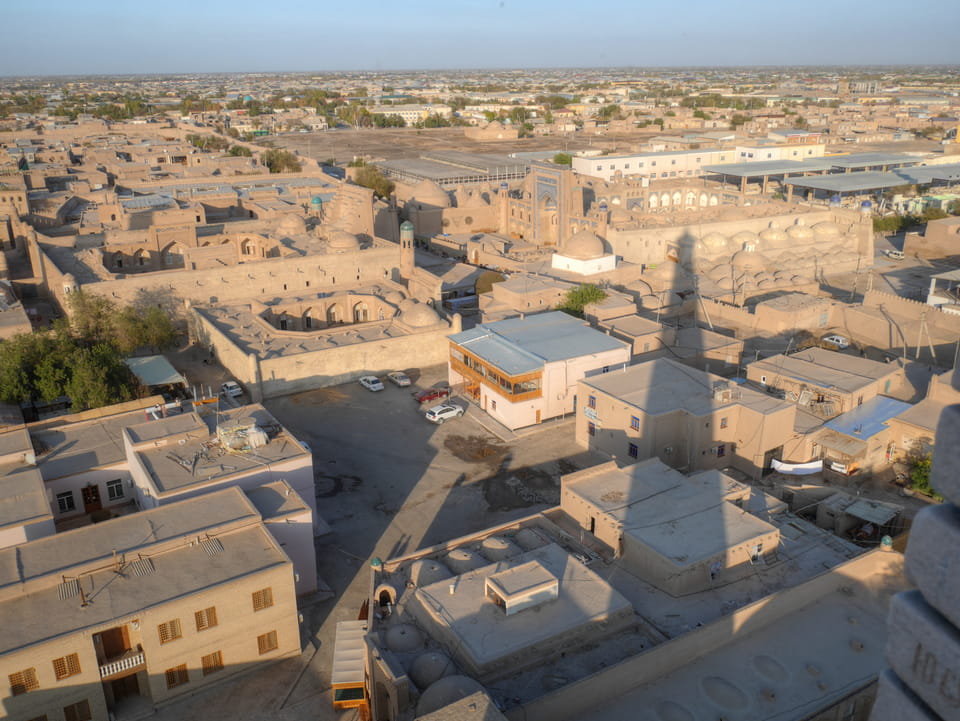 Ich guckte bissel planlos herum, wollte Eintrittsgelder vermeiden. Die vielen hölzernen Träger in der Djuma Moschee waren teils aufwändig verziert. Das Islam Khoja Minaret dann aber war das Highlight heute, denn man konnte da hoch klettern. Eine Frau kassierte 100 Som ab (€1,10) wobei ich klar machte, da bis zu zwei Mal hochzukraxeln. Ich wollte später gegen Sonnenuntergang nochmal hoch.
